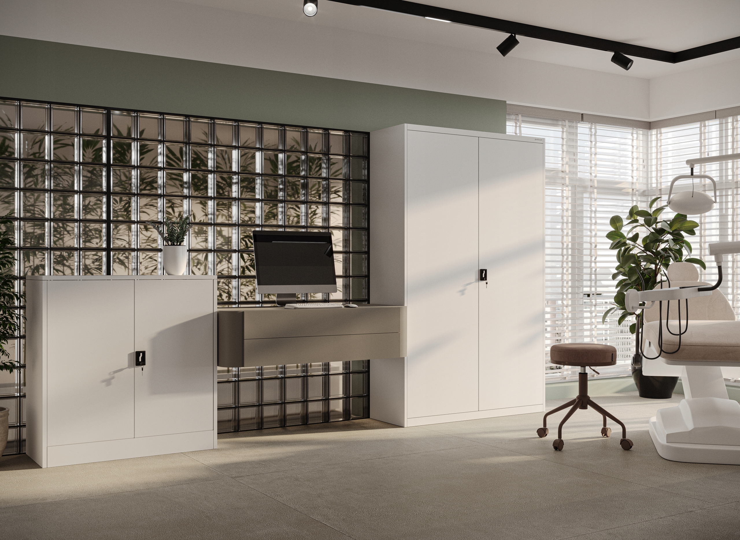 В таких помещениях, как офисы, кабинеты и мастерские, лучше всего подойдет функциональная мебель из металла. Картотека BEATA не подведет даже в самых сложных условиях, благодаря высококачественной стали, покрытой порошковой краской. Такое сочетание обеспечивает превосходную устойчивость к коррозии и повреждениям. Кроме того, шкаф с дверцами имеет эстетичный серый цвет и чрезвычайно прост в уходе. Любую грязь можно удалить влажной тряпкой с небольшим количеством моющего средства.