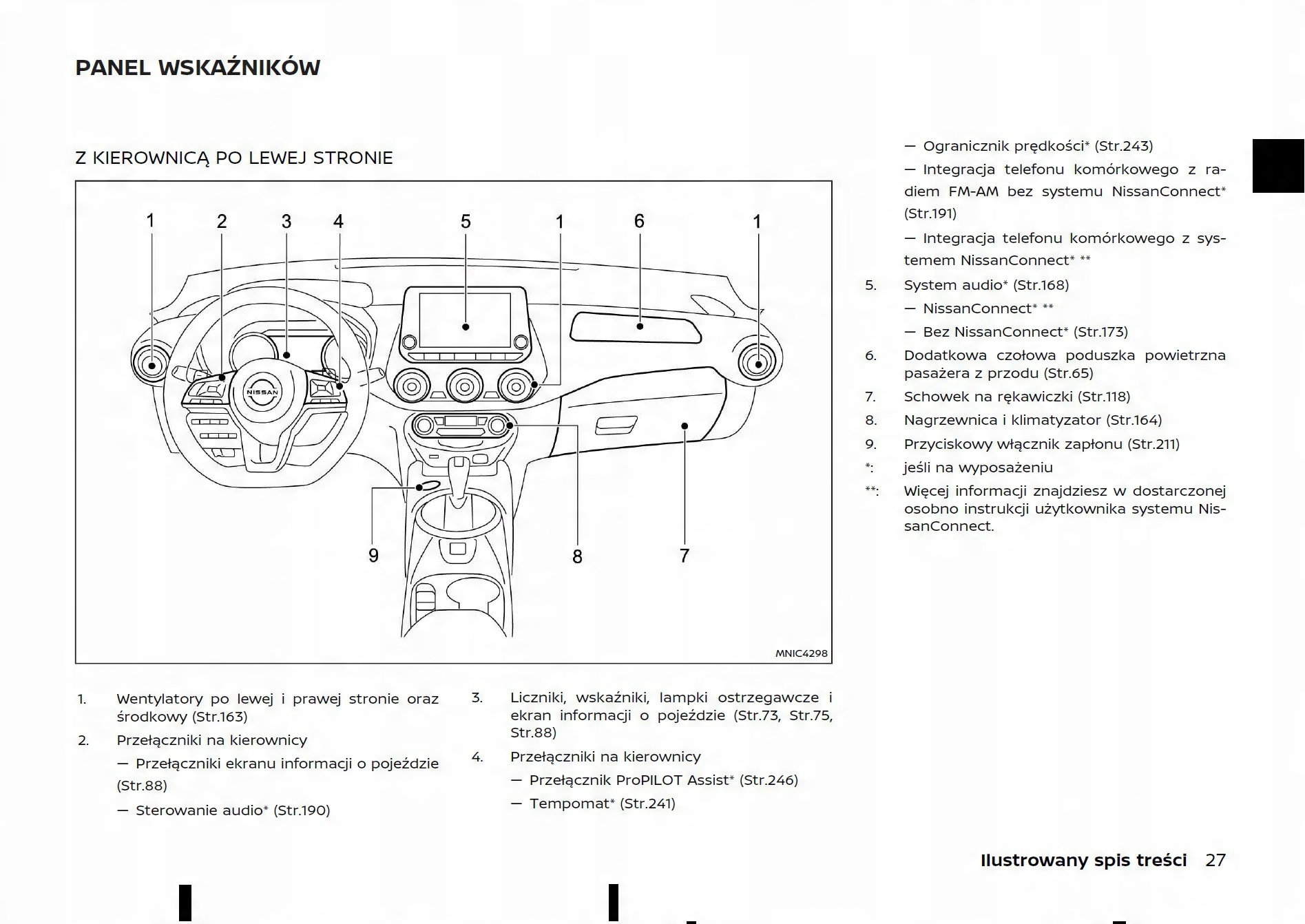 Руководство по эксплуатации Nissan содержит все версии оборудования и полезную информацию о том, как эффективно и безопасно использовать автомобиль, например: - индикаторы, контрольные лампы, открывание и закрывание - освещение и обзорность, сиденья, отсеки для хранения вещей, отопление, вентиляция, кондиционирование воздуха. - советы по вождению, эксплуатации, обслуживанию автомобиля - уровни жидкостей, проверка и доливка, аварийные операции, замена колес, предохранителей, замена лампочек - технические данные... и многое другое, дающее путешественникам ощущение безопасности и комфорта. Польское законодательство обязывает продавца приложить к автомобилю руководство по эксплуатации на польском языке. Руководство пользователя автомобиля новое, на польском языке.