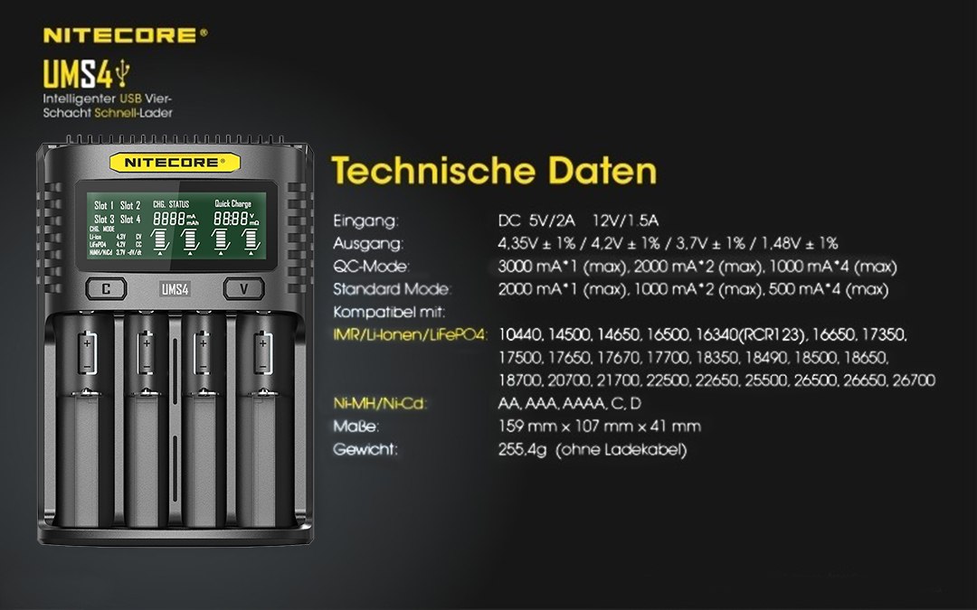 nitecore ums4, оснащенный QC 2.0, заряжающей электронику. USB. Зарядка батарей с длиной 77 мм, например: защищенные батареи 20700/21700, автоматическое обнаружение внутренней сопротивления батареи, расчет заряженной емкости и реактивацию литий-ионной батареи являются еще одним полезным добавками.