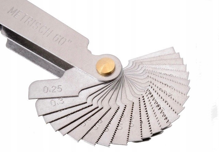 Это измерительный инструмент, называемый гребенкой/калибром/шаблоном резьбы. Он используется для определения шага резьбы. Резьбомер имеет шкалу от 0,25 до 6 мм. Устройство состоит из 24 лепестков.