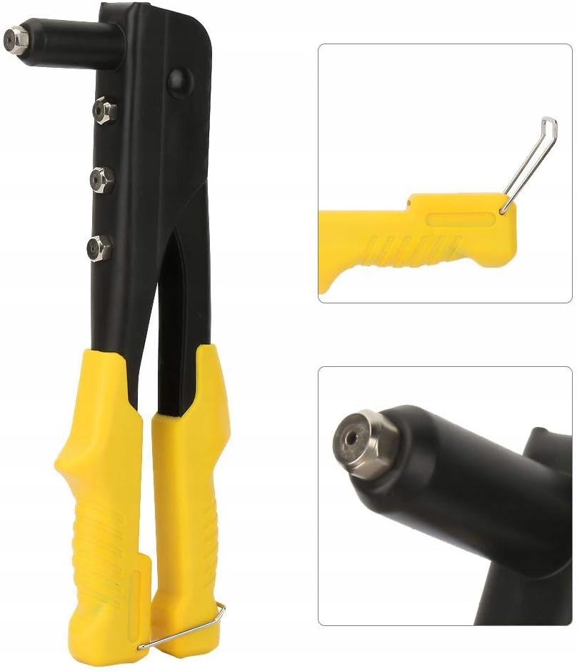 Ручной заклепочник со сменными наконечниками, нескользящими ручками и предохранителем. В комплект также входит ключ для замены насадок, которые установлены на инструменте. Наконечники подходят к заклепкам разных размеров, что обеспечивает универсальное использование.