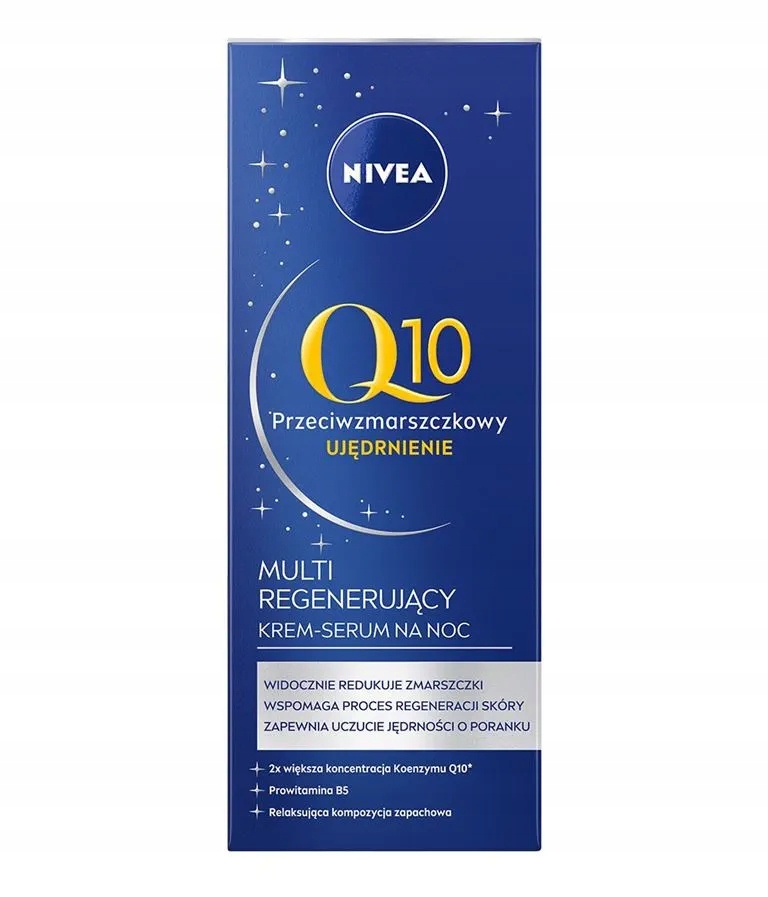 Укрепляющий мультирегенерирующий ночной крем-сыворотка NIVEA Q10 помогает вашей коже максимально эффективно использовать время сна для интенсивной регенерации. Активно борется со старением**, заметно увлажняет и омолаживает кожу. Формула содержит двойную концентрацию чистого коэнзима Q10*, который заряжает кожу энергией и помогает максимизировать естественный процесс ее регенерации**. Провитамин B5 поддерживает процессы восстановления кожи, помогая нейтрализовать микроповреждения, полученные в течение дня**. Расслабляющая парфюмерная композиция «Аромат сладкой ночи» помогает расслабить чувства, подготавливая кожу к спокойному ночному отдыху.