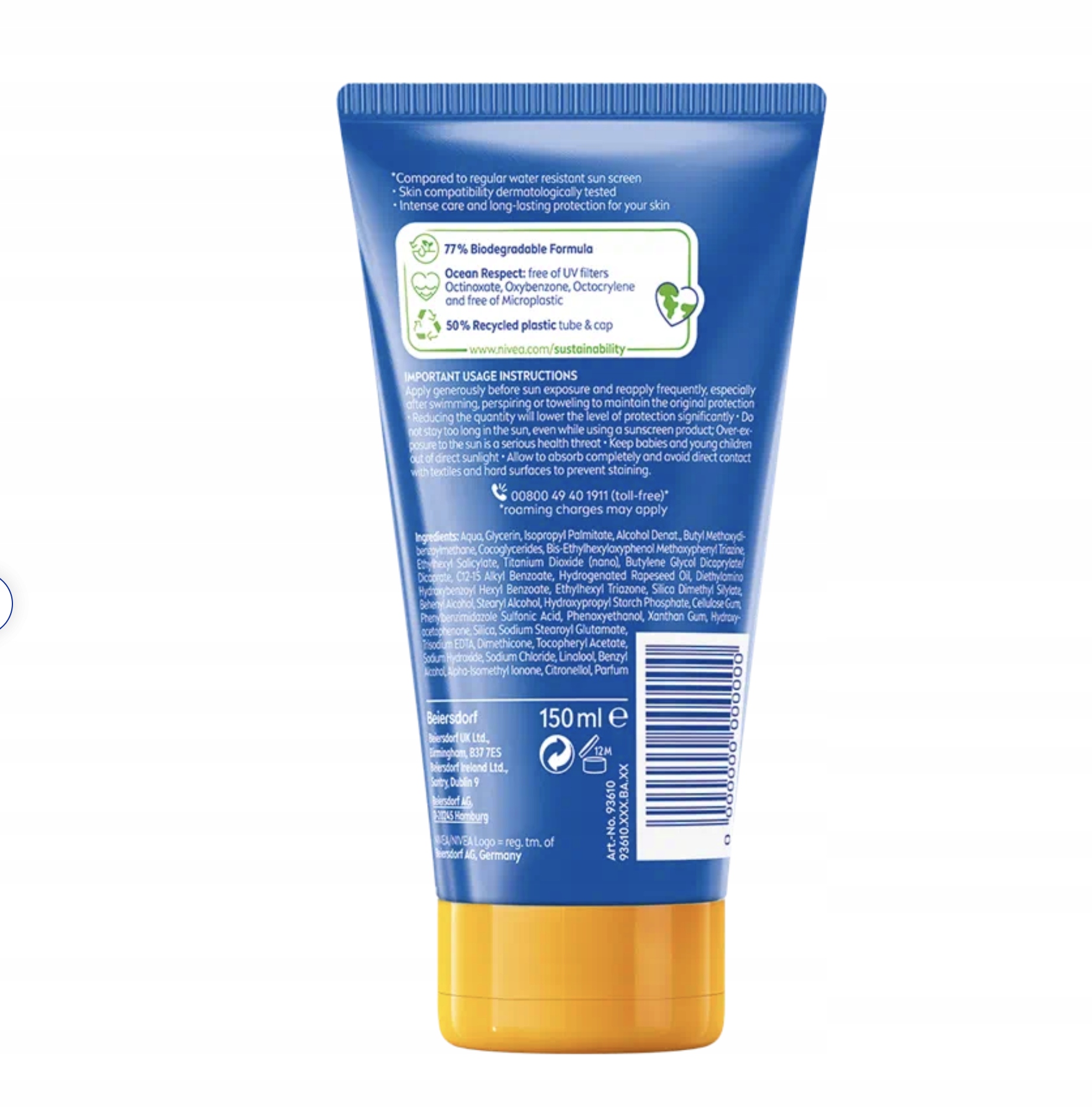 Устойчивое развитие: формула защищает океан, поскольку не содержит УФ-фильтров. октиноксат, оксибензон, октокрилен и микропластики. Формула на 77 % биоразлагаемая, тюбик и колпачок на 50 % изготовлены из переработанного пластика.