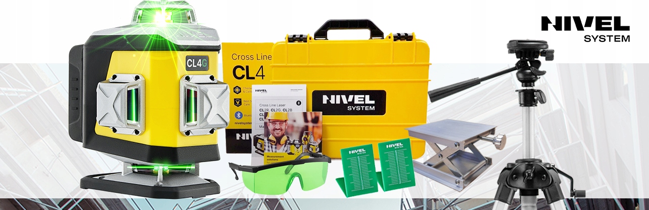Nivel System CL4G — это многоцелевой 4D-лазер. Оборудование устанавливает на стене идеально выровненные опорные линии (горизонтальные и вертикальные), которые поддерживают все отделочные и общестроительные работы. Лазер имеет 4 лазерные головки, благодаря которым пользователь может работать с четырьмя лазерными плоскостями – в диапазоне 360° каждая. Одновременное отображение этих плоскостей позволяет определить прямой угол. Эта опция полезна, среди прочего: при строительных и отделочных работах (например, укладке плитки). Блокировка компенсатора позволяет наклонять инструмент и использовать диагональные линии. Встроенная резьба для штатива позволяет надежно и устойчиво закрепить прибор на штативе, адаптере или лазерной полке. Усиленные элементы корпуса лазера защищают от повреждений, вызванных ударами и ударами.