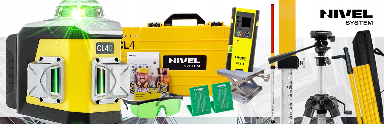 Nivel System CL4G — это многоцелевой 4D-лазер. Оборудование устанавливает на стене идеально выровненные опорные линии (горизонтальные и вертикальные), которые поддерживают все отделочные и общестроительные работы. Лазер имеет 4 лазерные головки, благодаря которым пользователь может работать с четырьмя лазерными плоскостями – в диапазоне 360° каждая. Одновременное отображение этих плоскостей позволяет определить прямой угол. Эта опция полезна, среди прочего: при строительных и отделочных работах (например, укладке плитки). Блокировка компенсатора позволяет наклонять инструмент и использовать диагональные линии. Встроенная резьба для штатива позволяет надежно и устойчиво закрепить прибор на штативе, адаптере или лазерной полке. Усиленные элементы корпуса лазера защищают от повреждений, вызванных ударами и ударами.