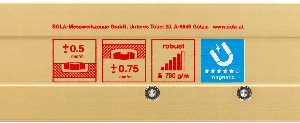- Отныне очень сильные магниты из неодим будет установлен сбоку профиля, а не непосредственно на измерительной поверхности. Этот совершенно новый метод крепления боковых магнитов, разработанный SOLA, обеспечивает заметные преимущества при использовании уровня, особенно с точки зрения точности, прочности сцепления, чистоты и безопасности.
