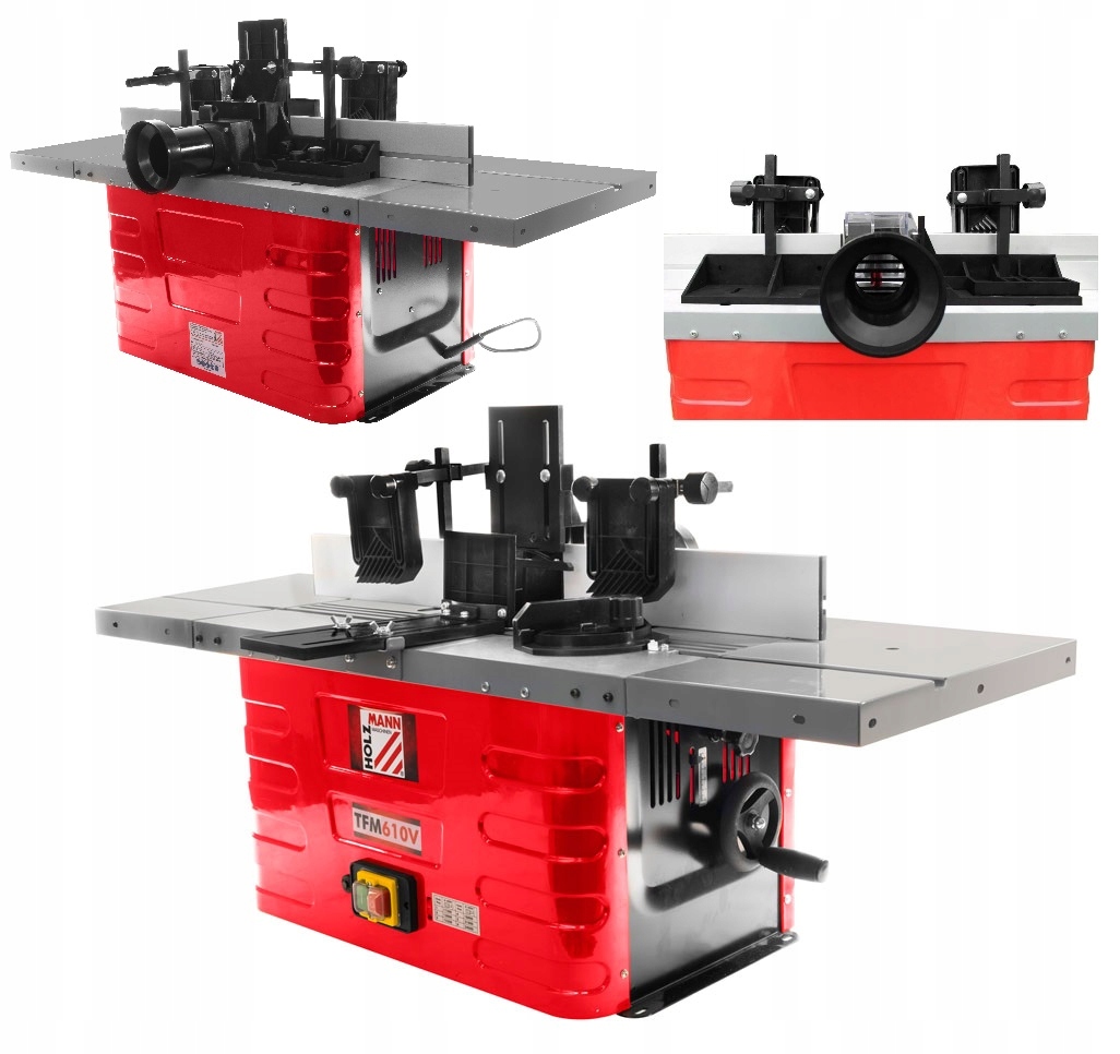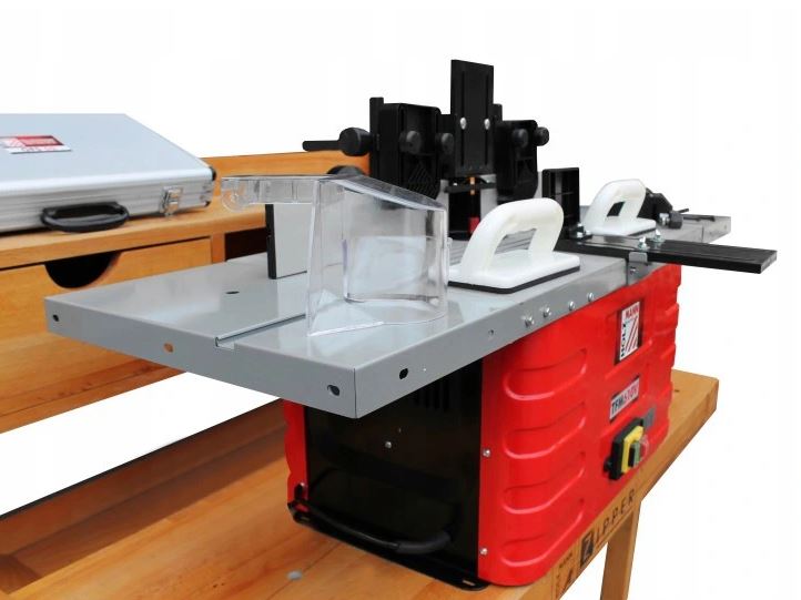 - В комплект поставки входят: цанги диаметром 6, 8 и 12 мм, 2-кратное удлинение стола (с обеих сторон), угловая шкала. , алюминиевый упор, толкатель