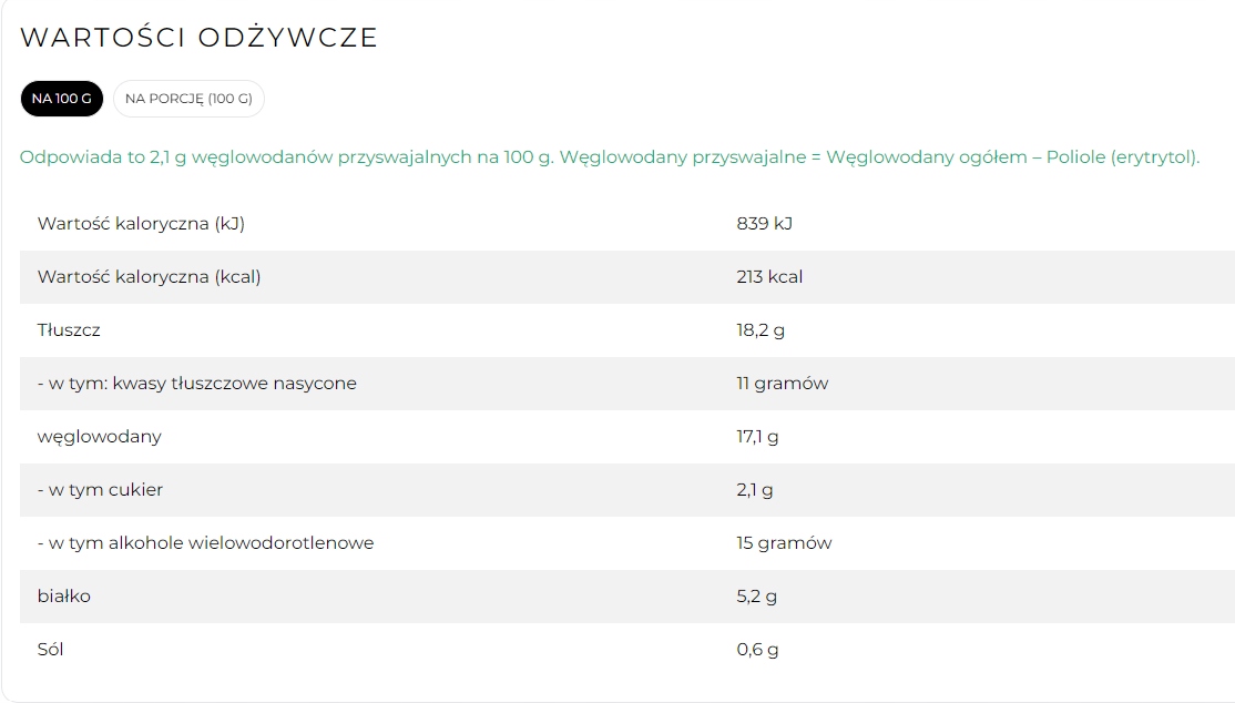 Продукт подслащен натуральными подсластителями (эритритом, ксилитом, стевиогликозидами), что ограничивает скачки глюкозы и помогает поддерживать стабильный обмен веществ.