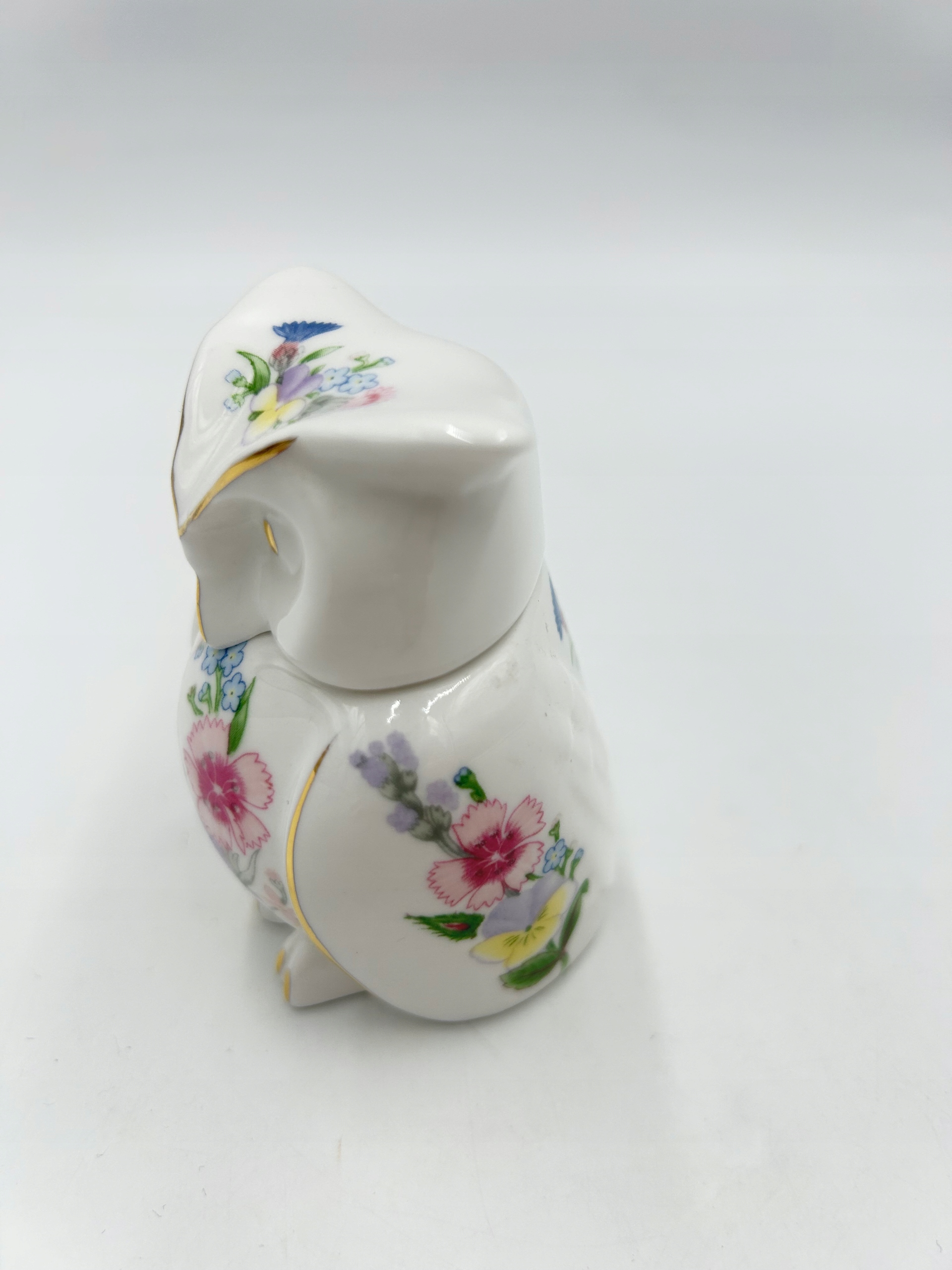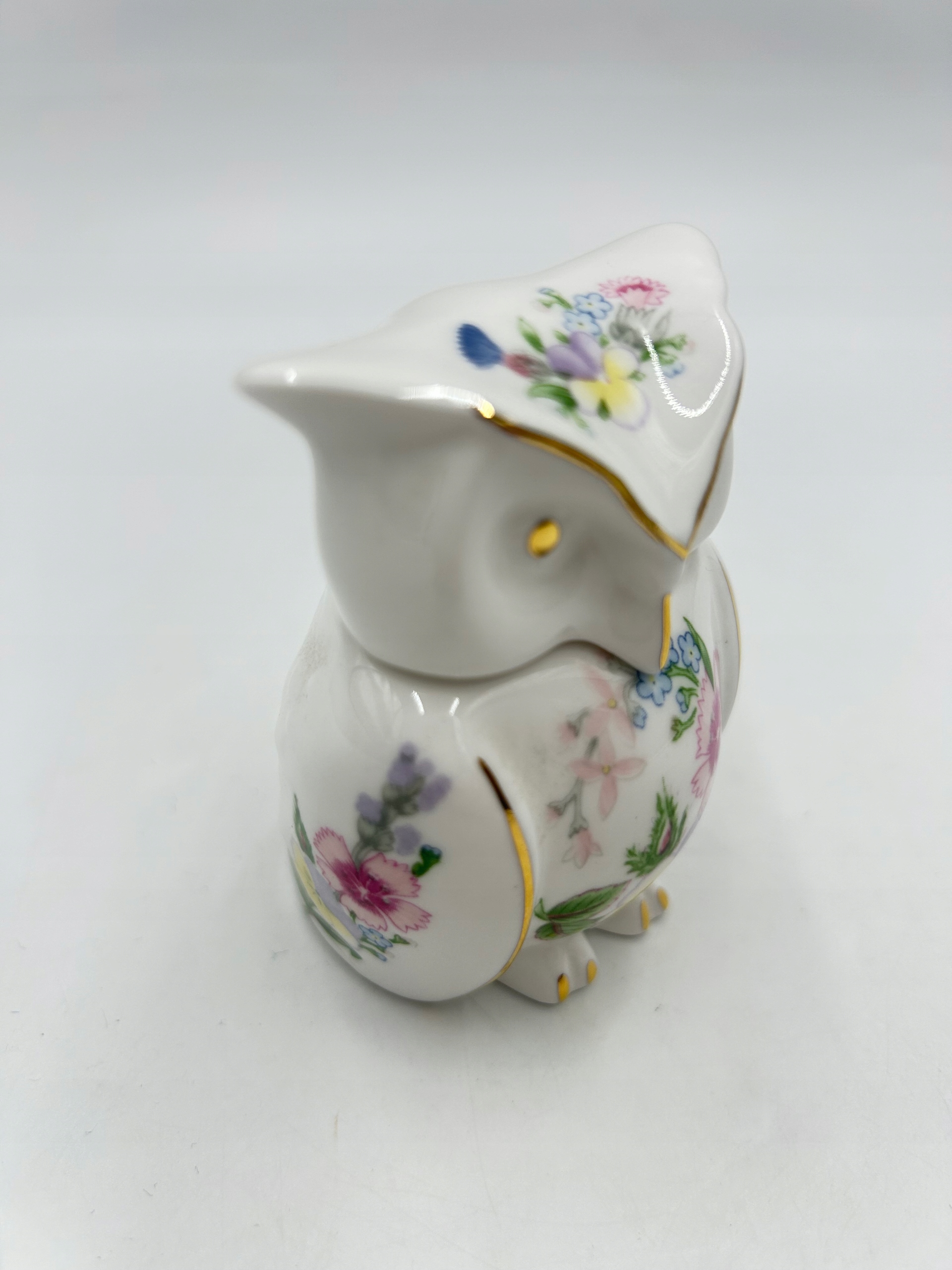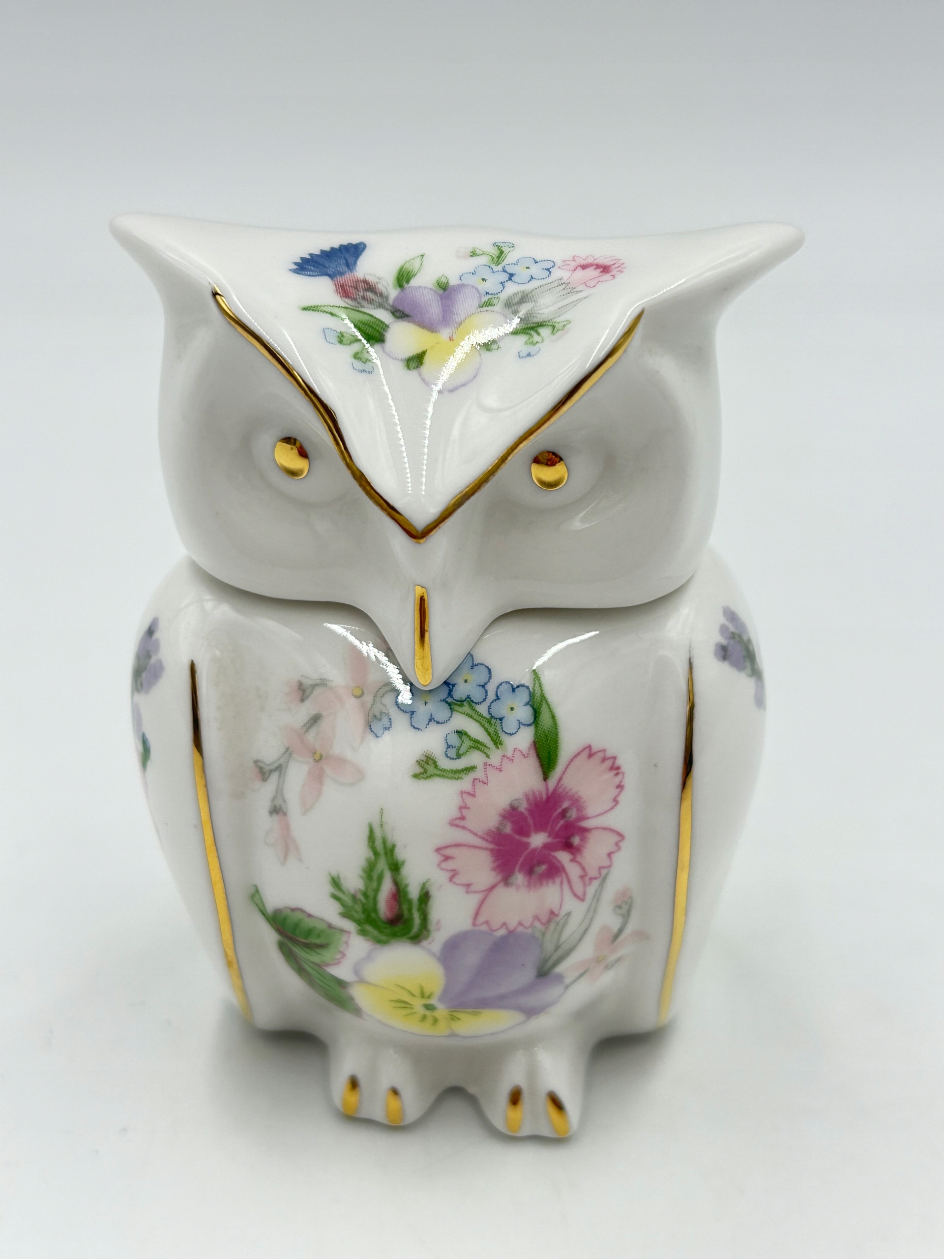 Тема продажи - очаровательная шкатулка, безделушка для мелких предметов в форме совы. Изготовлен из фарфора высочайшего качества, украшенный богатым цветочным элементом, позолоченными краями. Вечная элегантность. Я рекомендую.