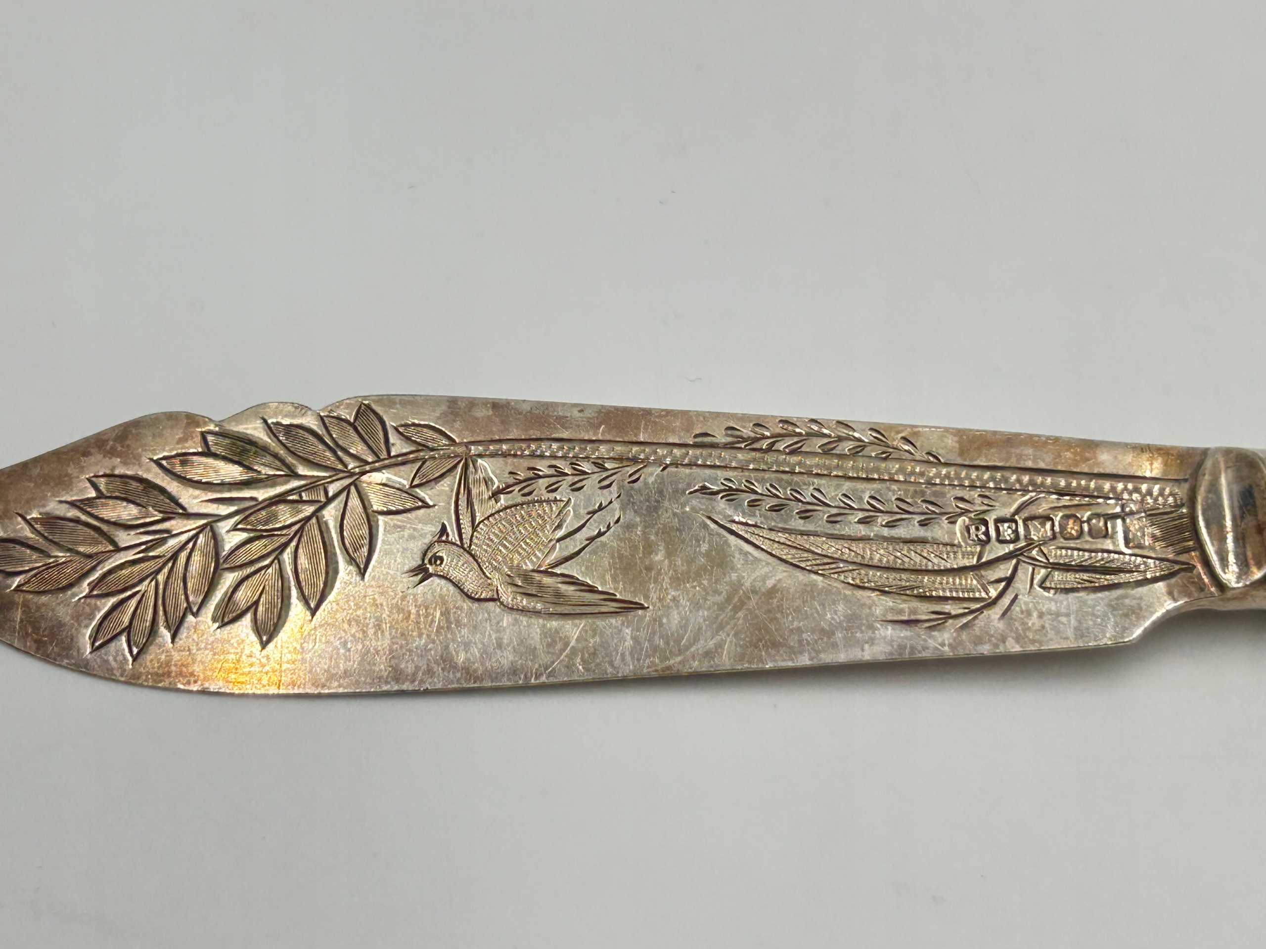 Оригинальный элегантный десертный нож конца 19 - начала 19 века. 20 век. Клинок богато украшен ручной гравировкой, изображающей растительный и птичий мотив. Ручка выполнена из настоящего перламутра - красивые, раздражающие переливы. На клинке видны проколы/маркировка производителя.