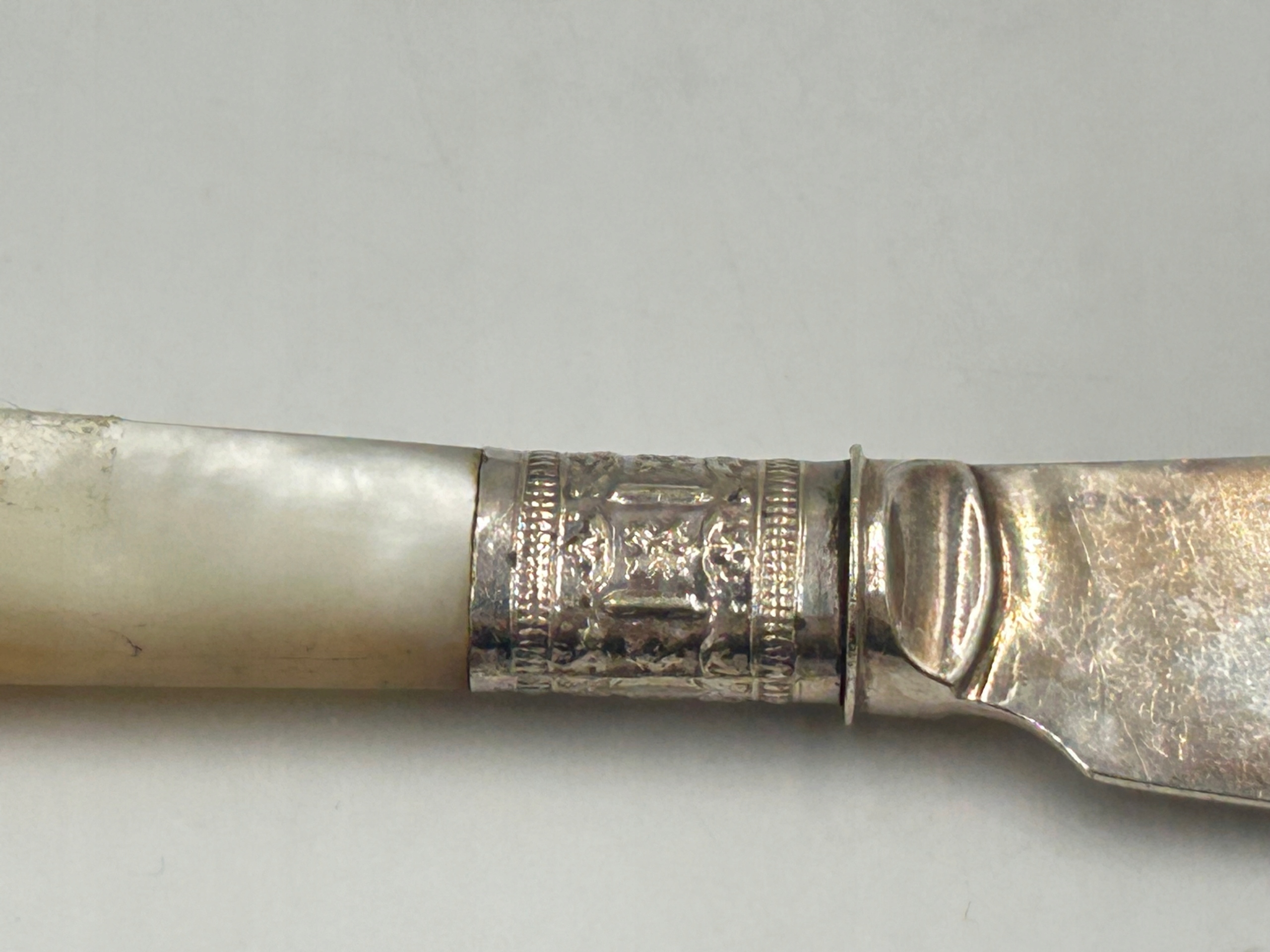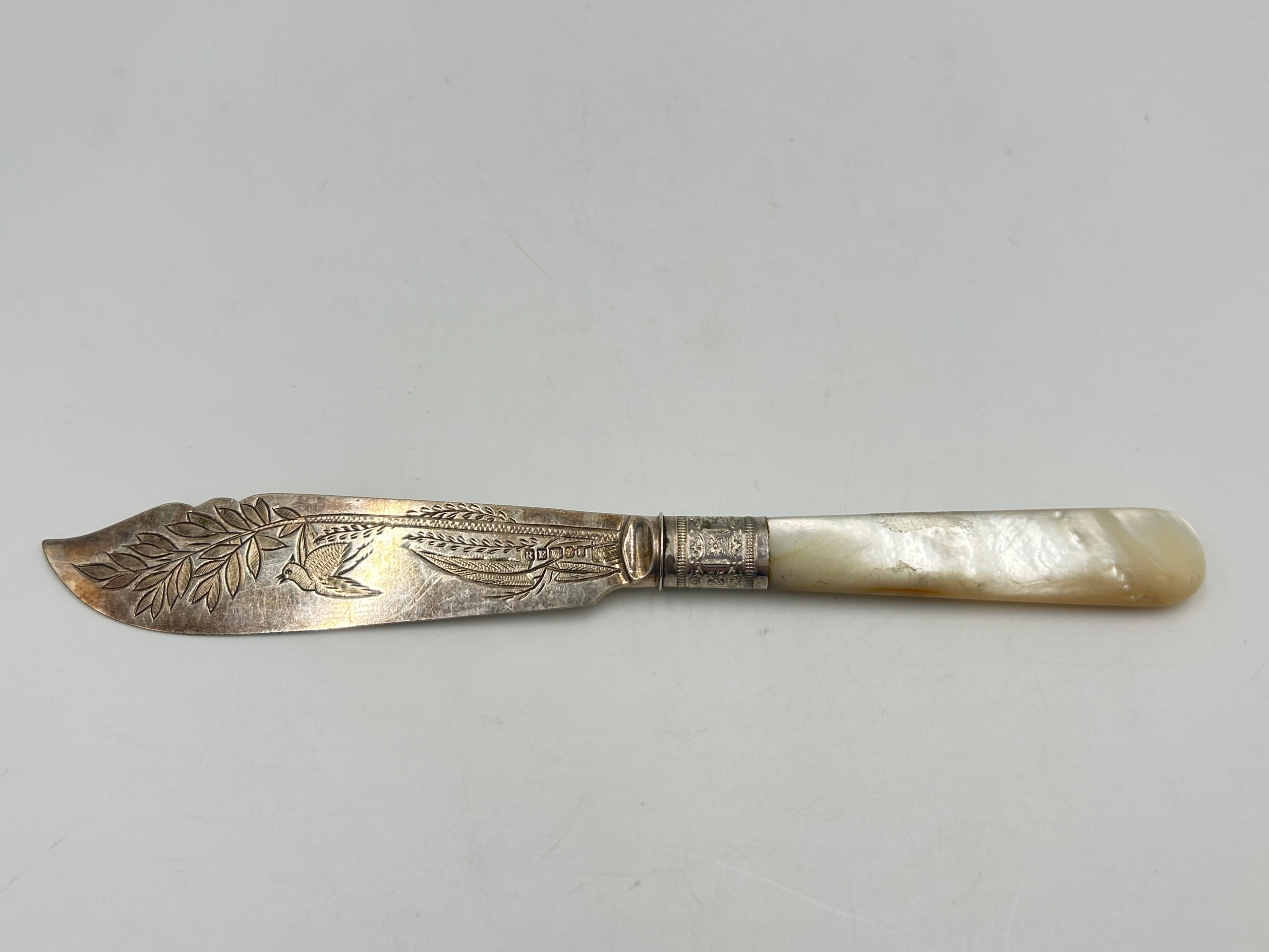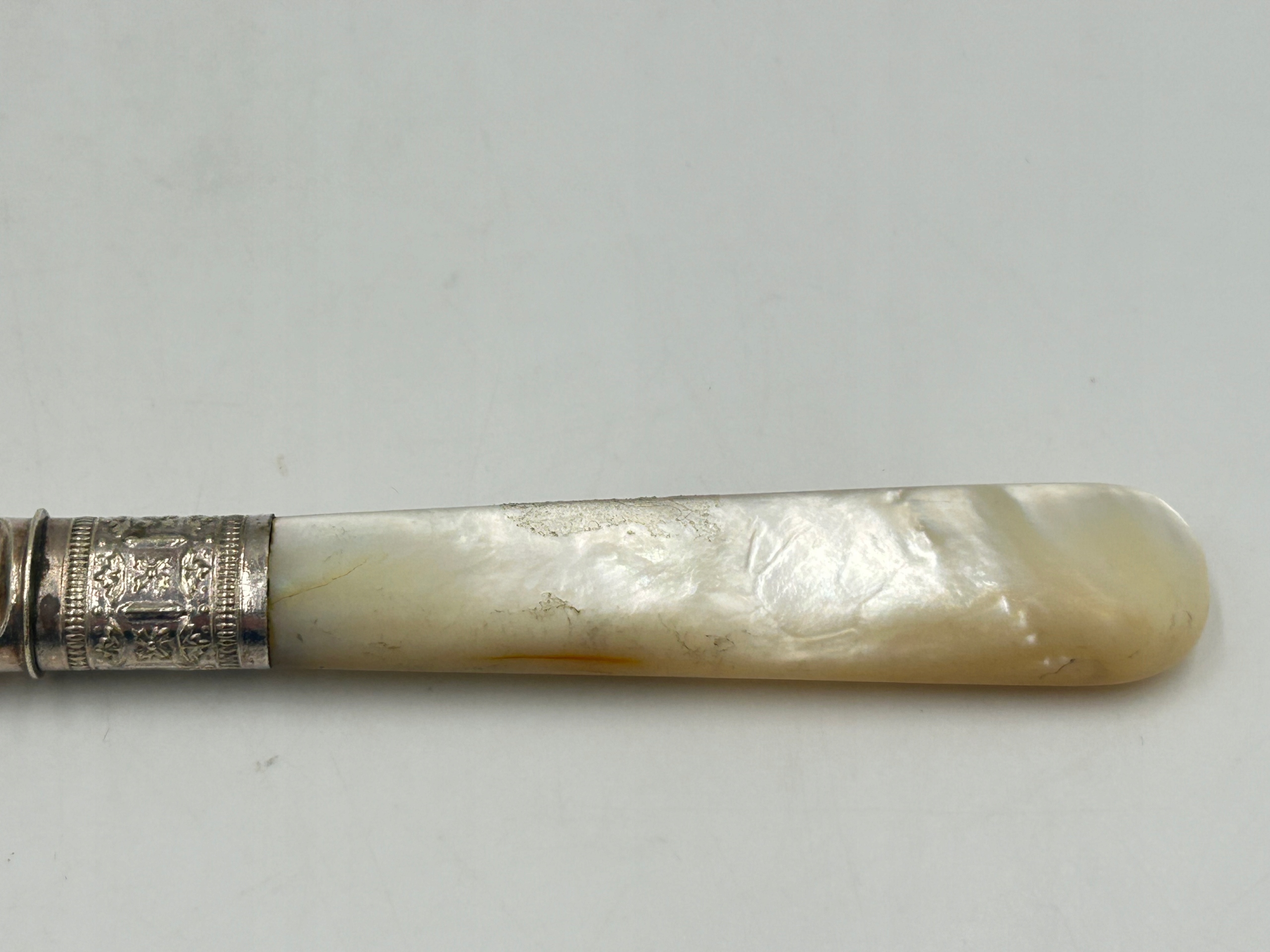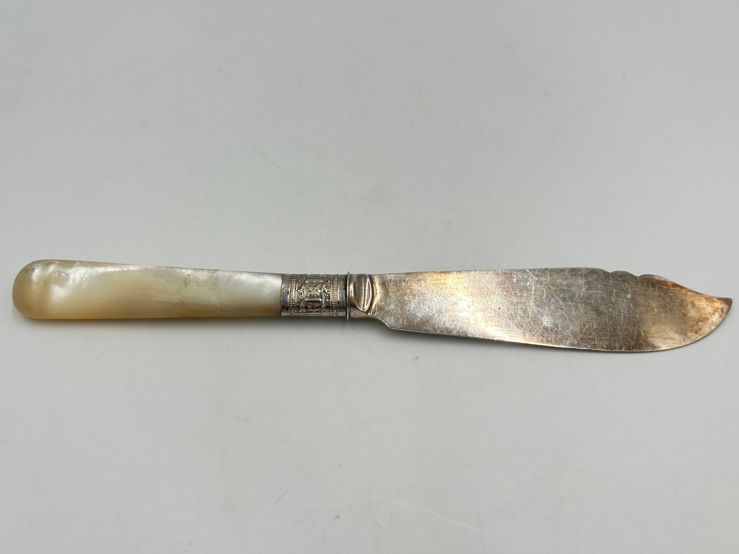 Старинный десертный нож/нож для масла, посеребренное лезвие, перламутровая ручка, гравировка