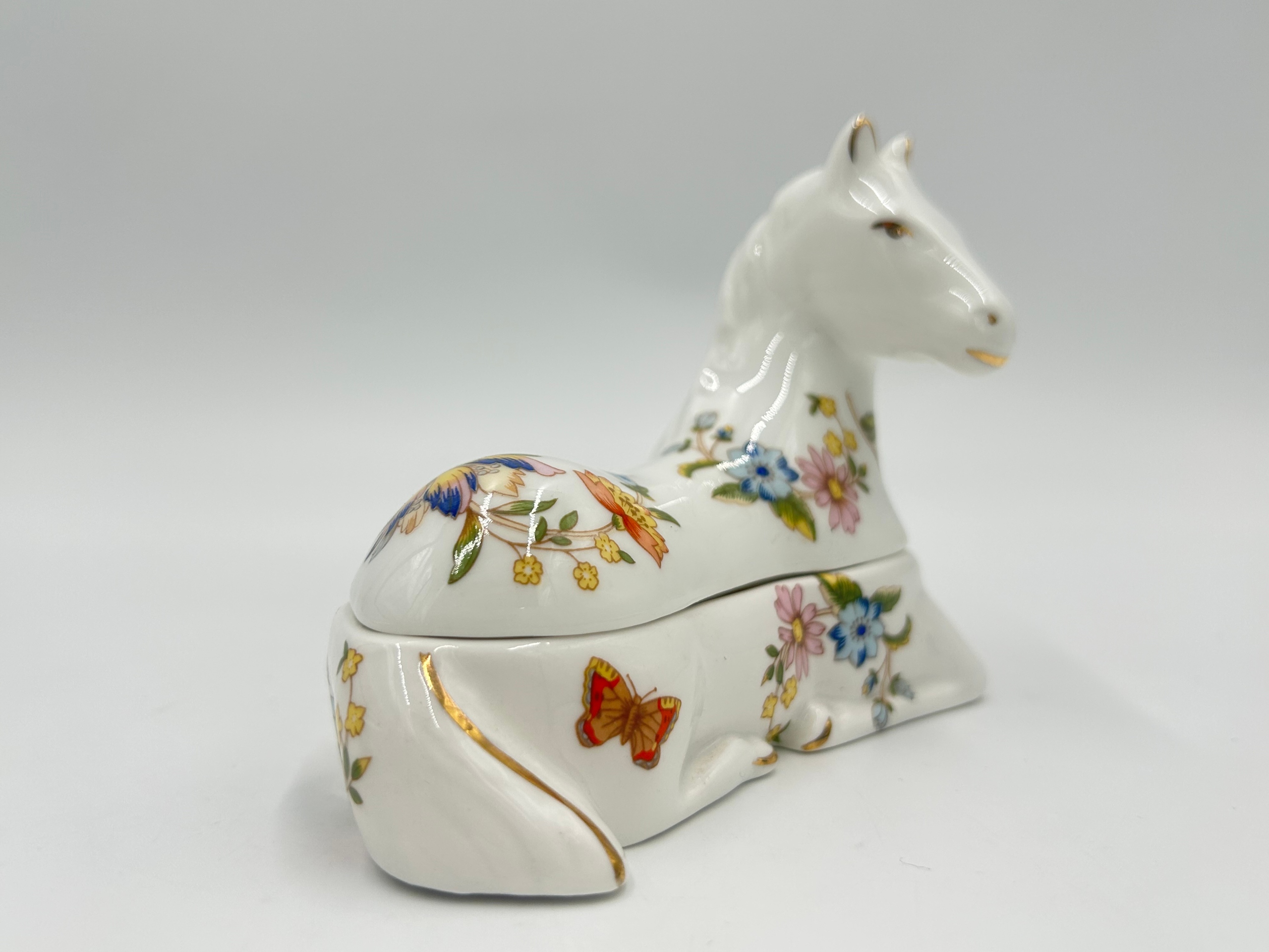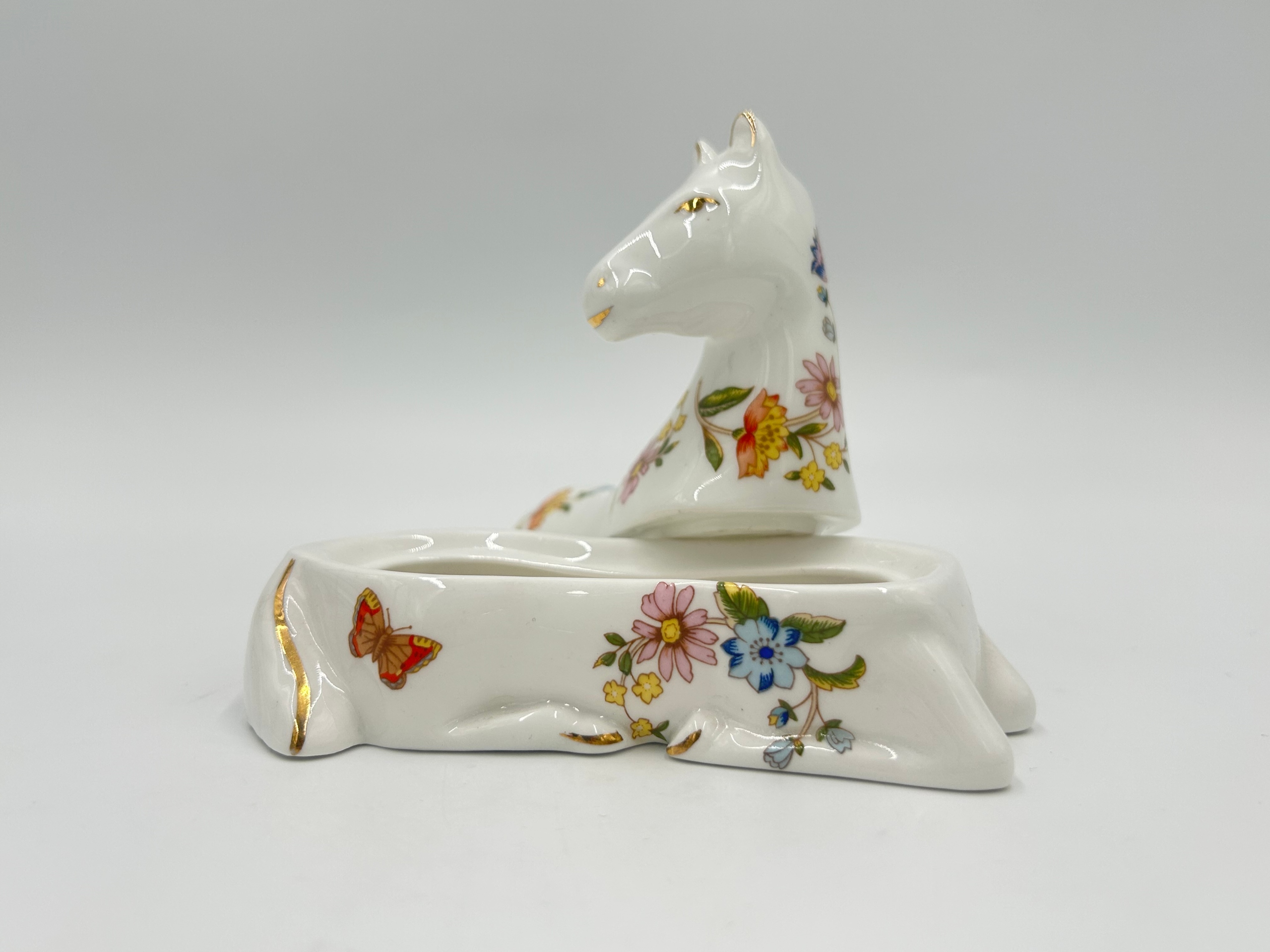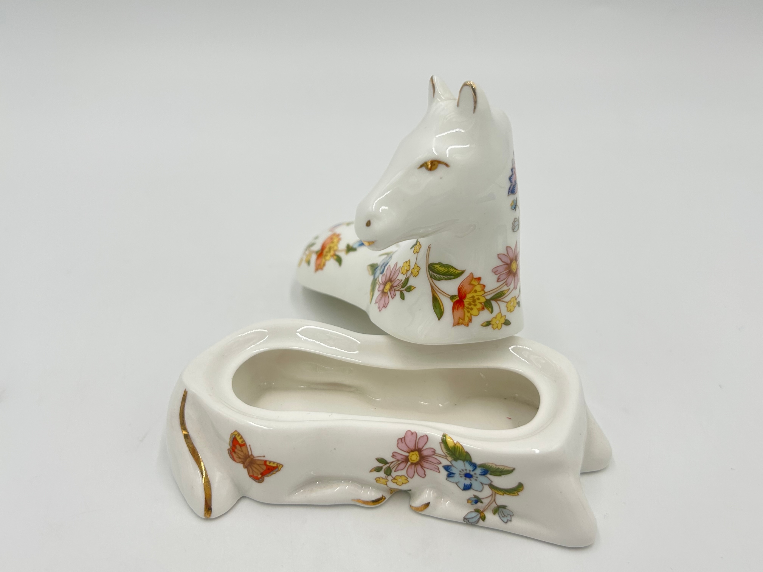 Продается элегантная шкатулка для безделушек и украшений в виде лошади, из серии Cottage Garden от Aynsley. Изготовлен из высококачественного тонкого английского костяного фарфора, украшенного разноцветным узором из цветов и бабочек, характерным для этой коллекции.