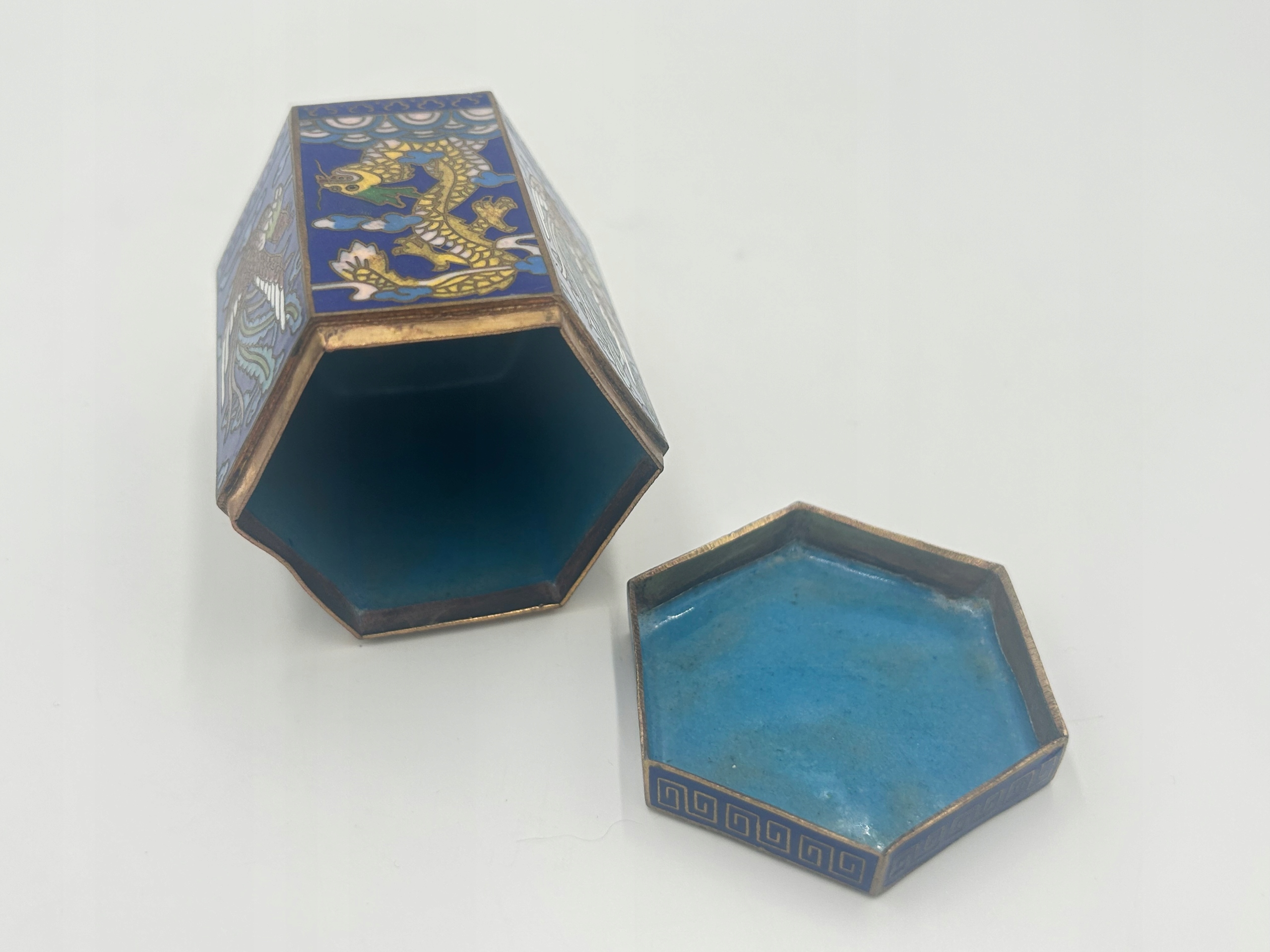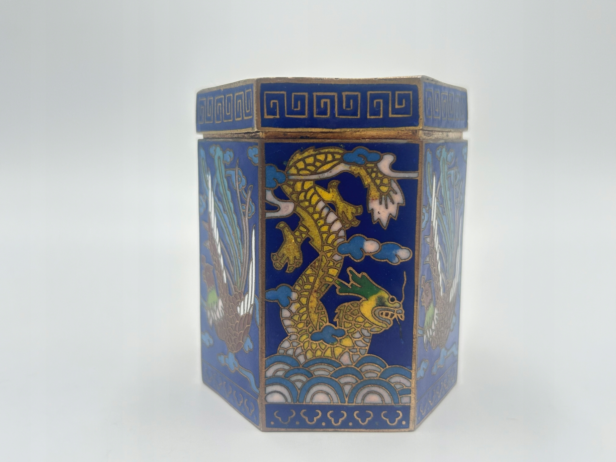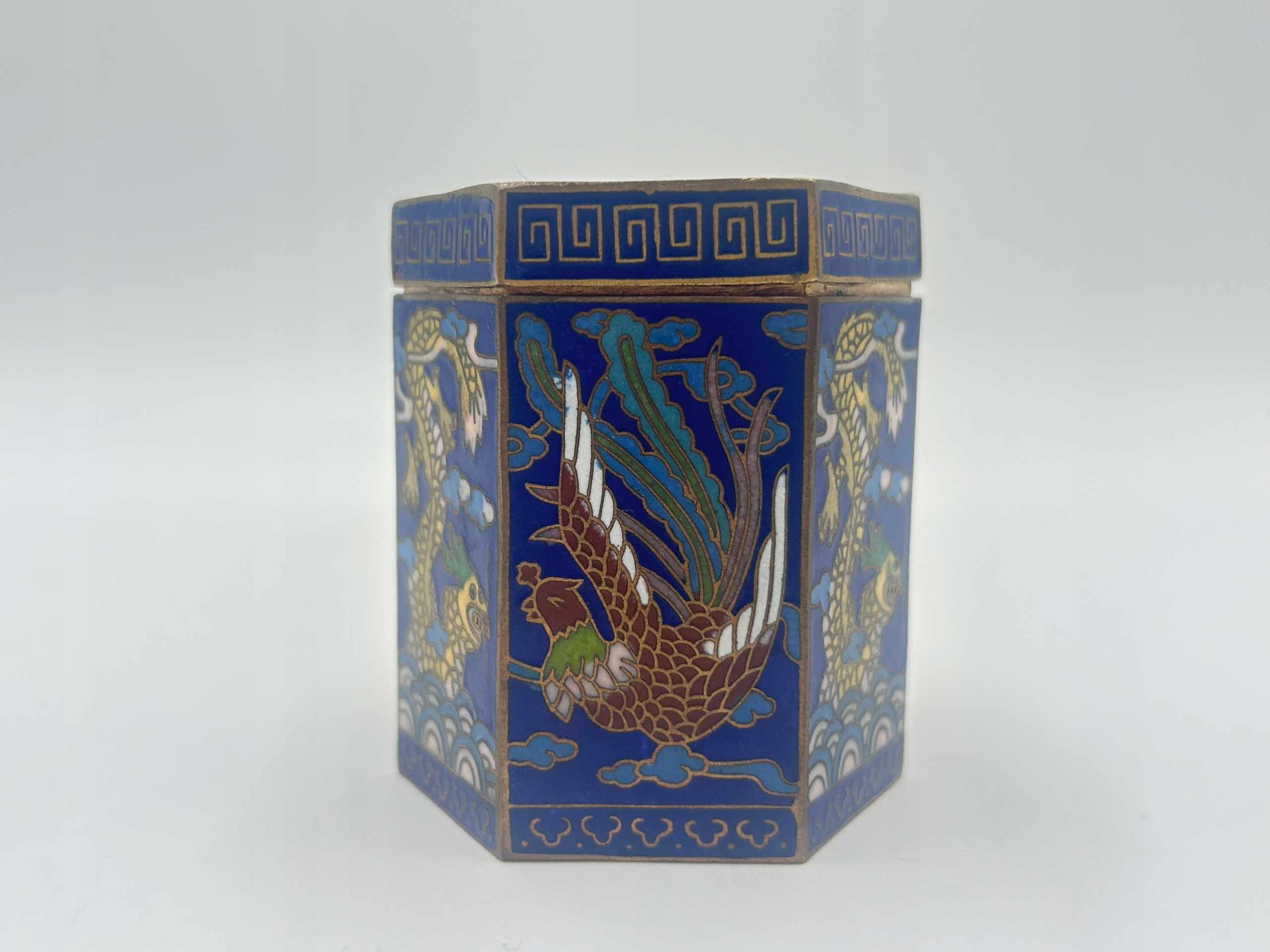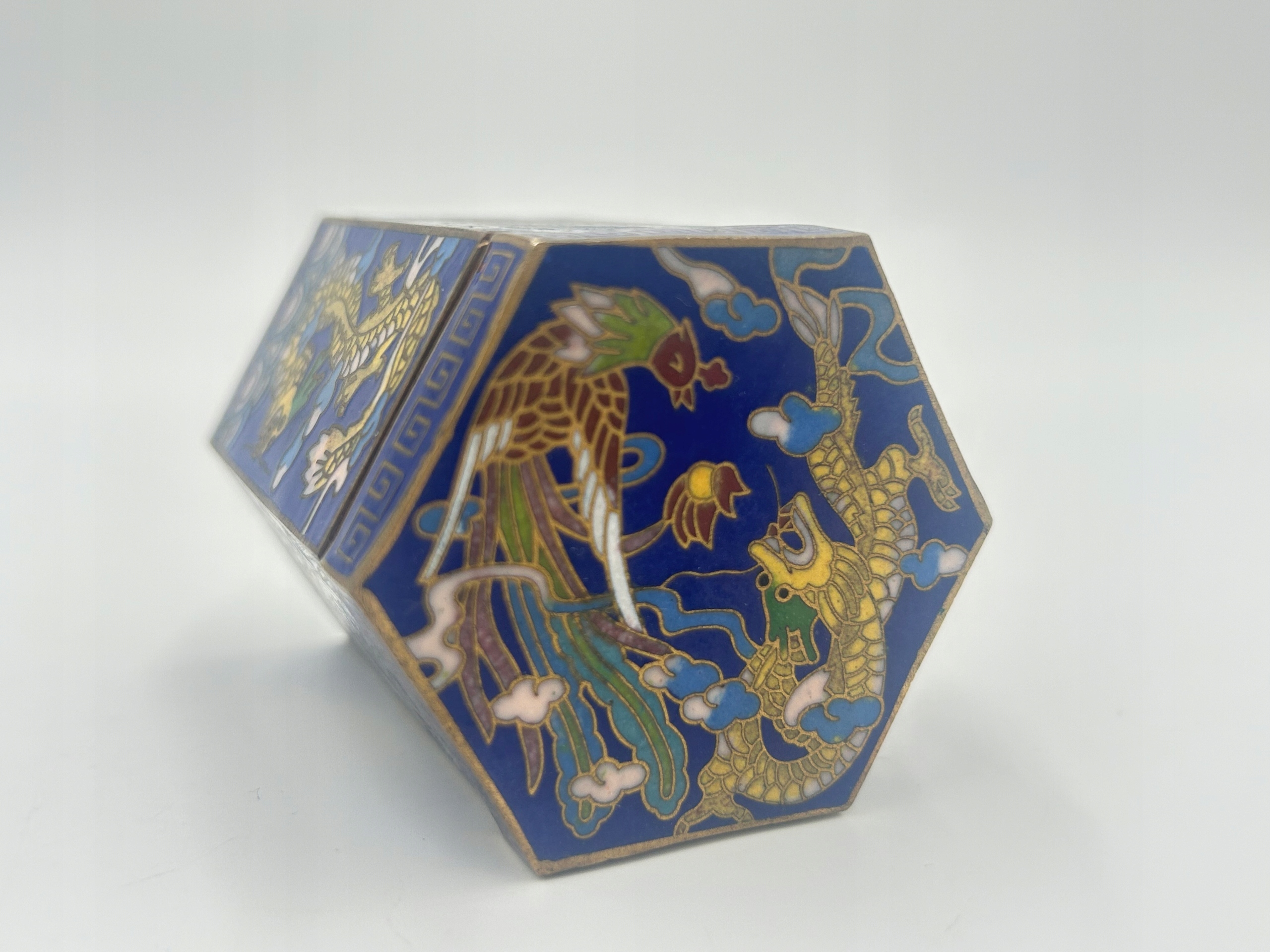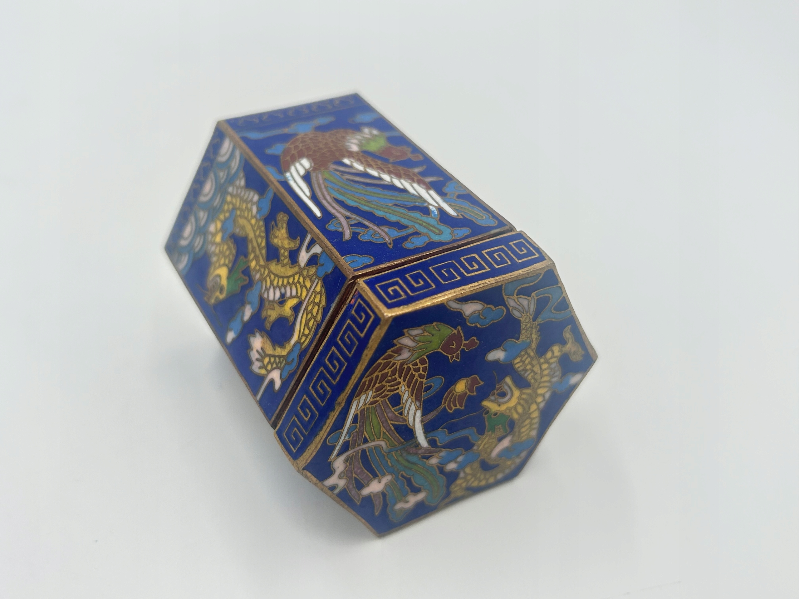 Я представляю вам редкую коробку для закуски, шкатулка, украшенная техникой Cloisonne - клеточной эмаль. Форма шестиугольника - в цвете интенсивного синего цвета, украшенная изображением драконов и горных птиц. Сделано с большим вниманием к поддержанию деталей и множеству деталей. Цветовое насыщение добавляет характер и уникальность. Я рекомендую !!!