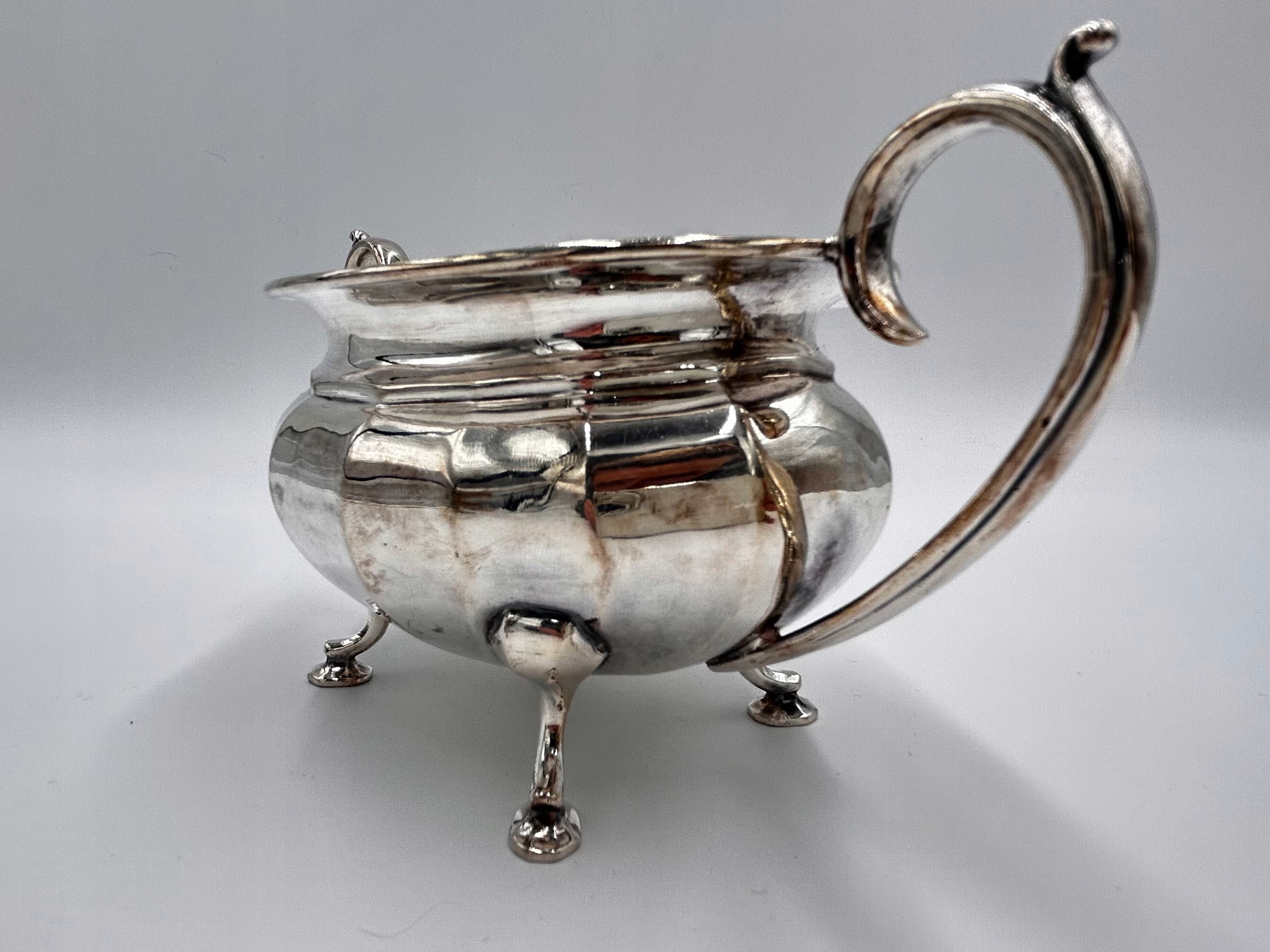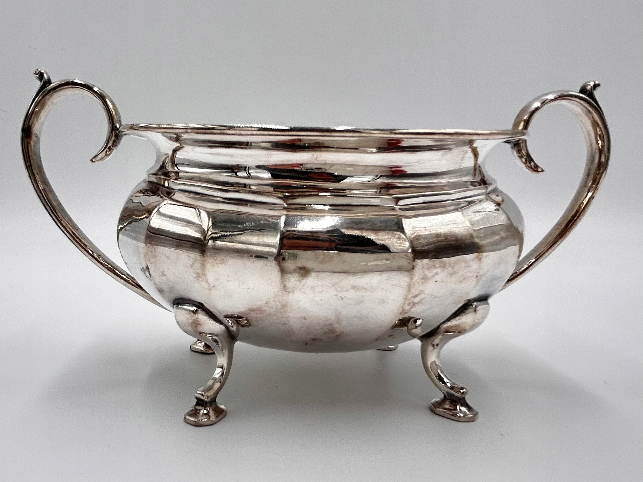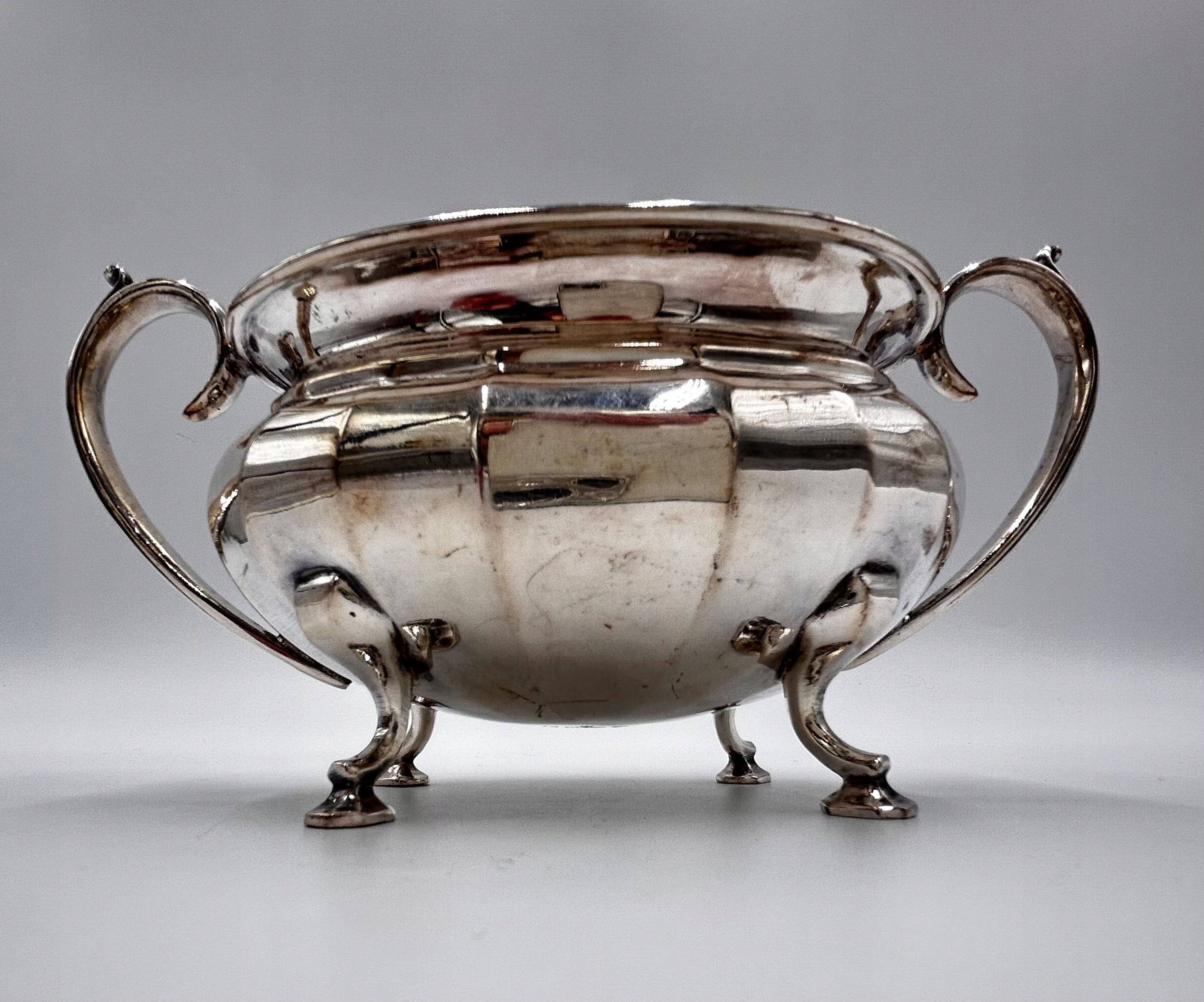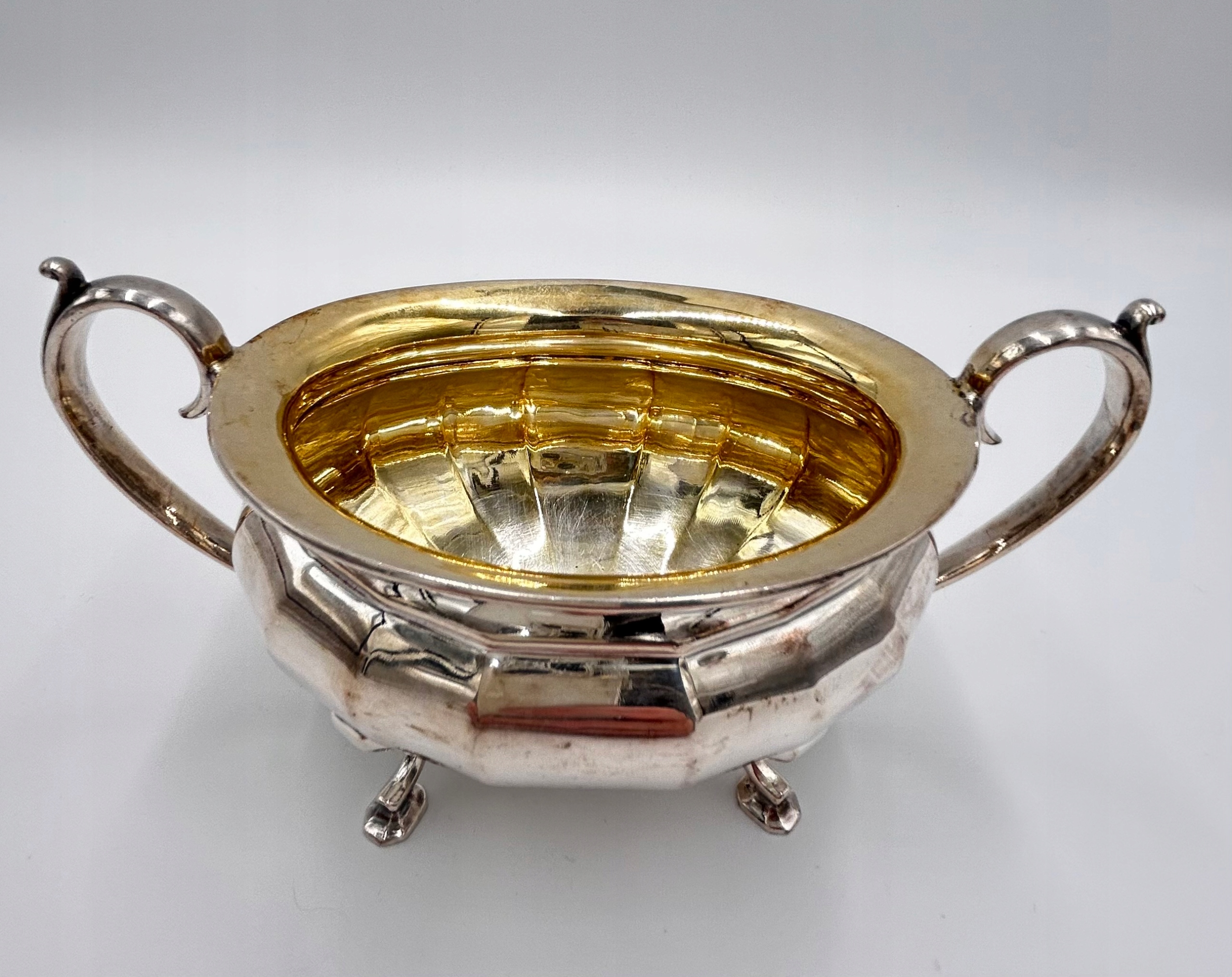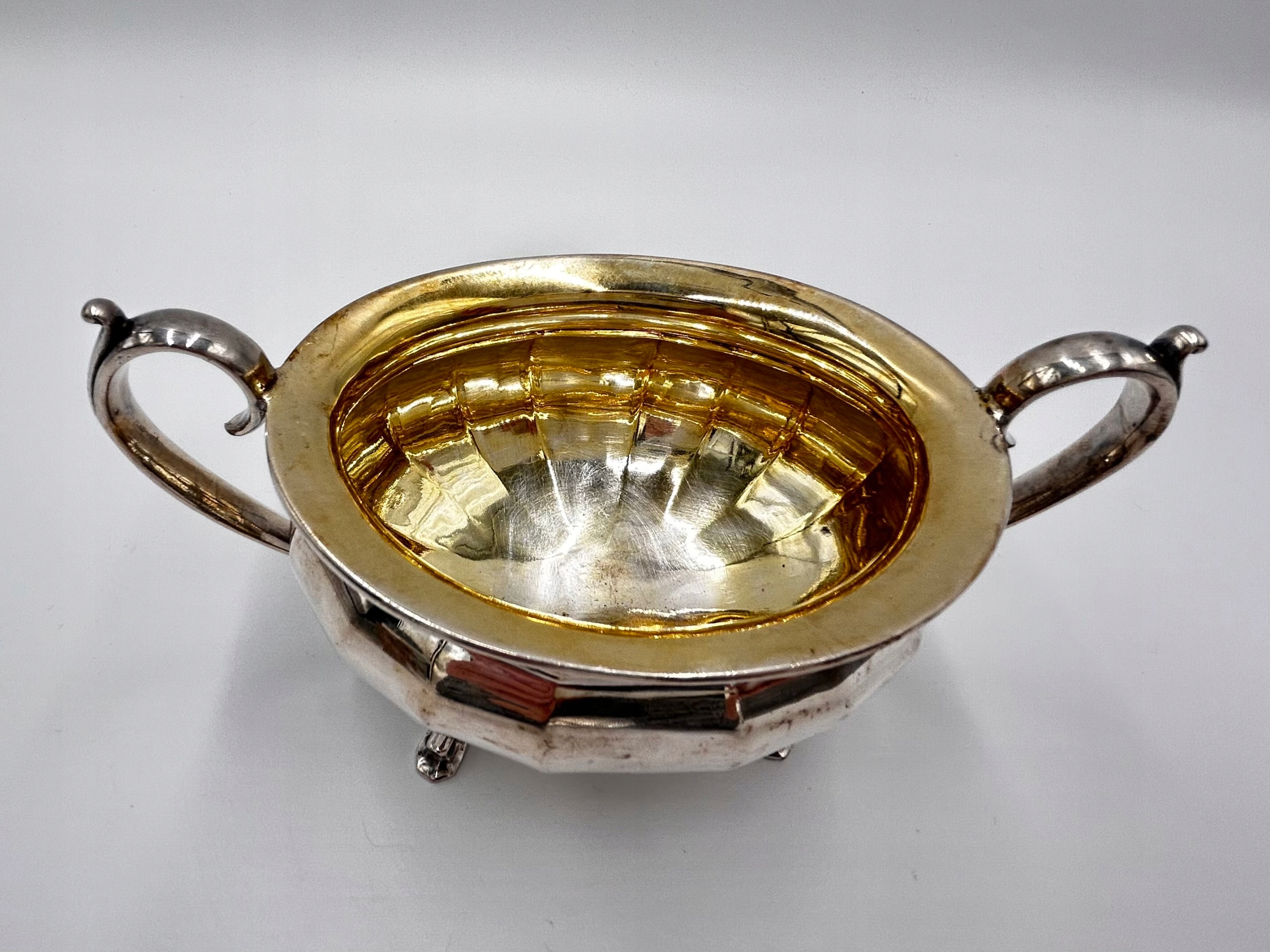 Представляю вам изящную сахарницу с тарелкой и причудливо изогнутыми ножками. Внутренняя часть сосуда позолочена. Уникальный декоративный элемент для людей, ценящих неподвластную времени элегантность.