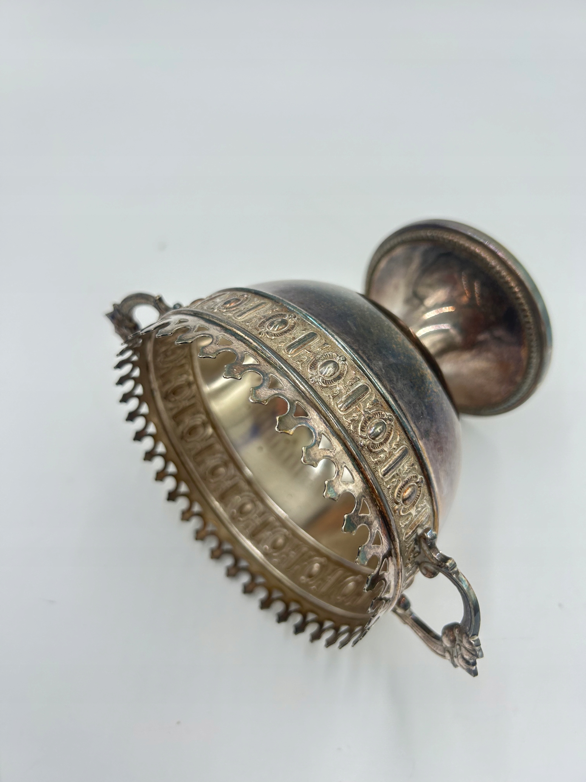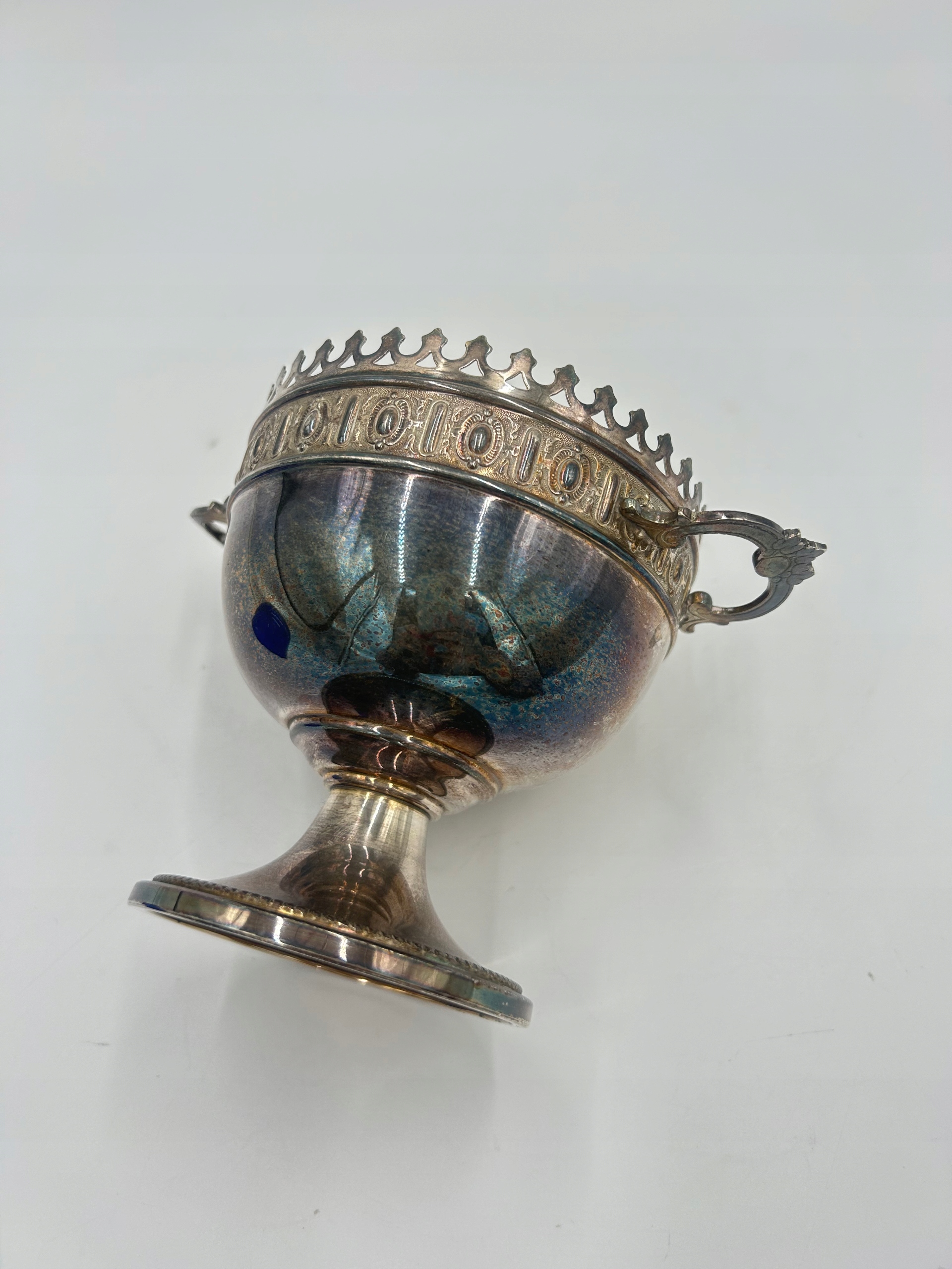 На продажу предлагаю элегантную старинную чашку со вставкой из кобальтового стекла в декоративной металлической корзине. Изделие выполнено с большим вниманием к деталям - имеет красивую ажурную отделку и декоративные ручки по бокам.