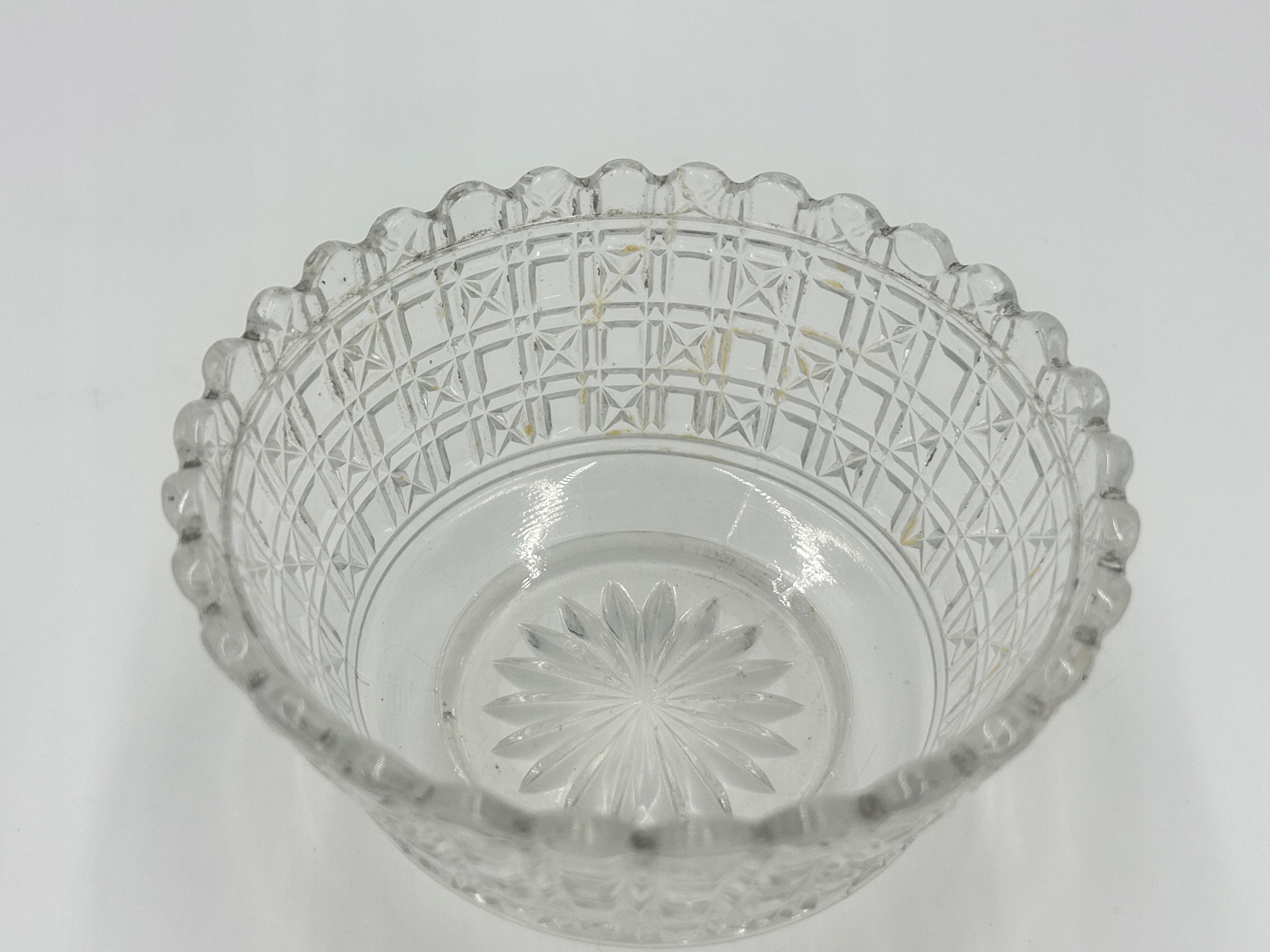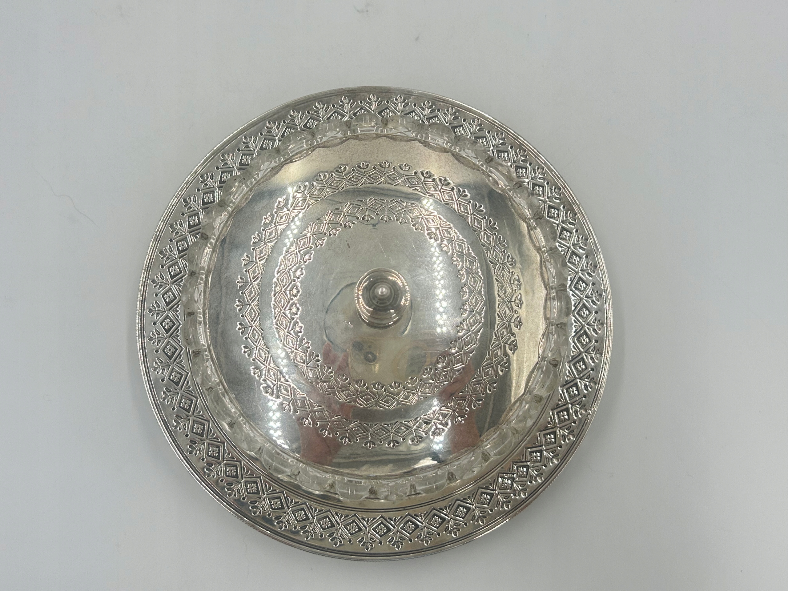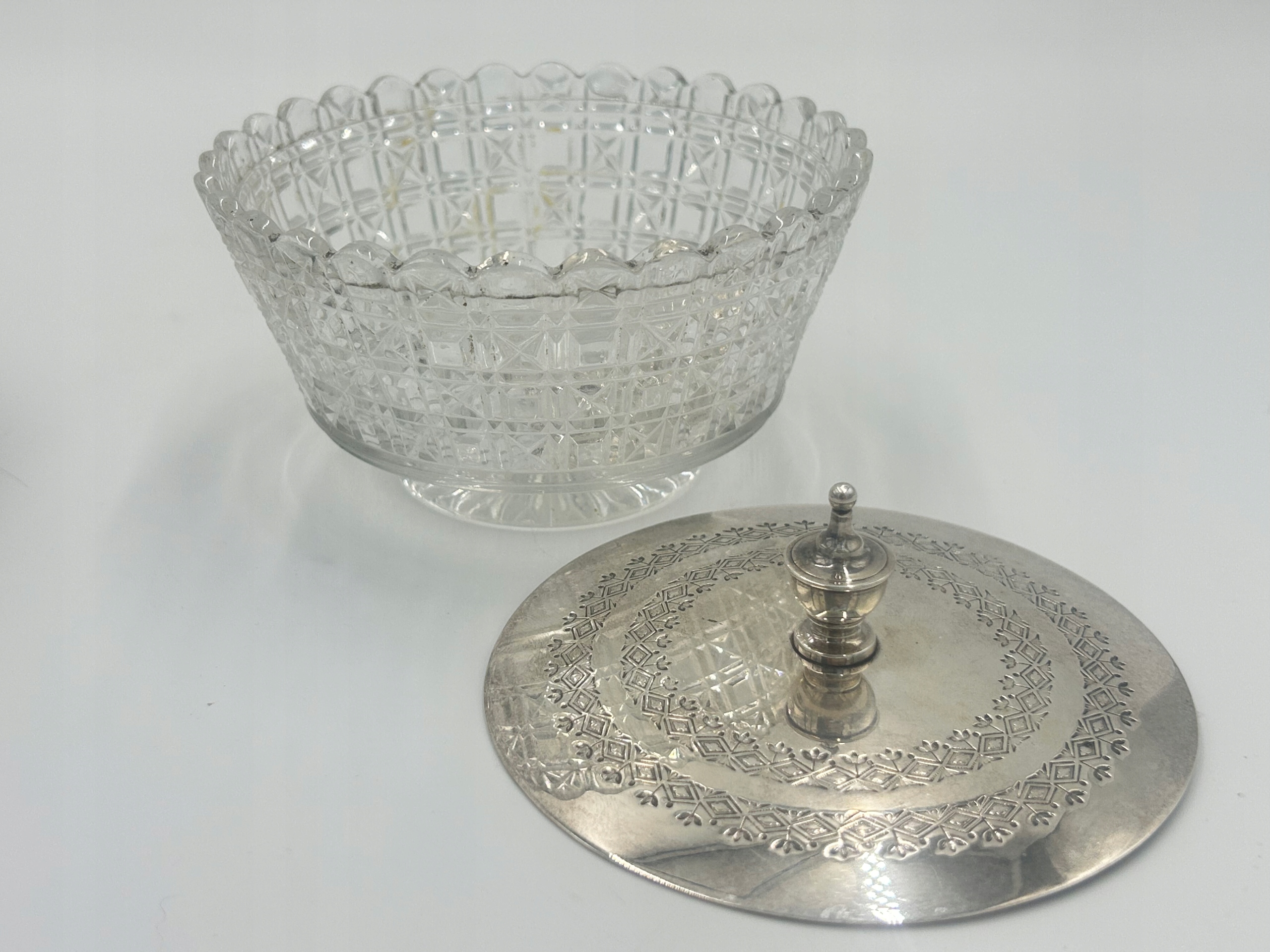 Предмет продажи — декоративная сахарница/конфетница из стекла с плакированной крышкой, на декоративной круглой основе. Сахарница из глубокого граненого стекла, поставленная на подставку с тремя декоративными ножками. Маркировка производителя расположена на обратной стороне основания. Это уникальный, элегантный предмет 19 века, который станет прекрасным дополнением вашей антикварной коллекции или элегантным украшением стола.