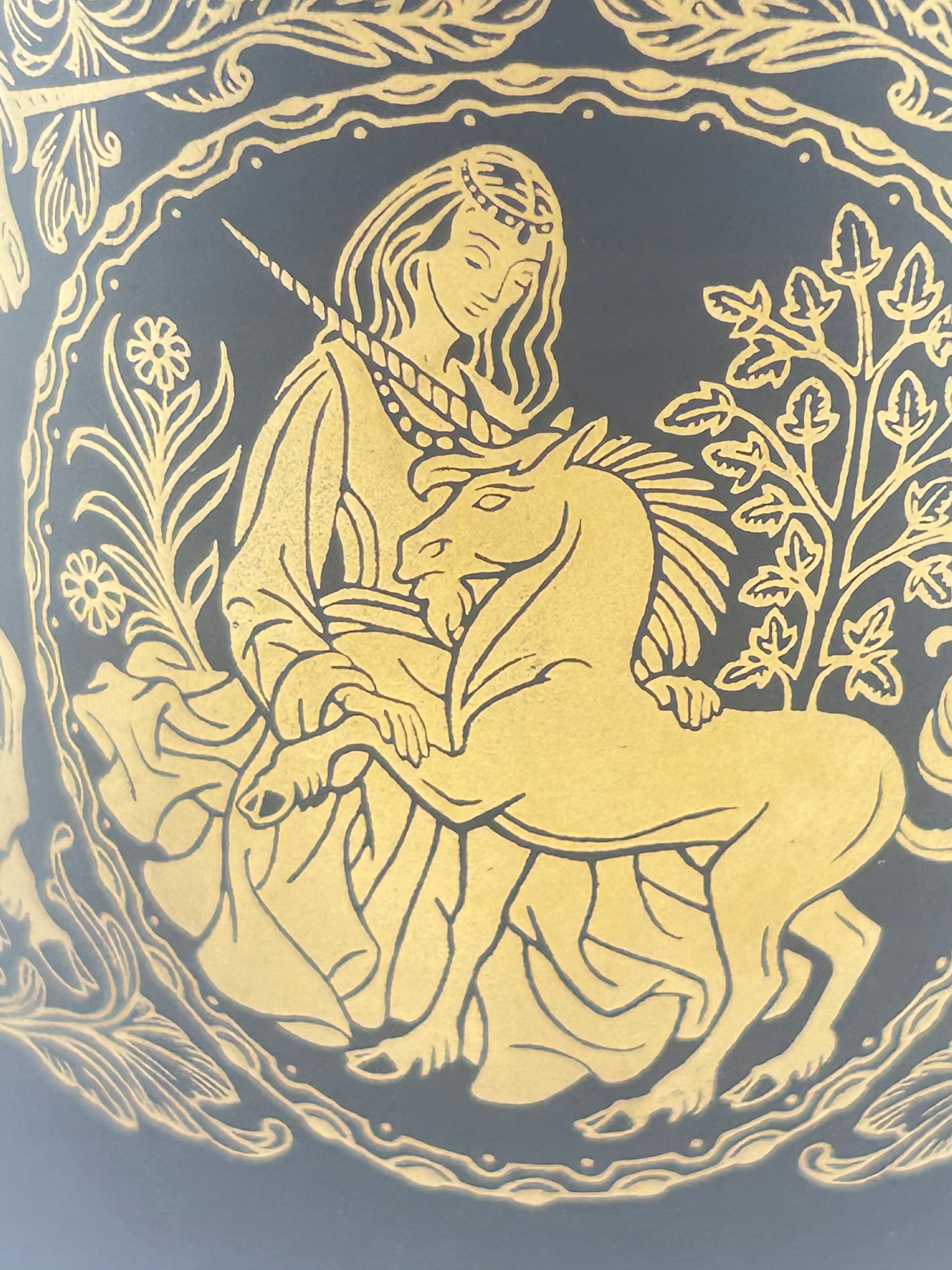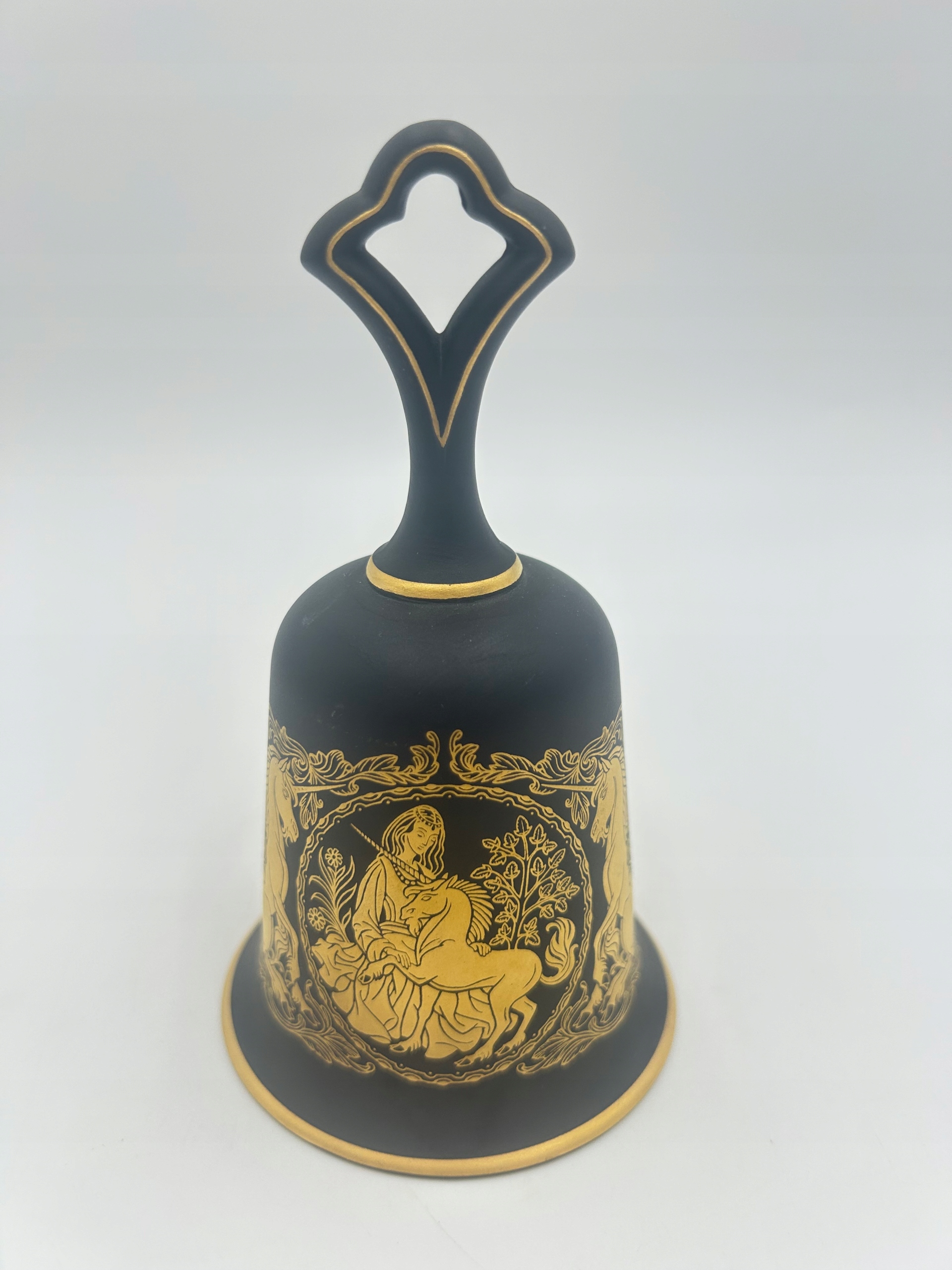 Тема продажи - очаровательный фарфоровый колокол, ссылочный номер фарфора Франклина. Сделано большое внимание к поддержанию деталей, сделанных из деликатного фарфора высочайшего качества. Финиш коврика. Богато украшенный - декоративный мотив - женщина с единорогом, позолоченными краями. Декоративная ручка, которая дает вам возможность приостановить. Элегантный декоративный предмет станет украшением любого сайта и украшения на столах.