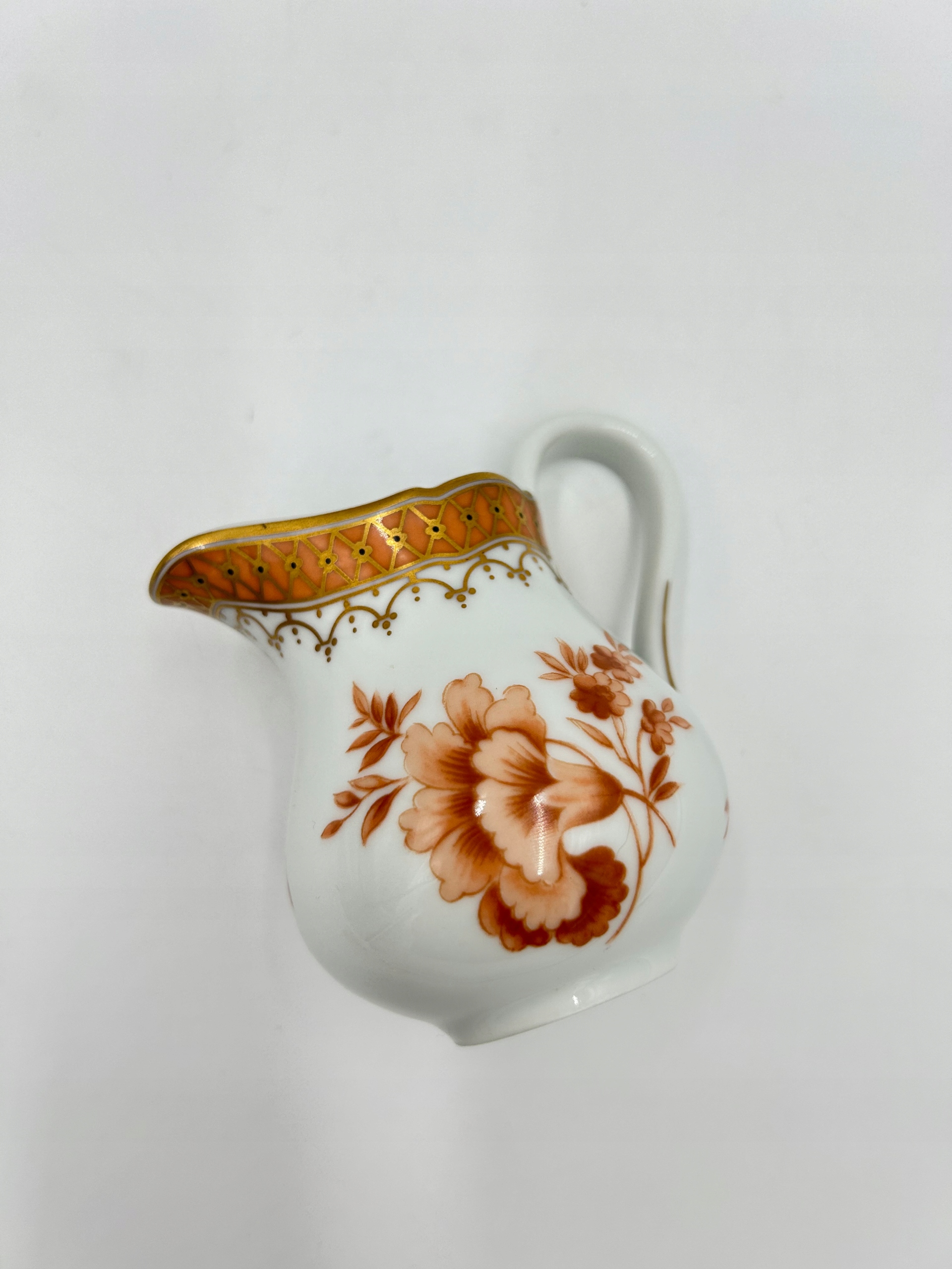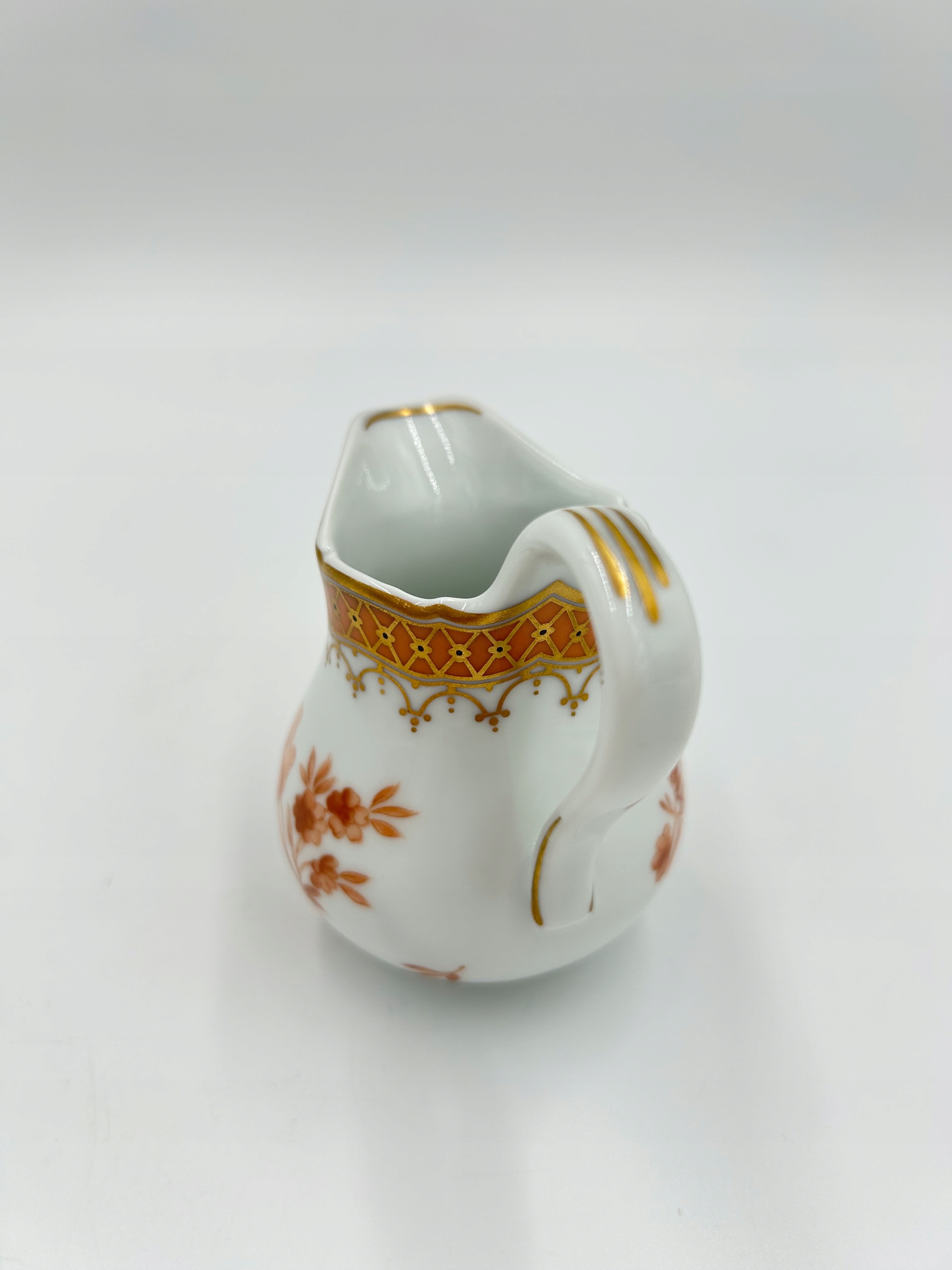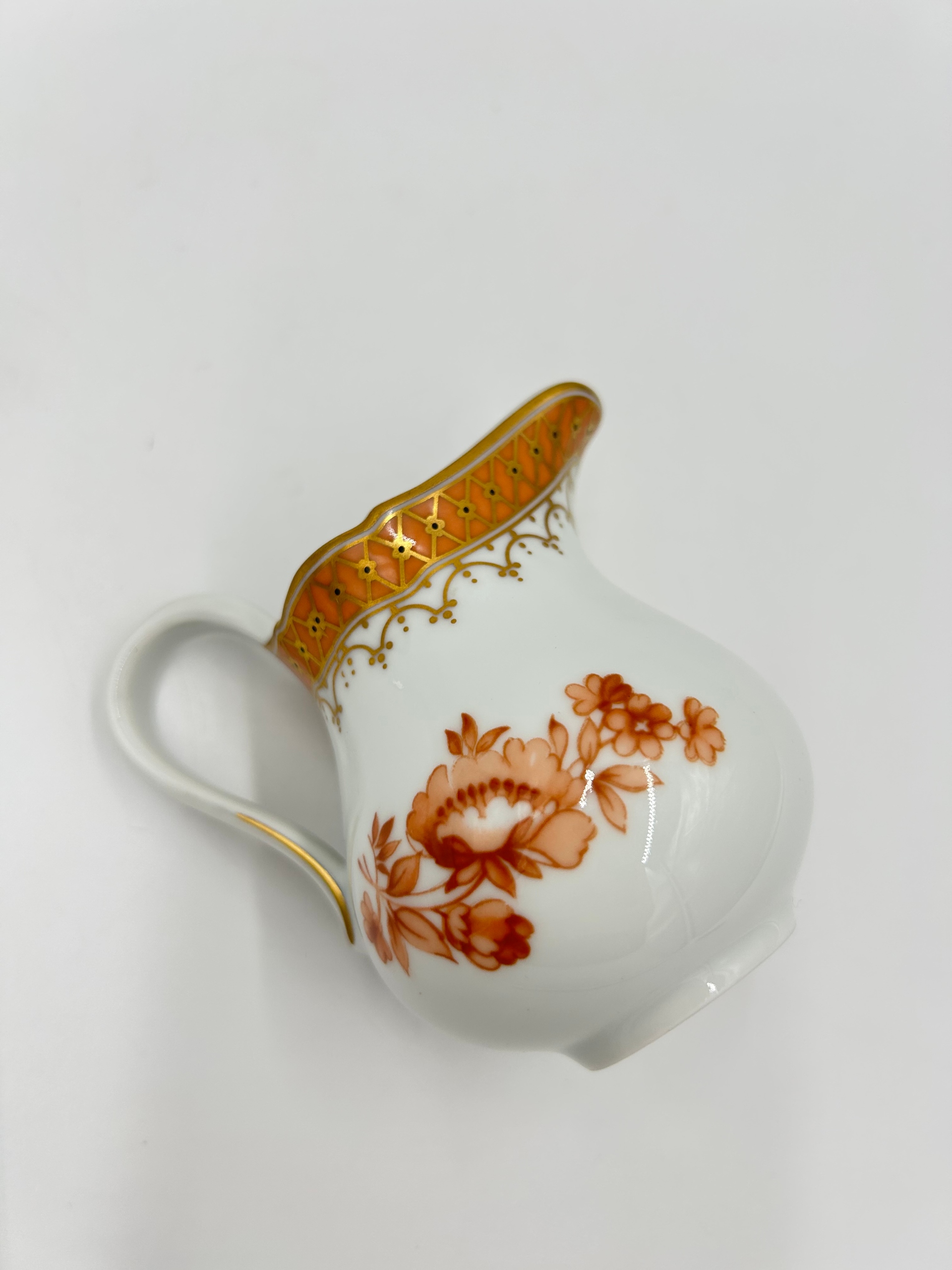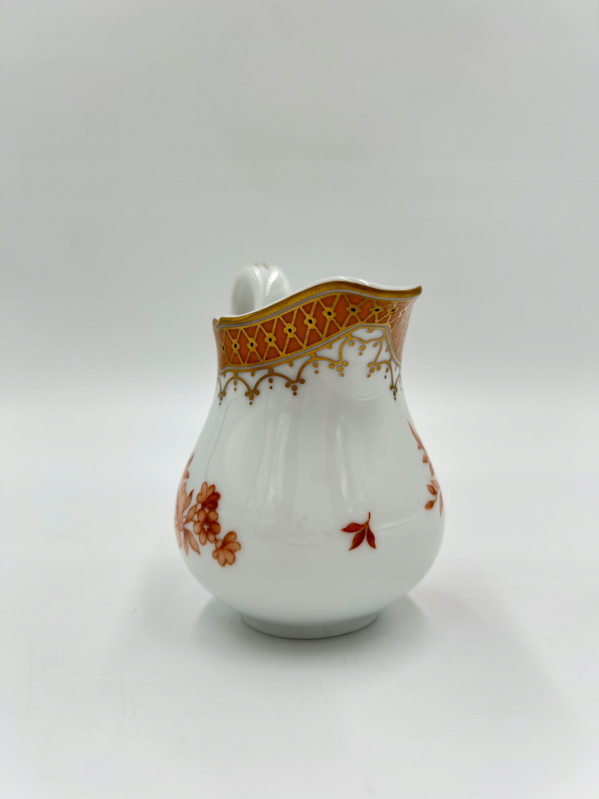 Предмет продажи — элегантный молочник. Изготовлен с большим вниманием к деталям, выполнен из нежного фарфора высочайшего качества. Украшен кирпично-оранжевым цветочным мотивом и золотым орнаментом. Уникальный декоративный элемент для людей, ценящих элегантность и гармонию. Ценная коллекционная вещь.