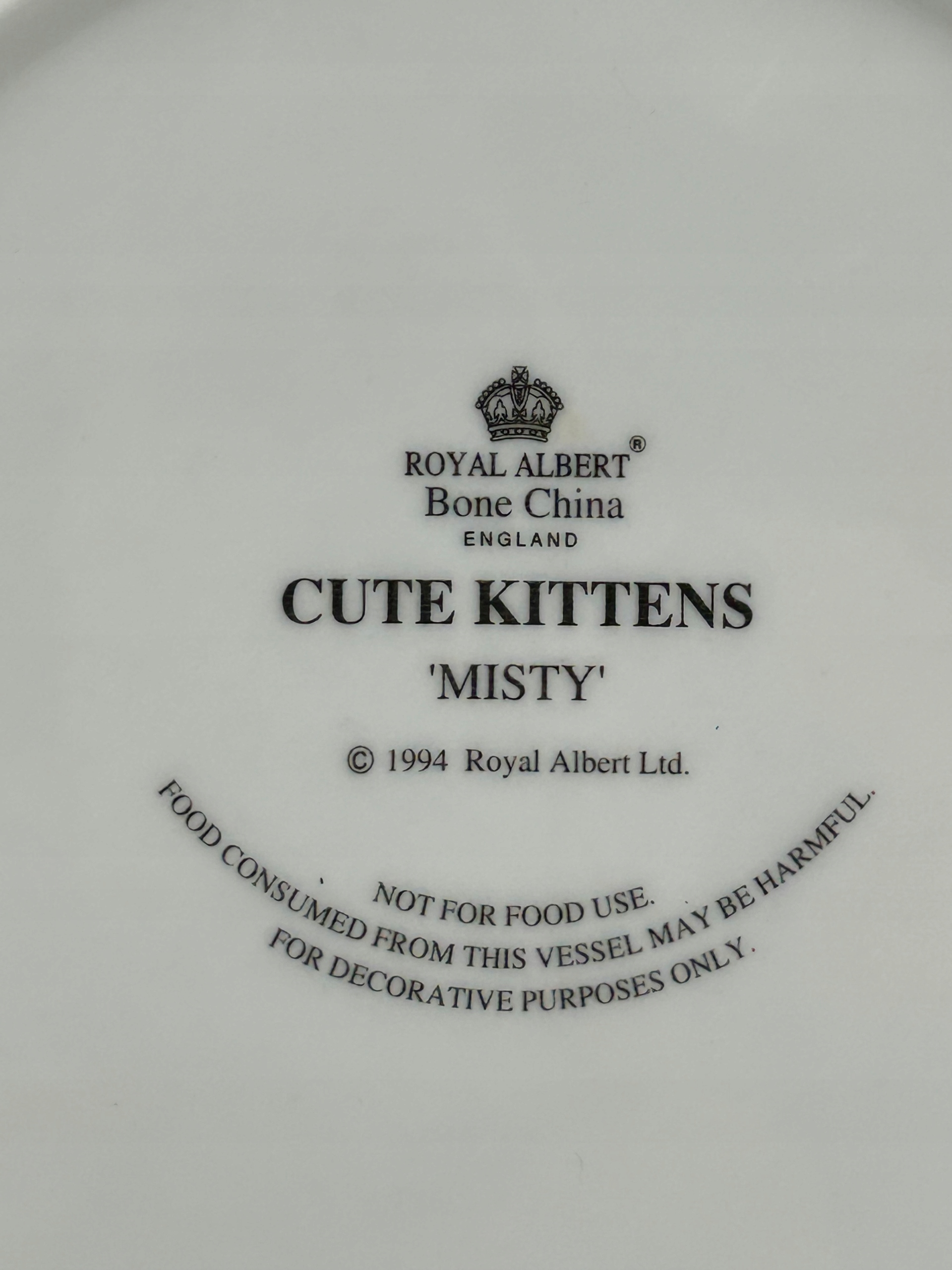 Тема продажи - Королевская тарелка Королевского Альберта из «Милых котят» - Misty Collection, изображает очаровательный маленький котенок. С его очарованием он фокусируется на своем внимании, представляя уютную семейную атмосферу в интерьере. Тонкий декоративный элемент для людей, которые ценят элегантность и гармонию цветов. Жемчужина английского любителя фарфора, ценная копия коллекционера