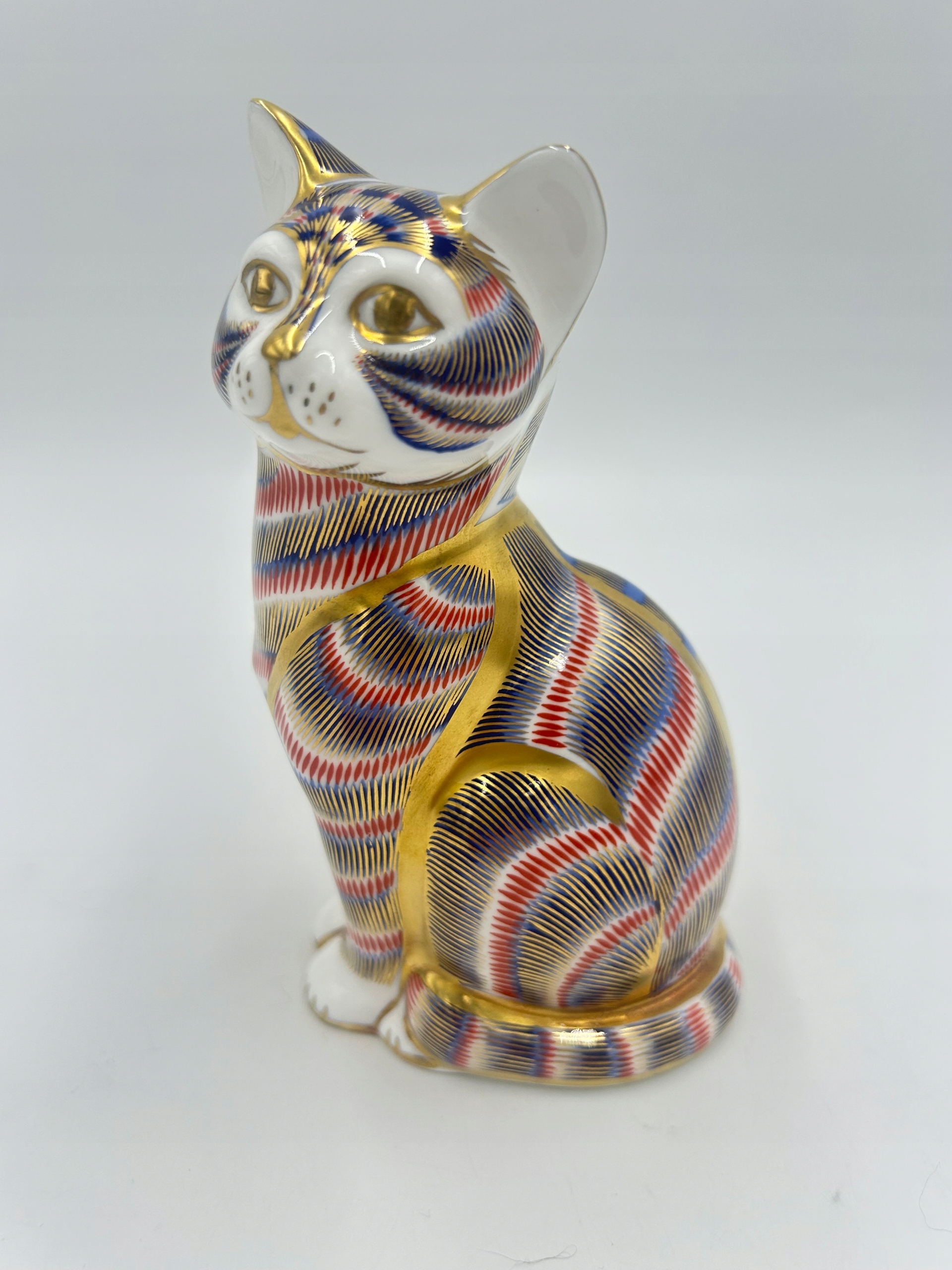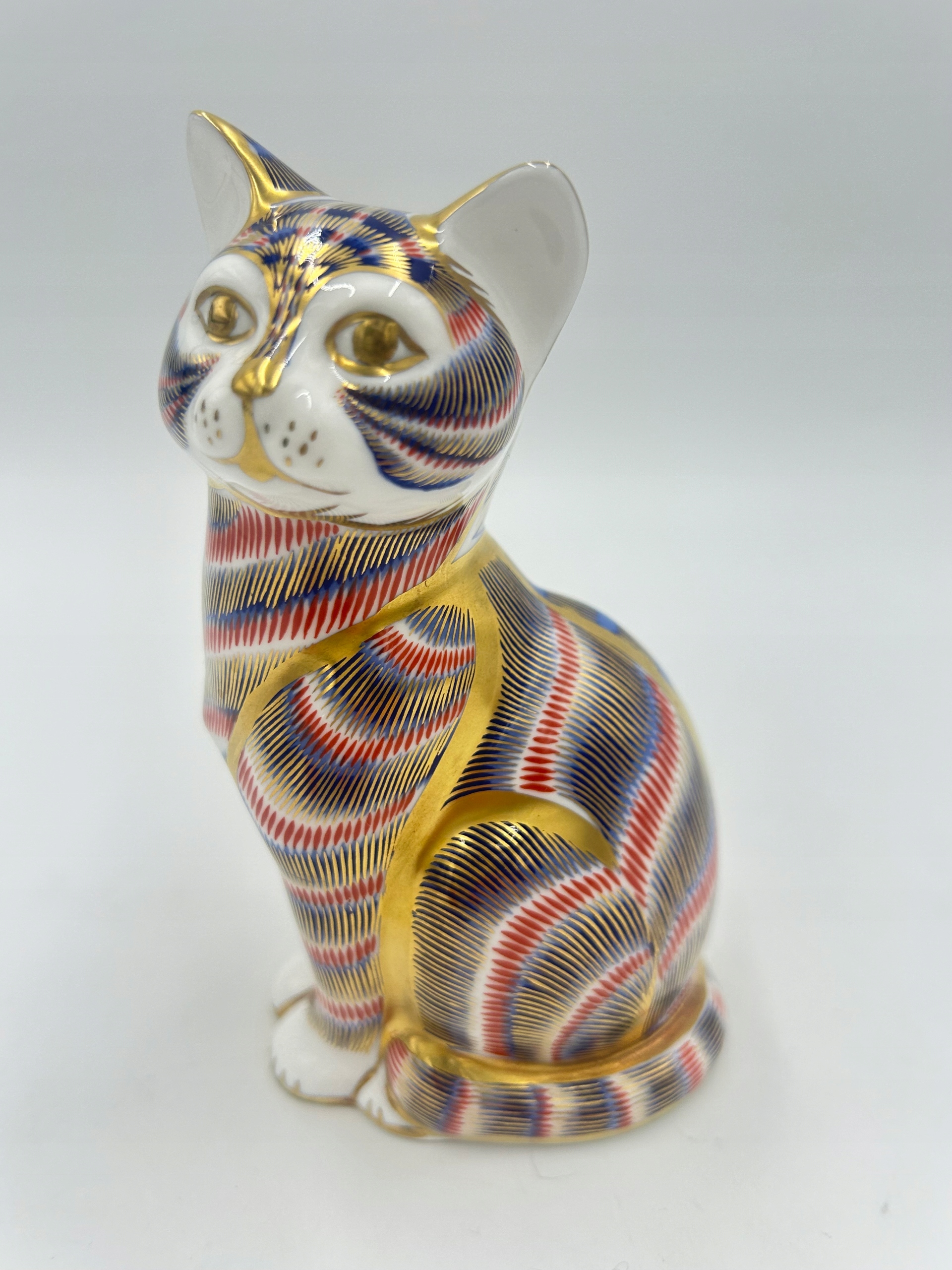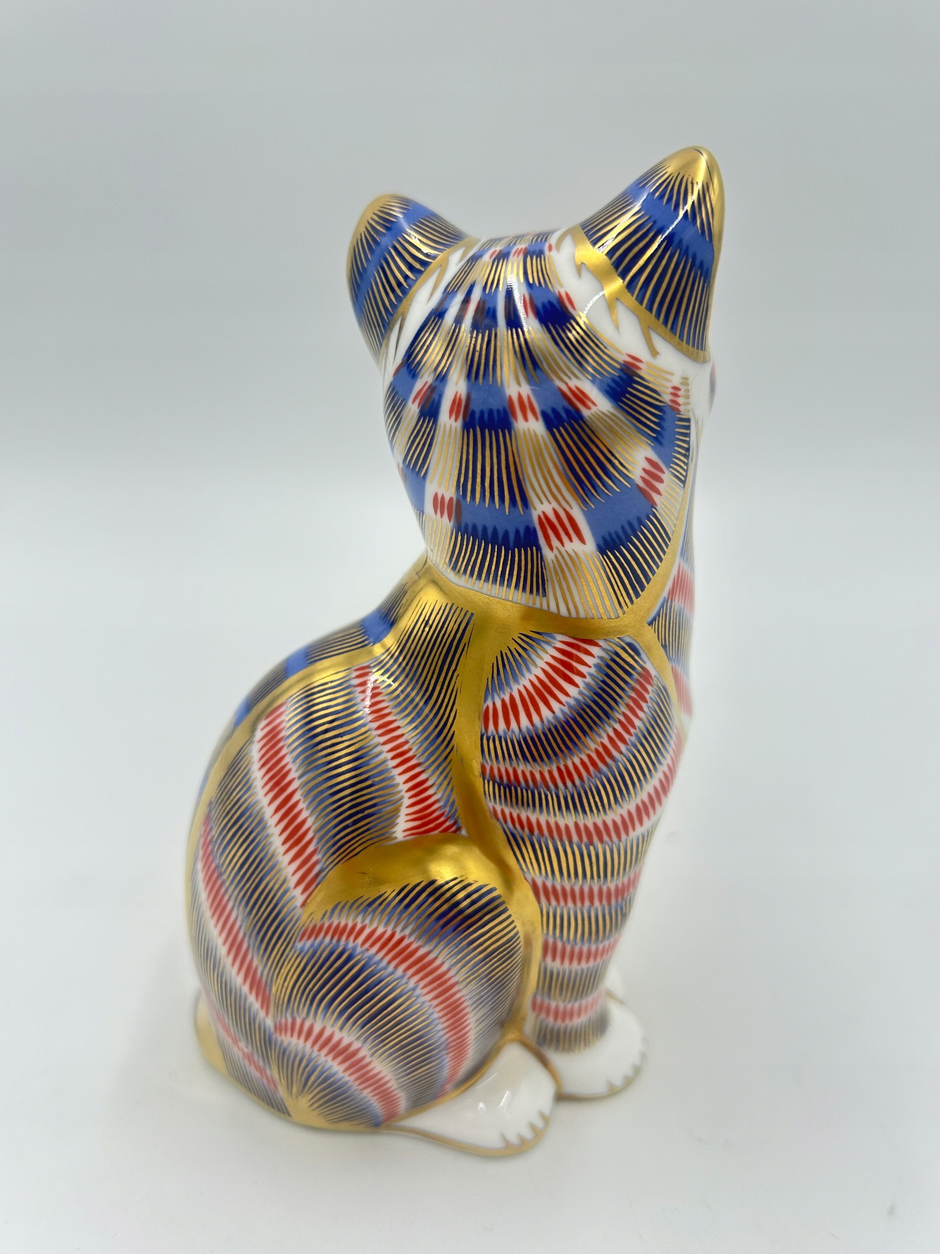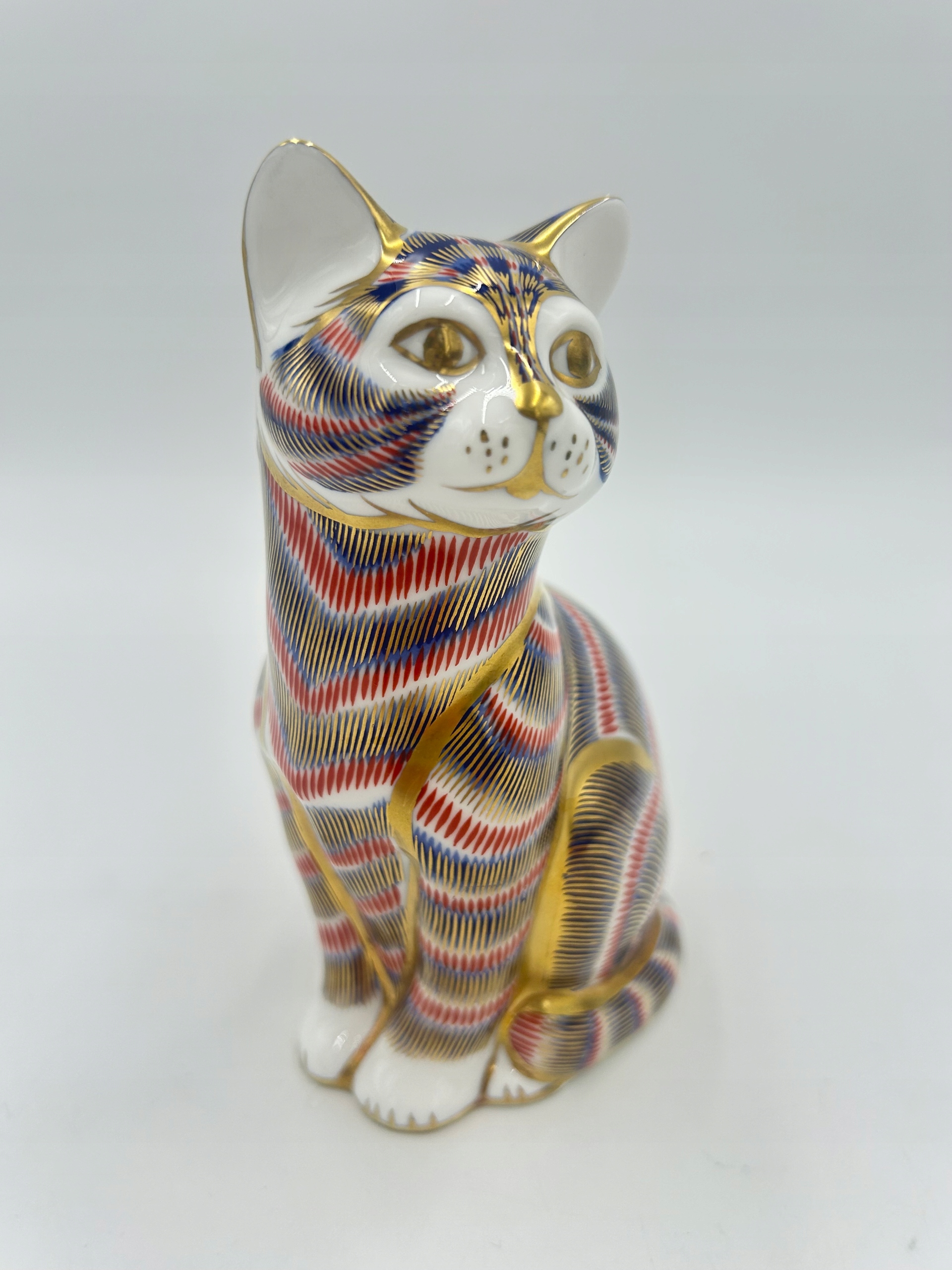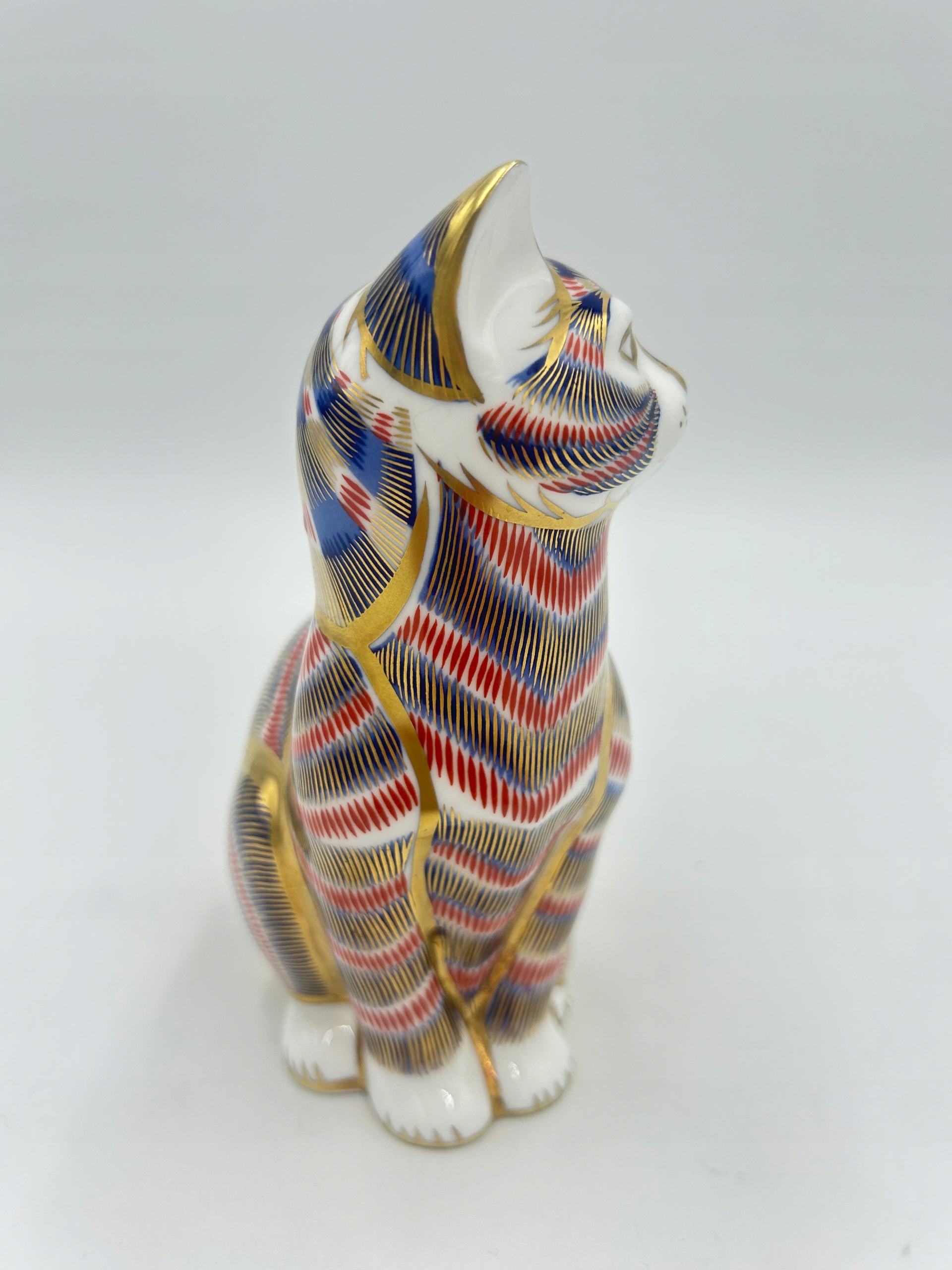 Тема продажи представляет собой элегантную фигурку, изображающую сидящую кошку - бумажные веса, кнопка из белого фарфора мастерской Королевское дерби Королев, , украшенная формулой imari. украшение, вдохновленное бывшим японским мотивом, в котором кобальт с красным и 22-каратным золотом был очень элегантно объединен.