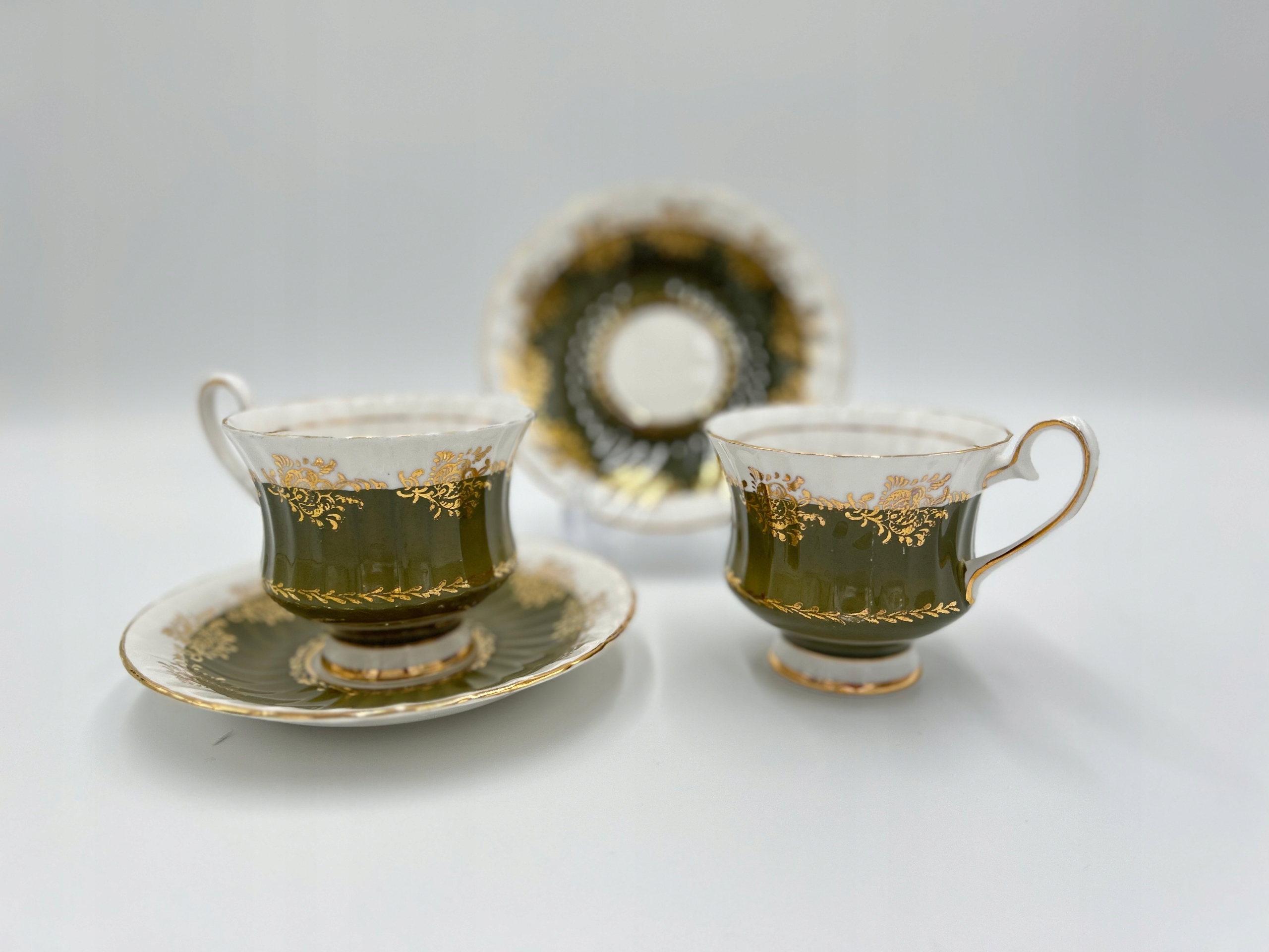 Тема продажи - очаровательные чашки с фарфоровыми соусами Royal Sutetherland Fine Bone China. Чашка с изысканной формой, сделанная из нежного оливкового фарфора, украшенная богато позолоченными цветочными мотивами.