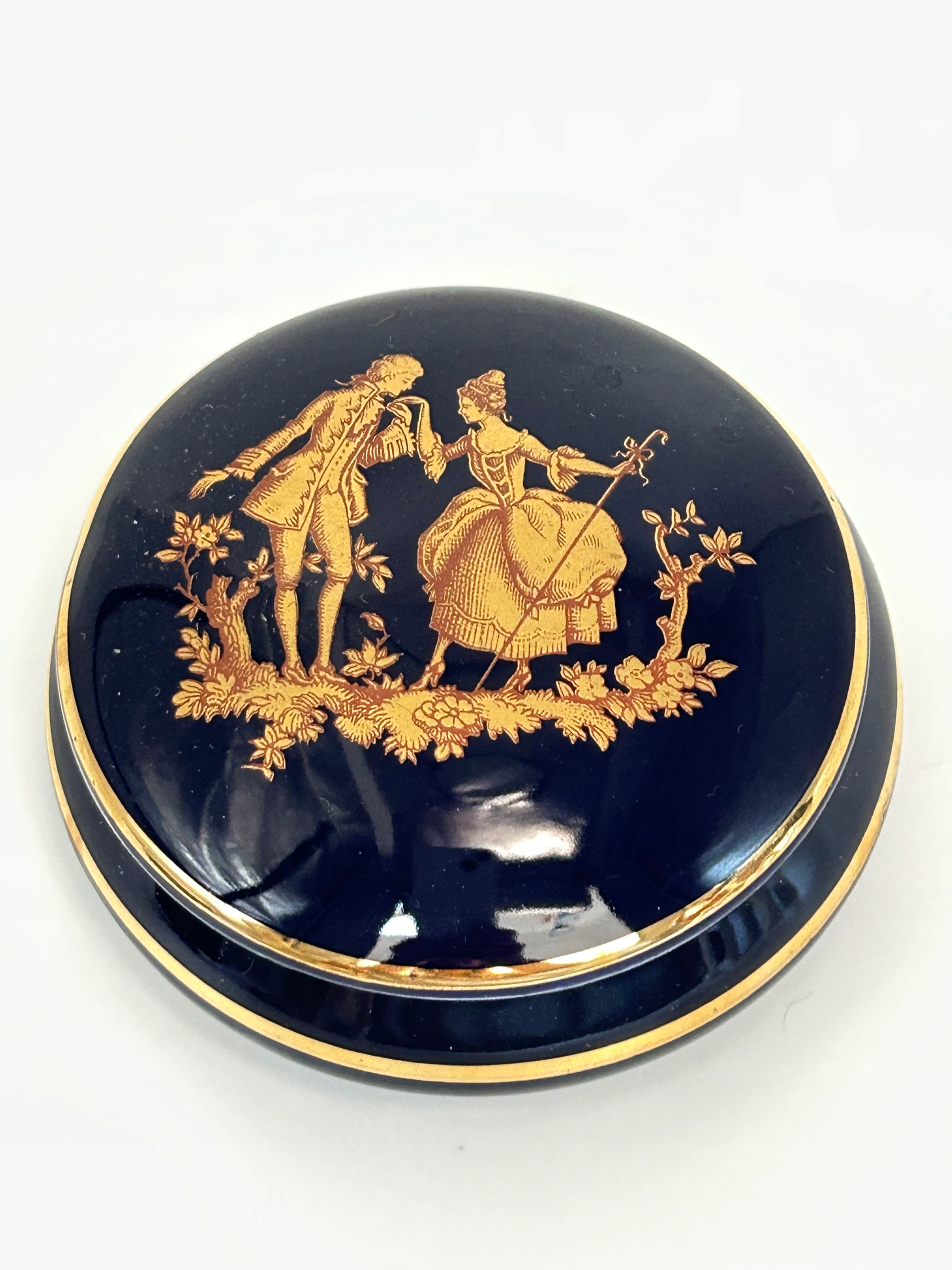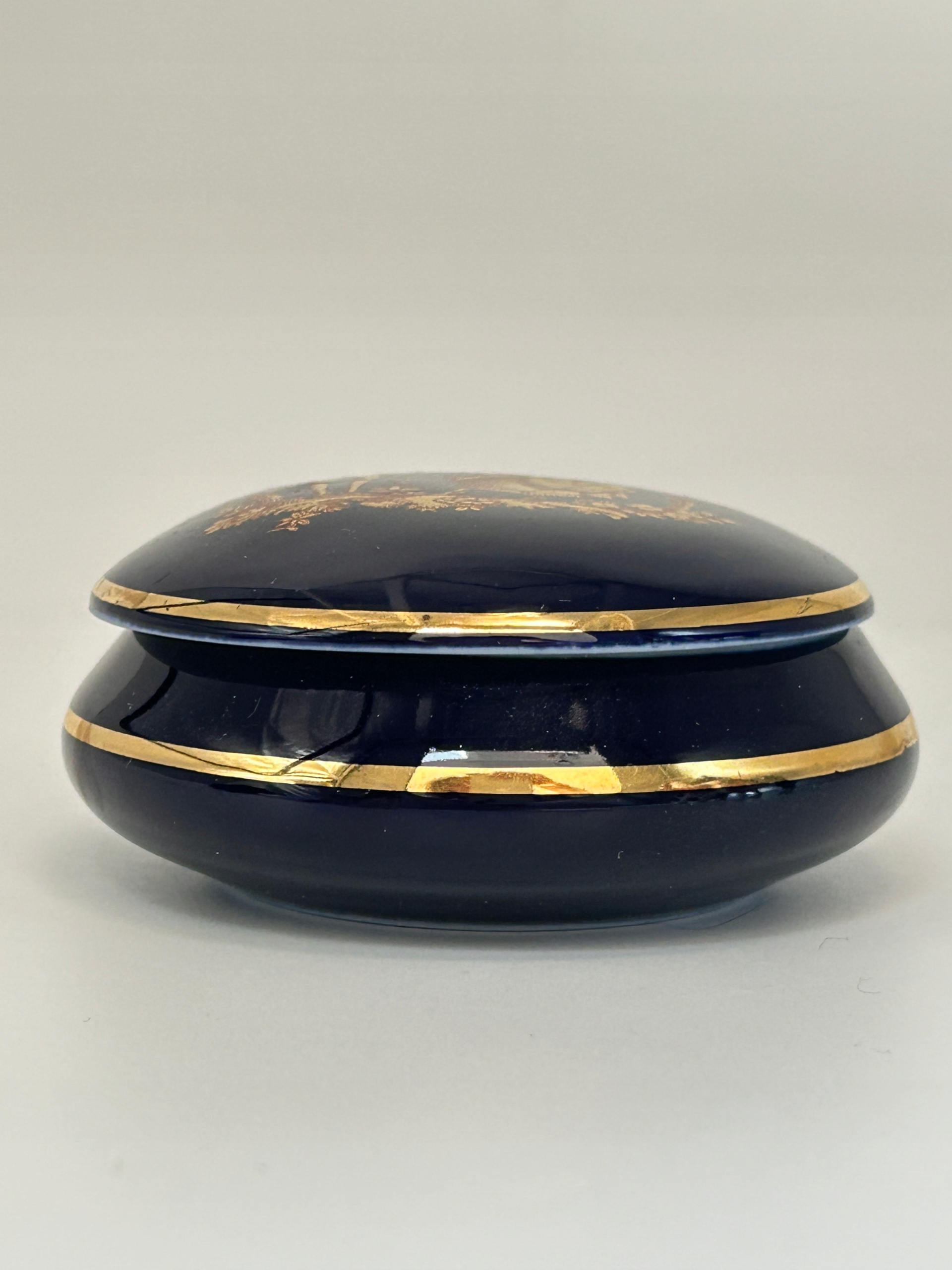 Тема продажи - красивая шкатулка из фарфоровых лимож. Сделано из высококачественного кобальтового фарфора, украшенный золотой сценой. Украшение сделано с большой точностью и сохранением. Уникальный декоративный предмет для людей, которые ценят элегантность, идеально подходят для подарочного подарка для любимого человека или обогатить полку коллекционера.
