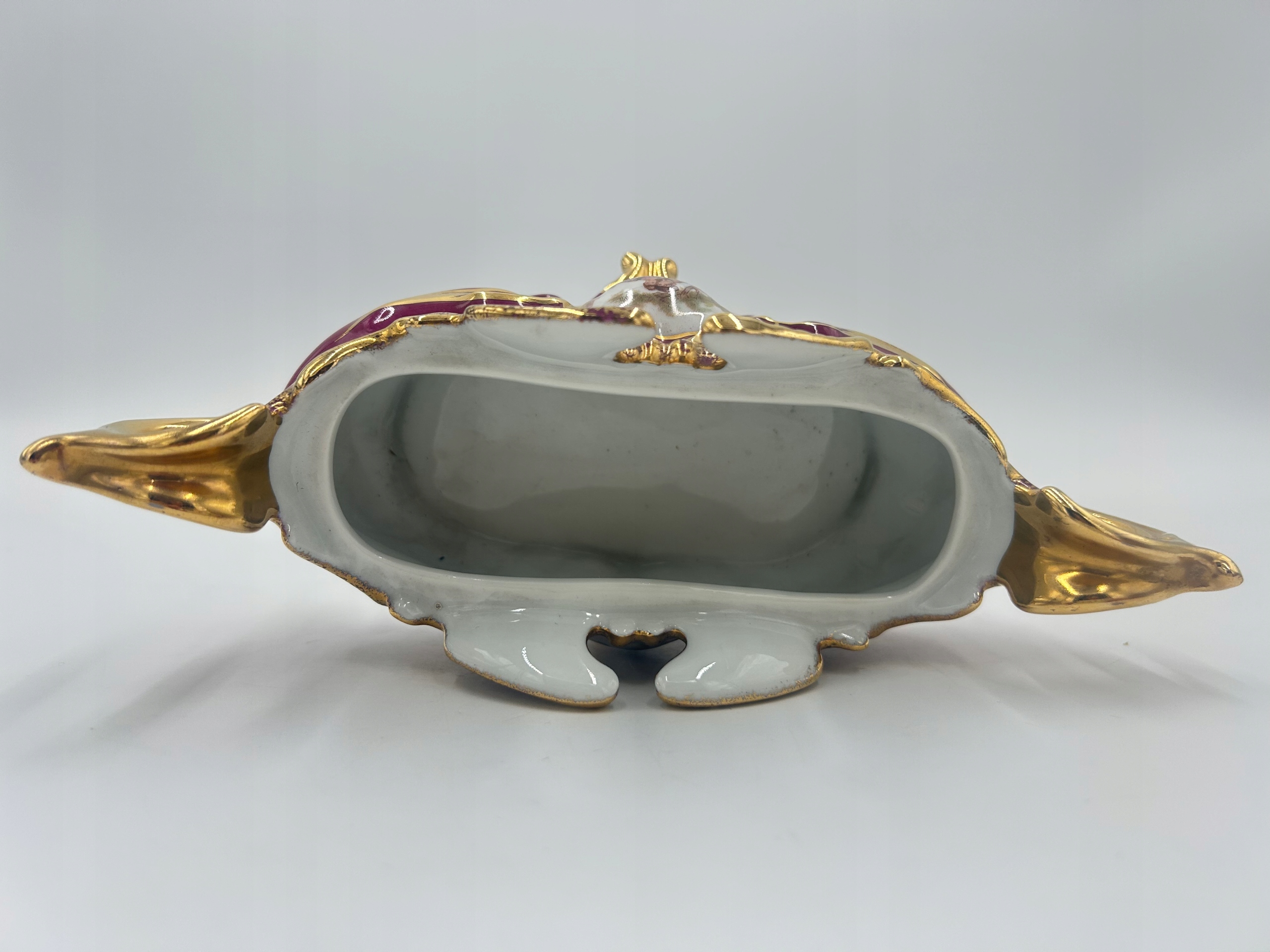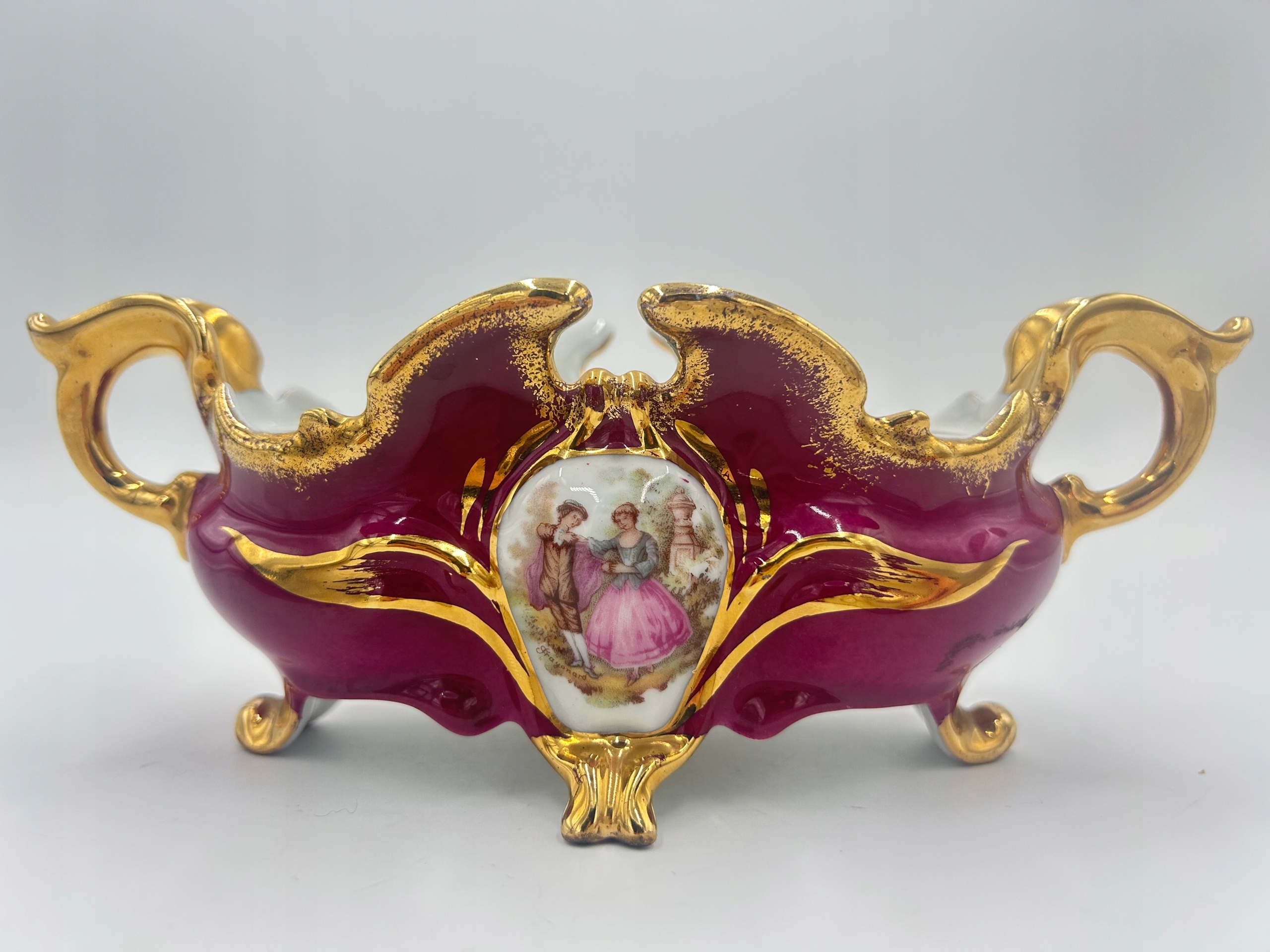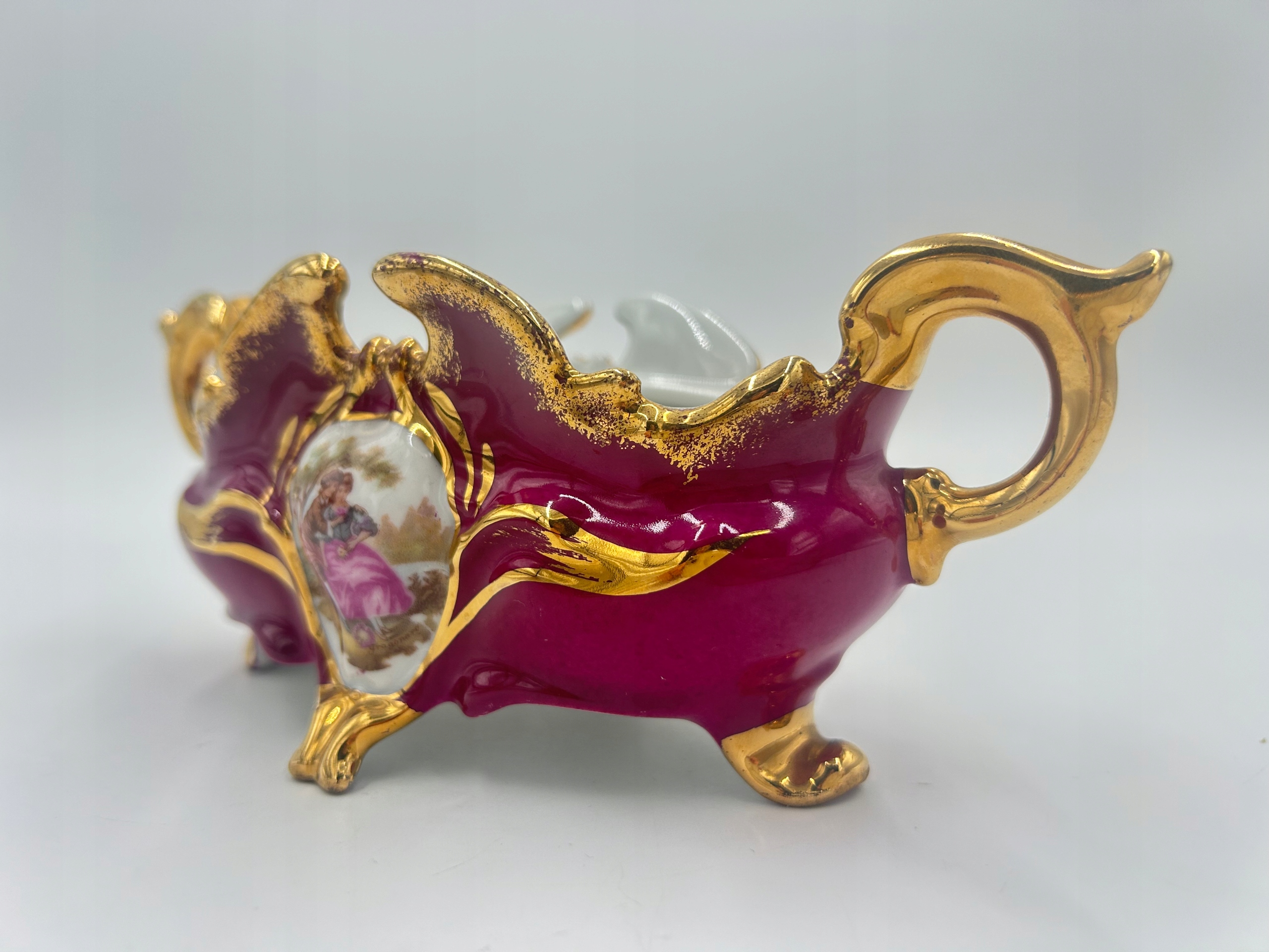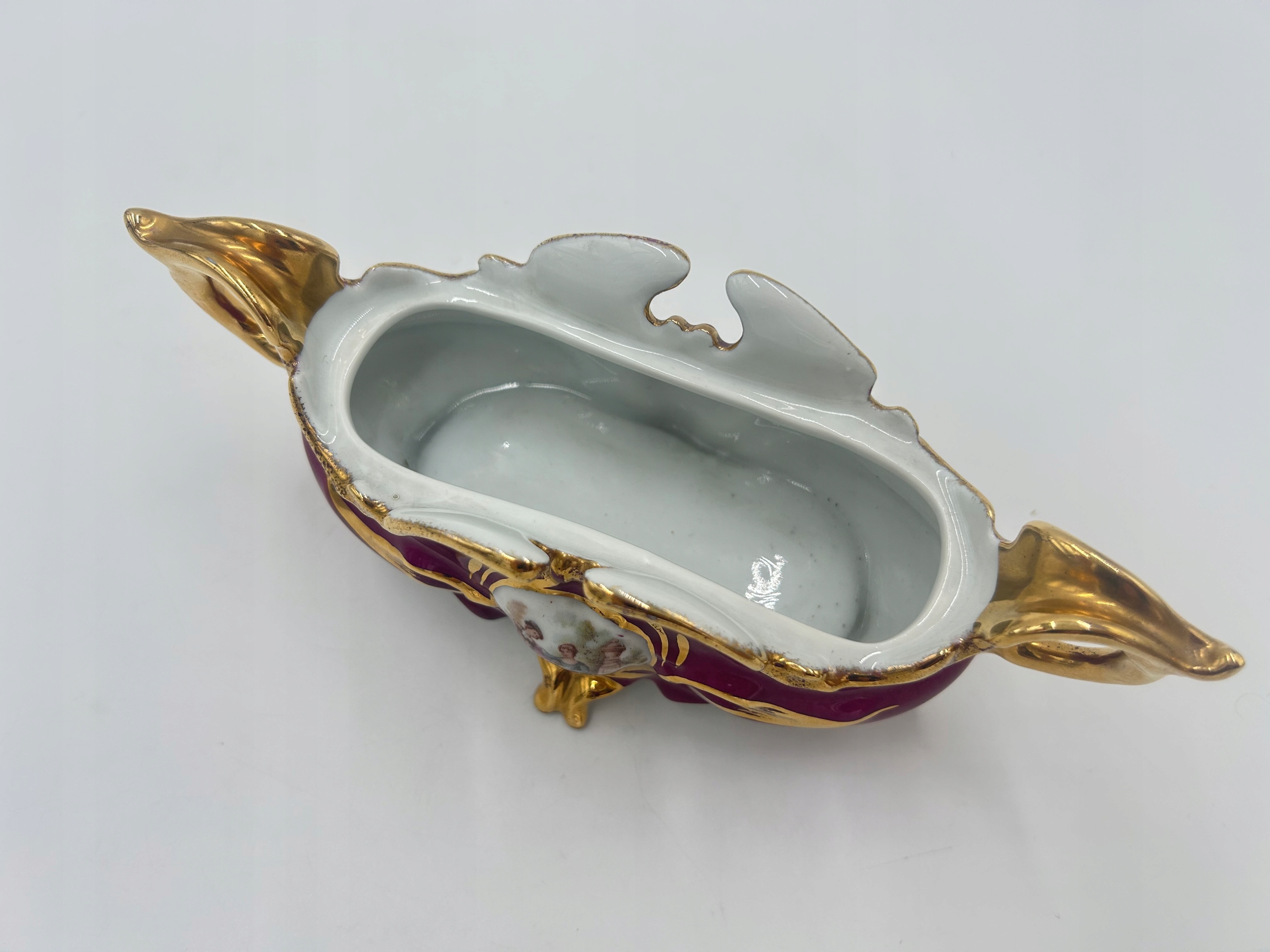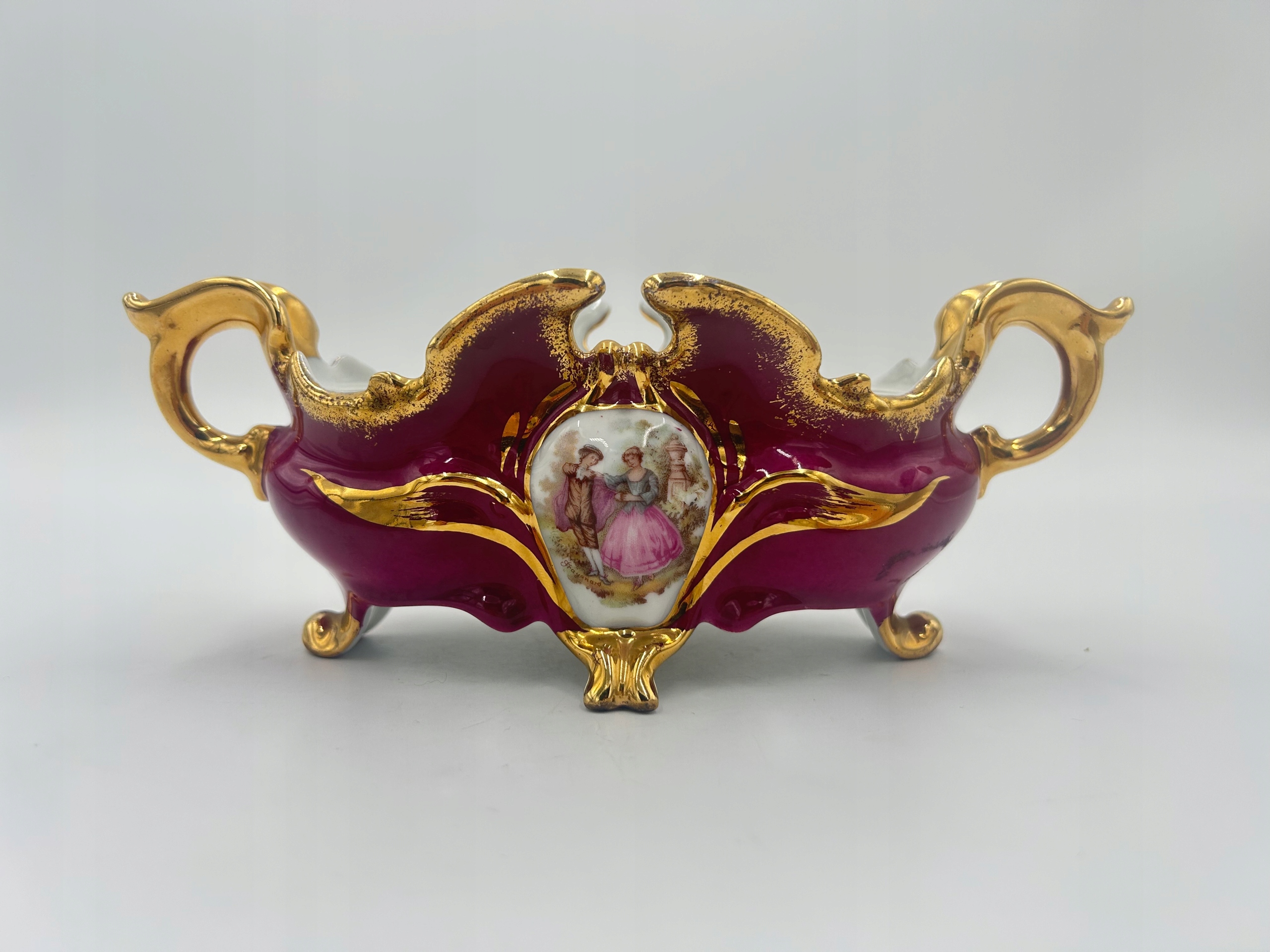 Предмет продажи — уникальная фарфоровая миска и тарелка на ножках лиможской фабрики. Изготовлен из высококачественного фарфора и ярко декорирован. Глубокий бордовый цвет и золотые детали придают элегантность и уникальность. Взор приковывает центральное украшение – овальный медальон с романтической жанровой сценой, изображающей семейную пару в идиллической обстановке.