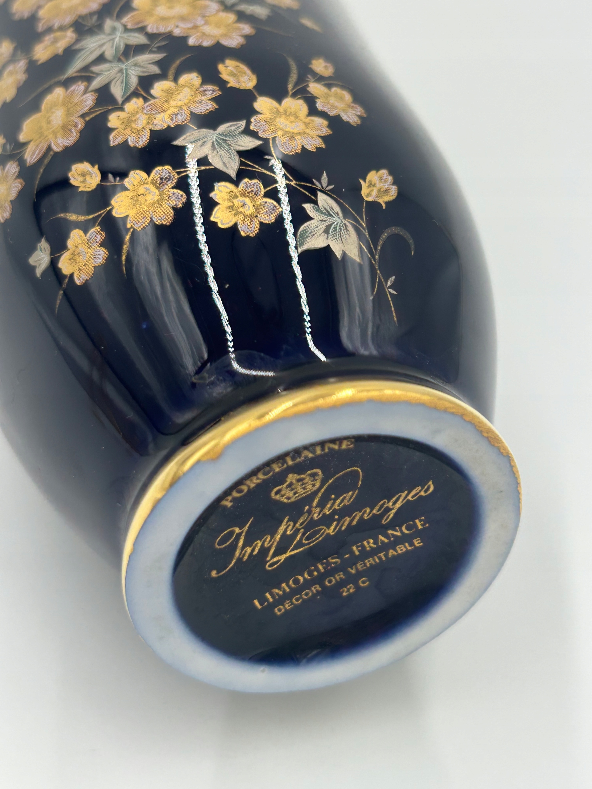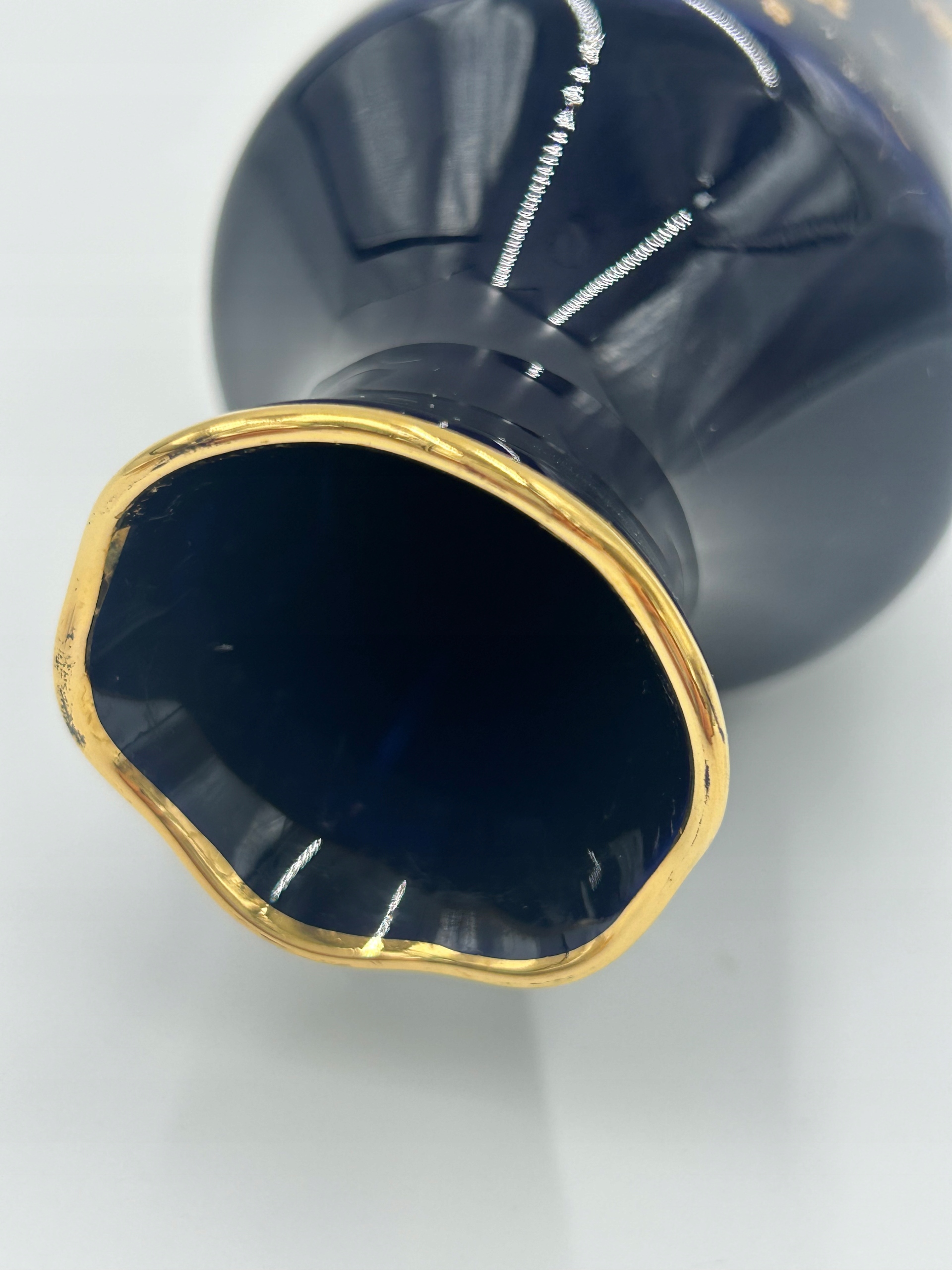 Объект продажи - декоративная ваза из знаменитого французского производства limoges . Кобальтовая ваза, украшенная золотистыми цветами и золотыми украшениями. Я рекомендую красивый декоративный предмет, ценную копию коллекционера.
