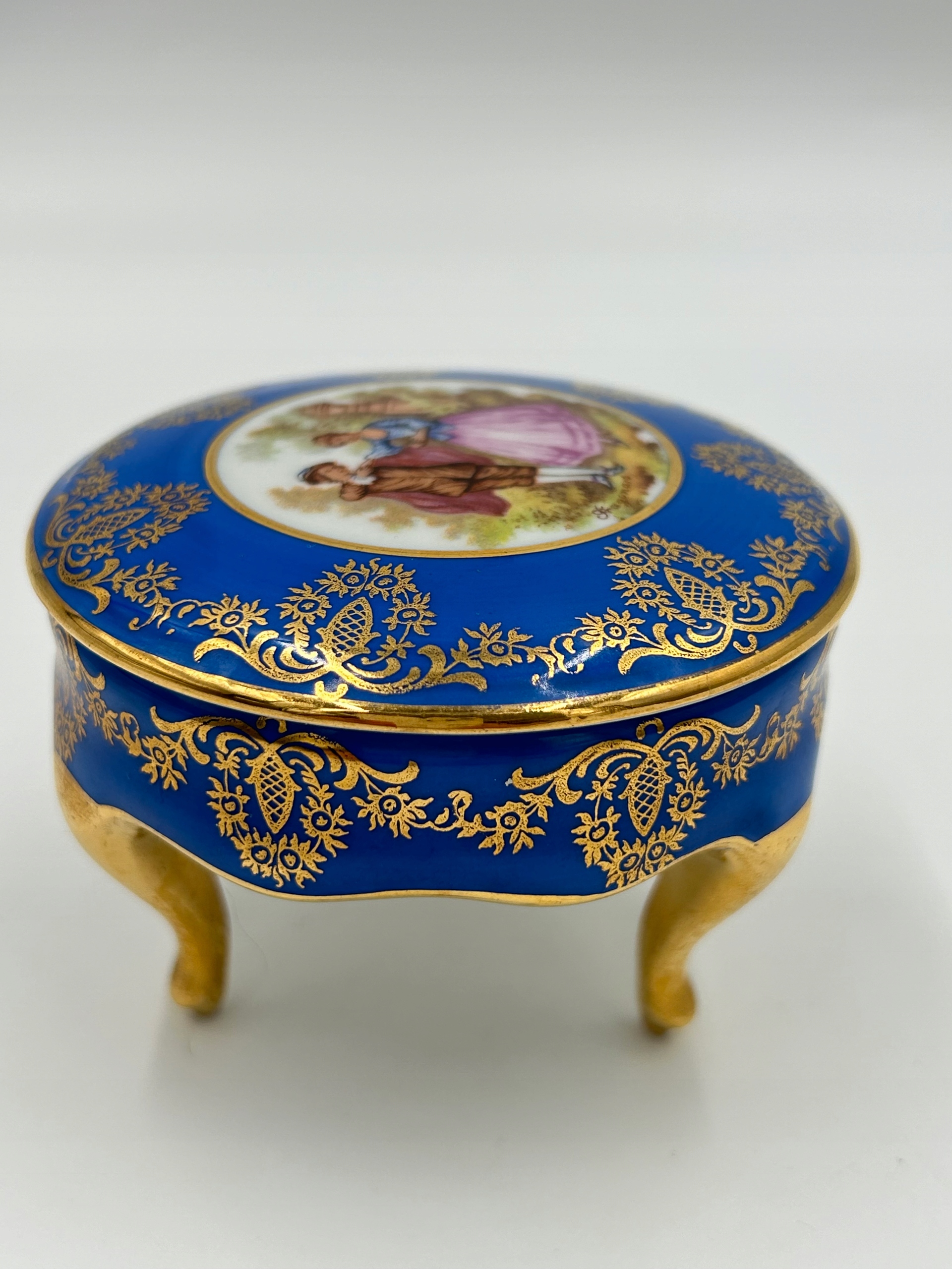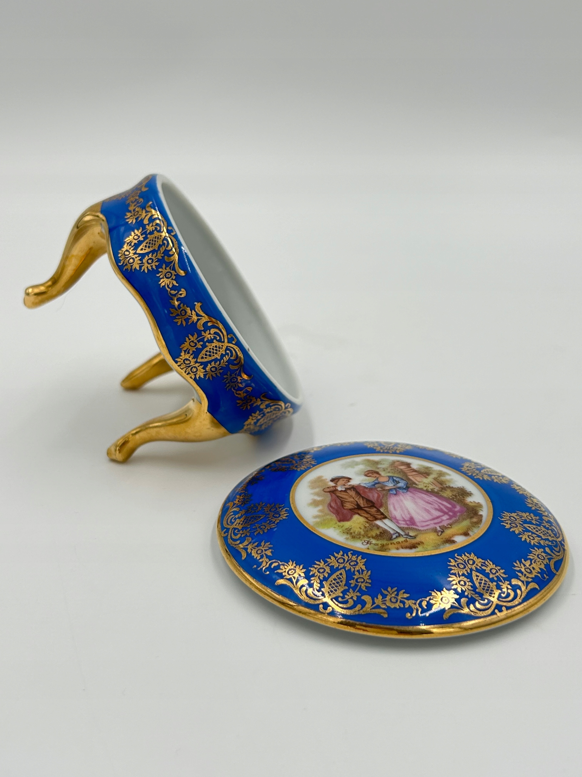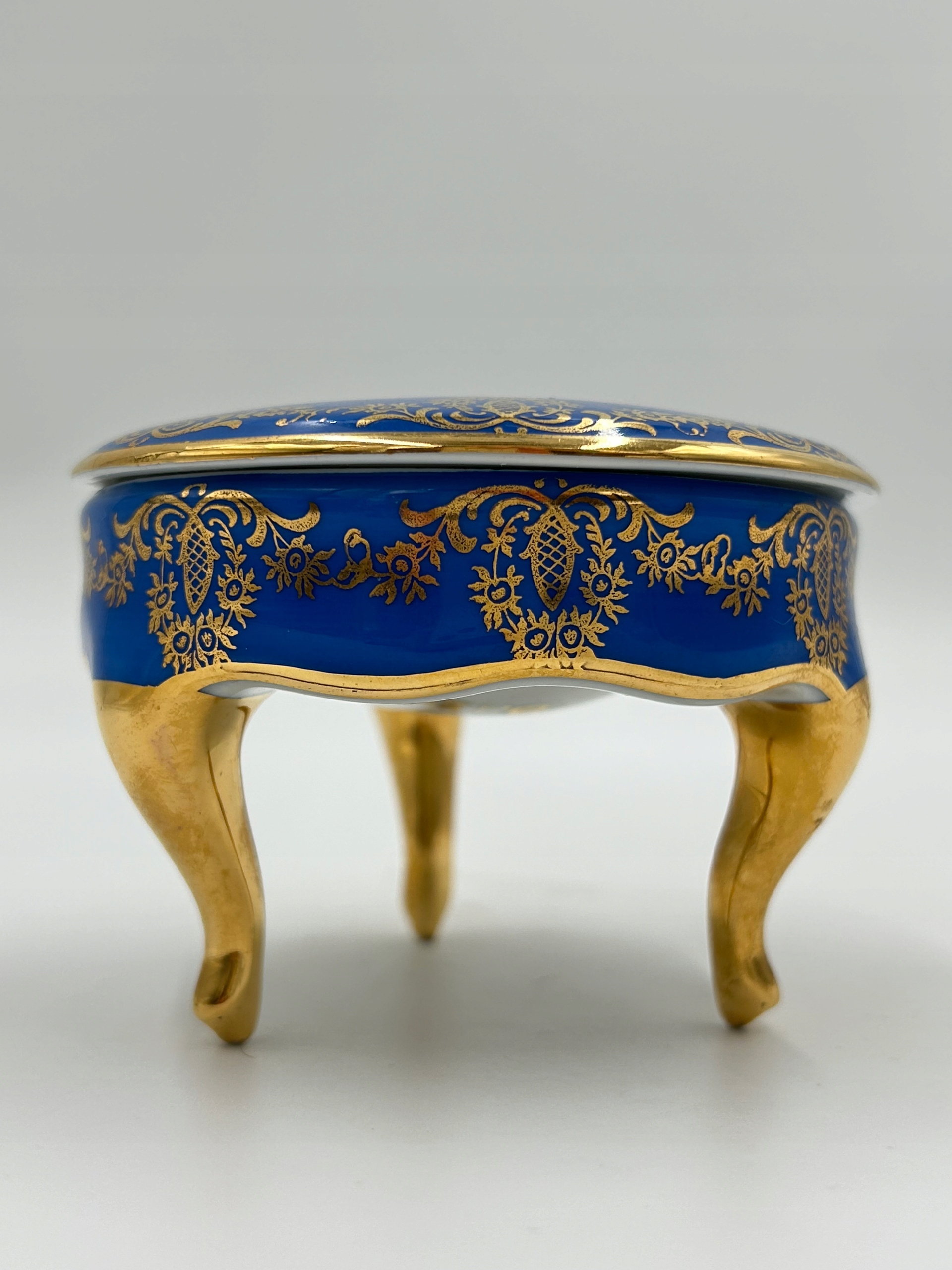 Предмет продажи — красивая шкатулка из лиможского фарфора. Выполнена из фарфора цвета кобальта, украшена кулисой золотого цвета, край позолочен. На трех причудливых позолоченных ножках. Оформлен с большой точностью и вниманием к деталям. Уникальный предмет декора для людей, ценящих элегантность. Идеально подходит в качестве подарка близкому человеку или для пополнения коллекционной полки.