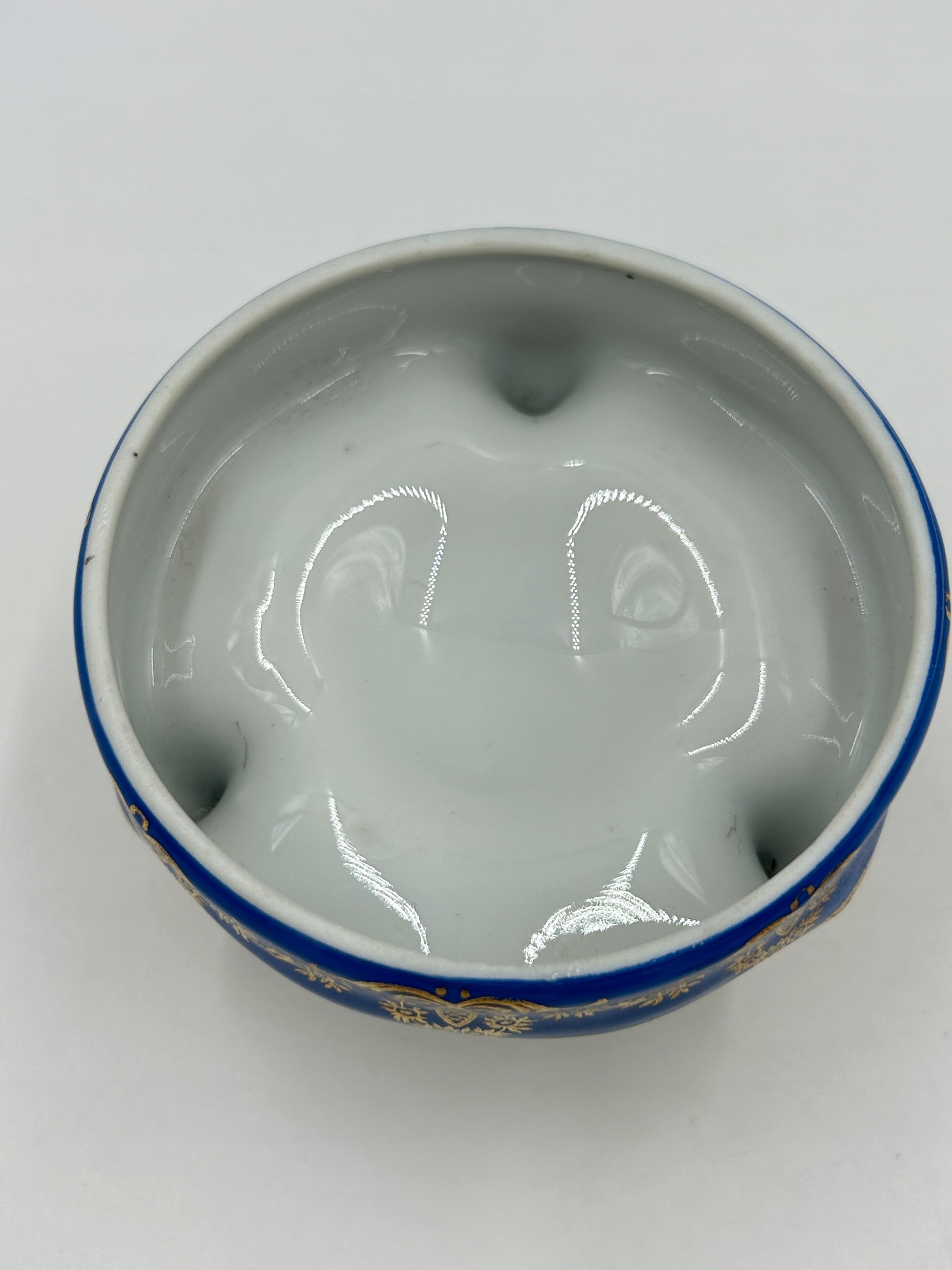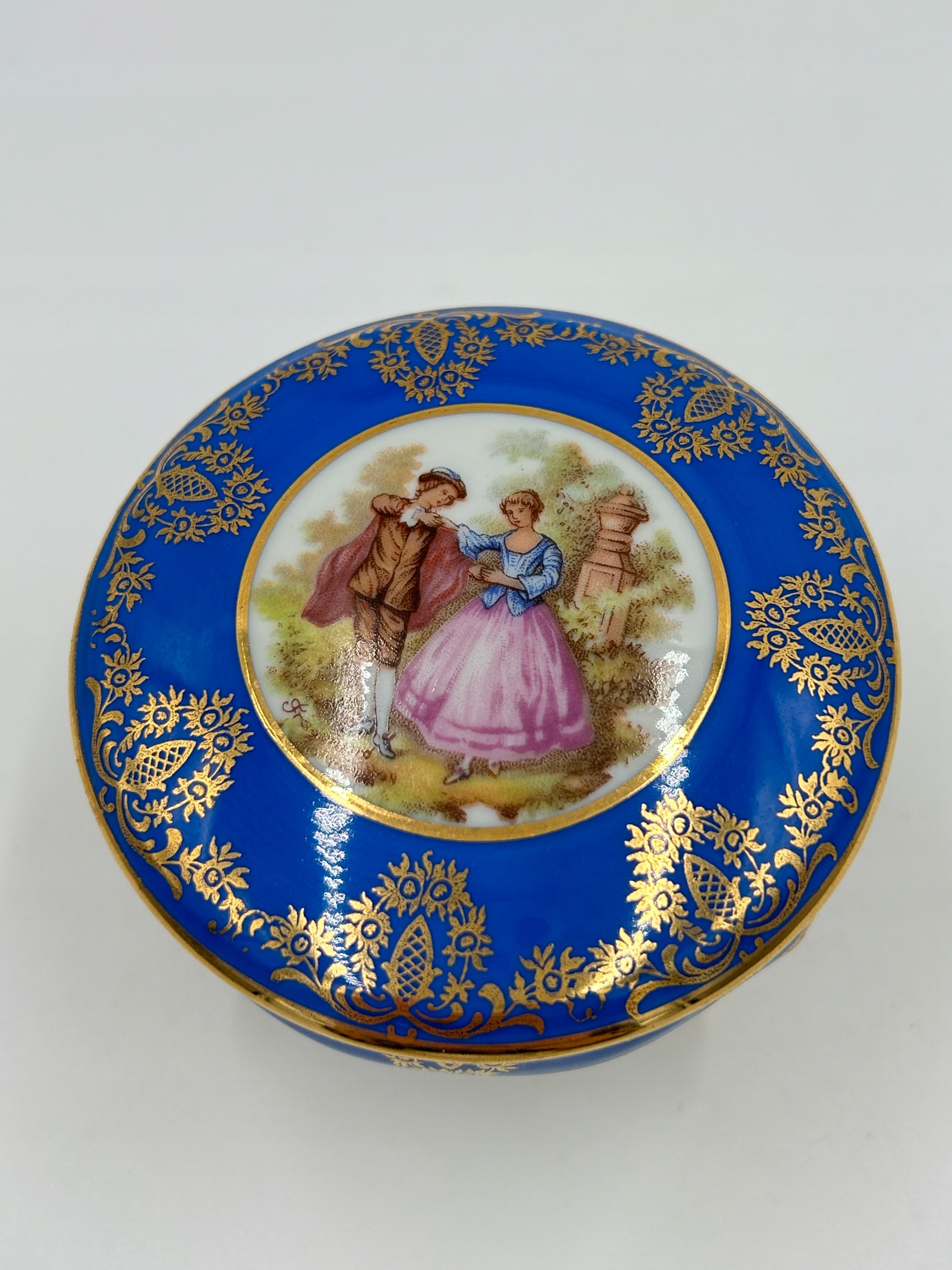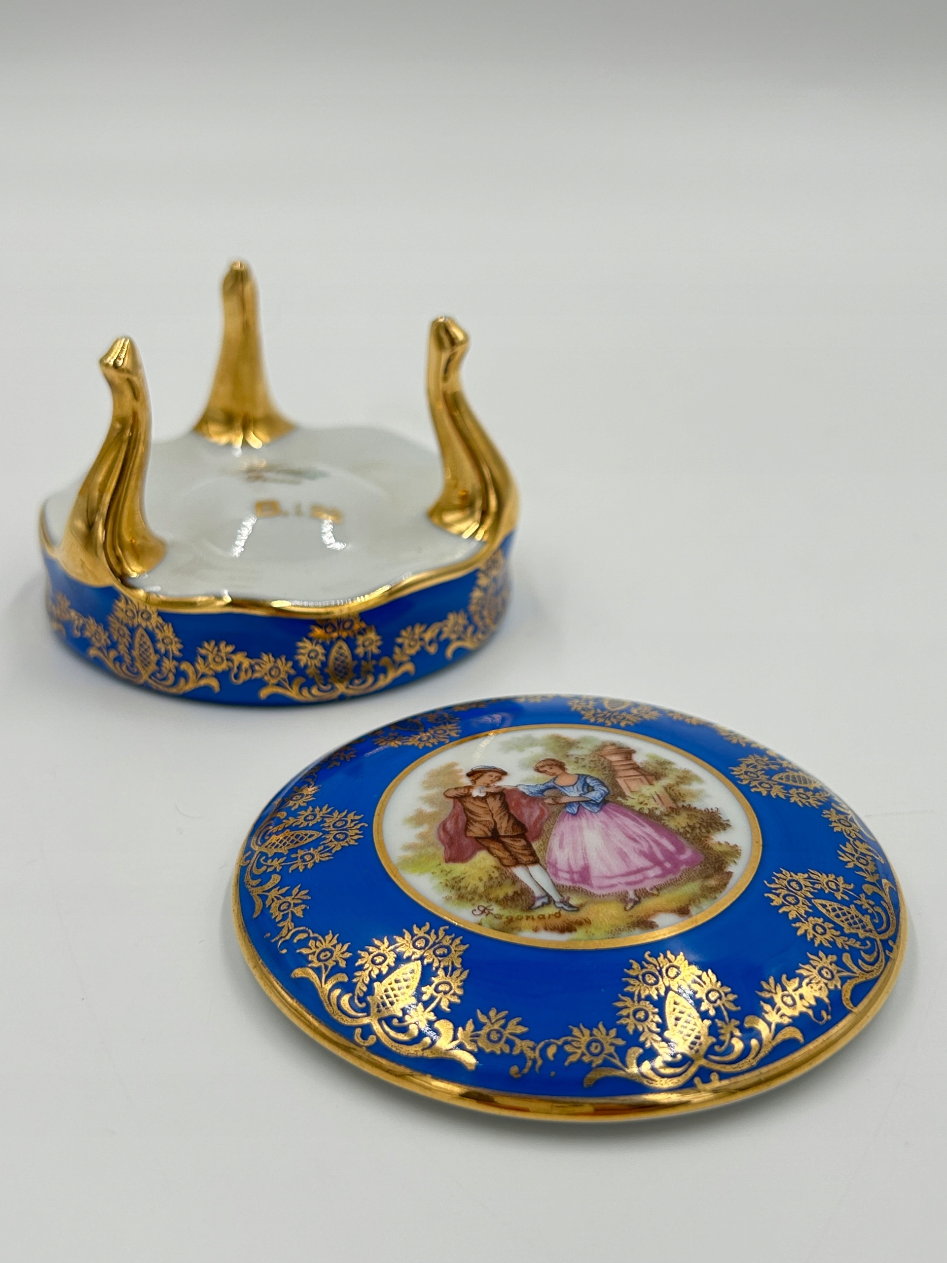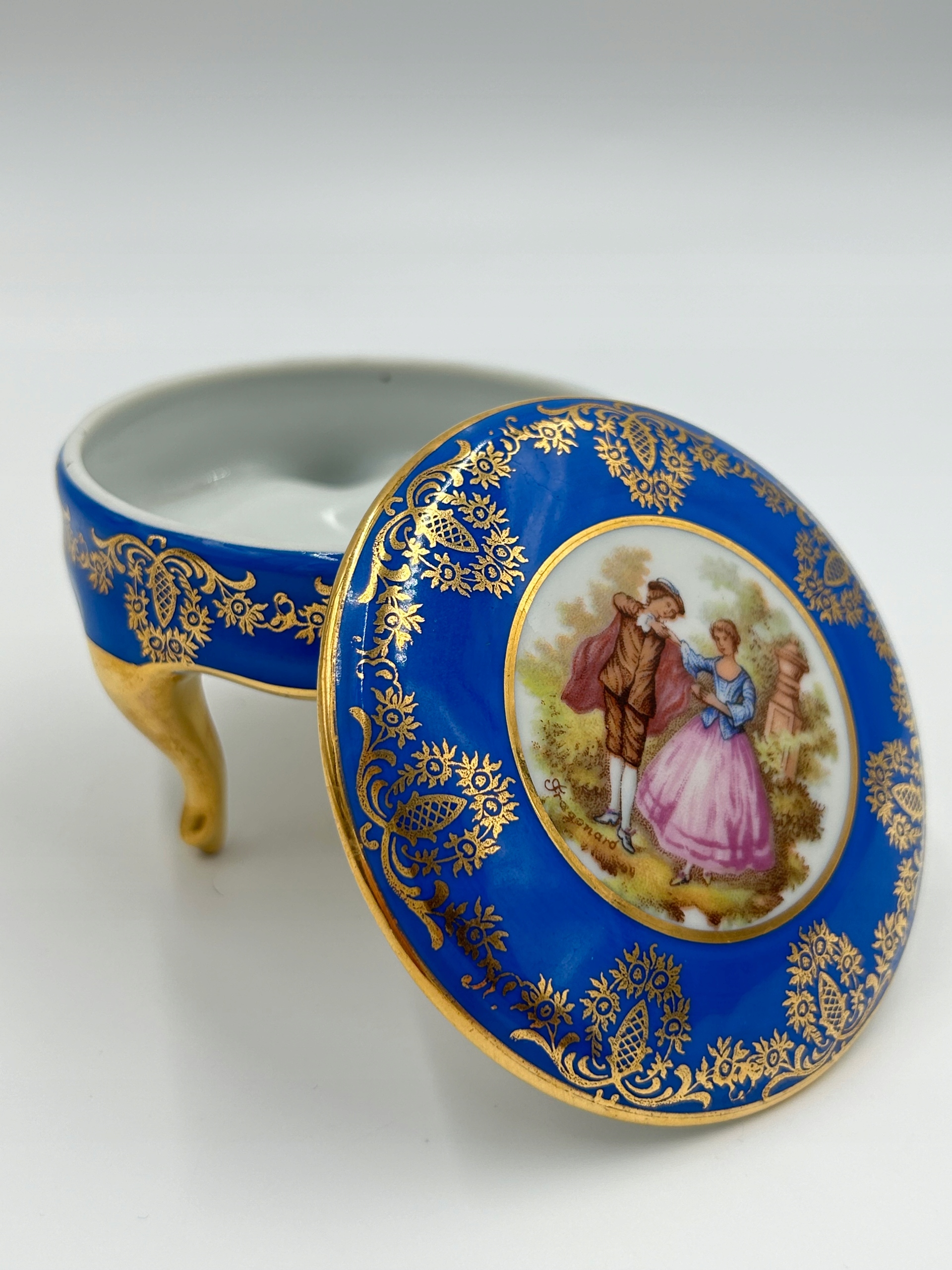 Предмет продажи — красивая шкатулка из лиможского фарфора. Выполнена из фарфора цвета кобальта, украшена кулисой золотого цвета, край позолочен. На трех причудливых позолоченных ножках. Оформлен с большой точностью и вниманием к деталям. Уникальный предмет декора для людей, ценящих элегантность. Идеально подходит в качестве подарка близкому человеку или для пополнения коллекционной полки.