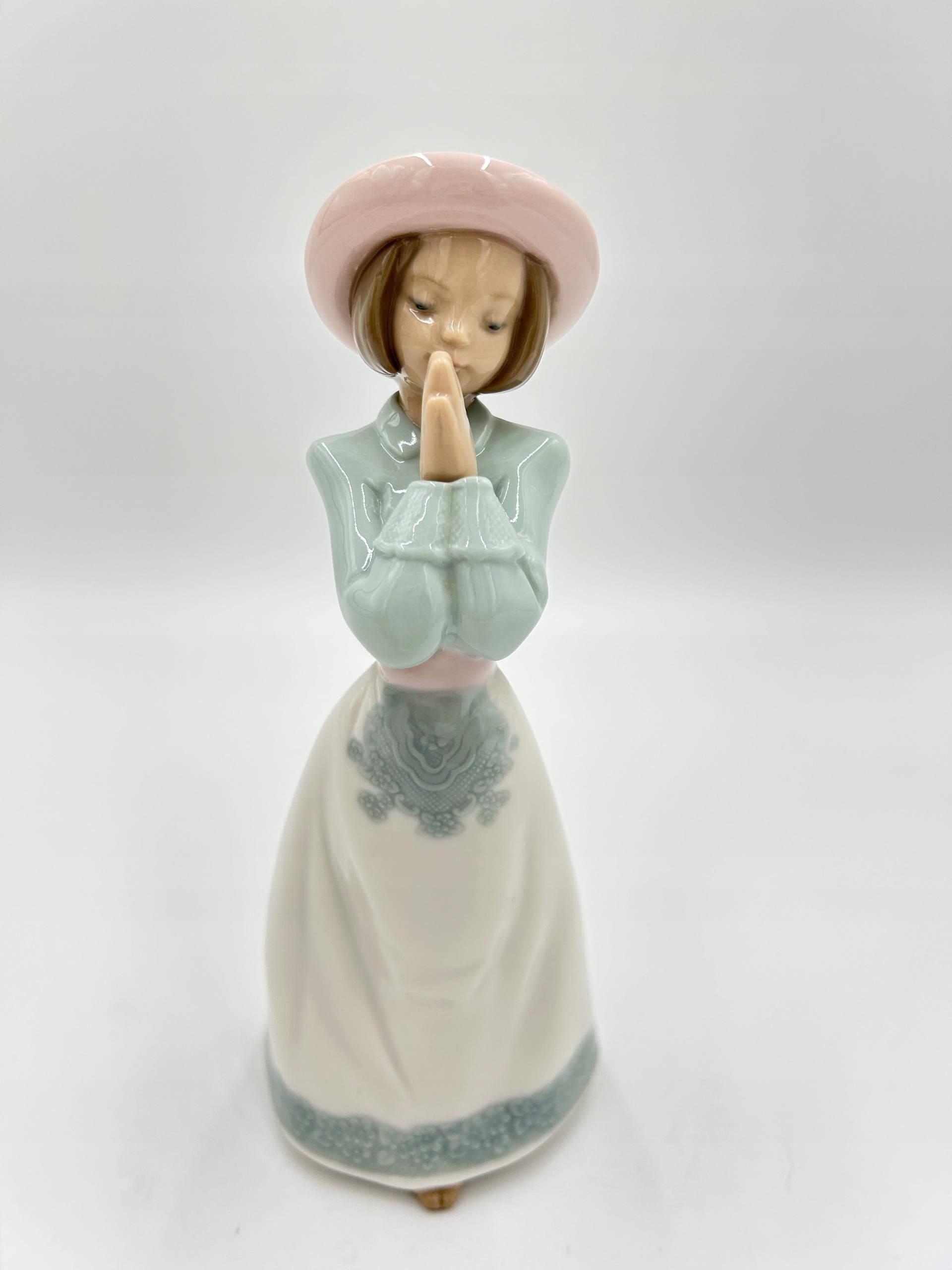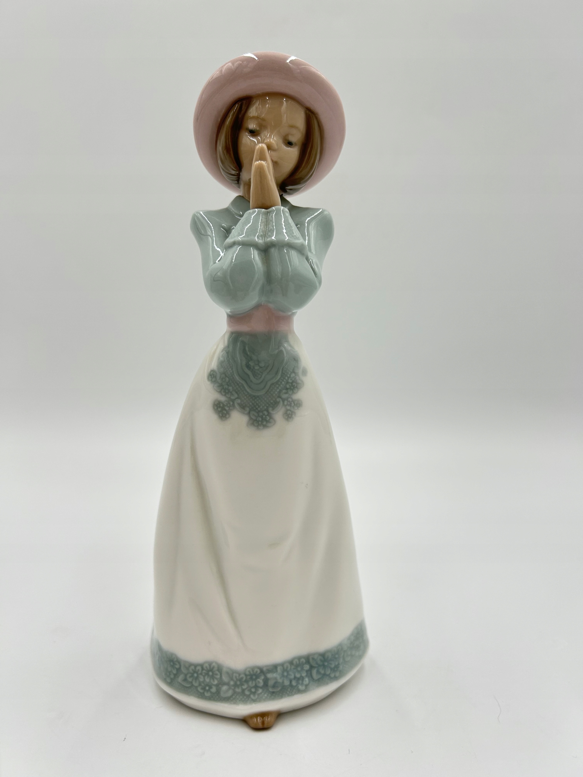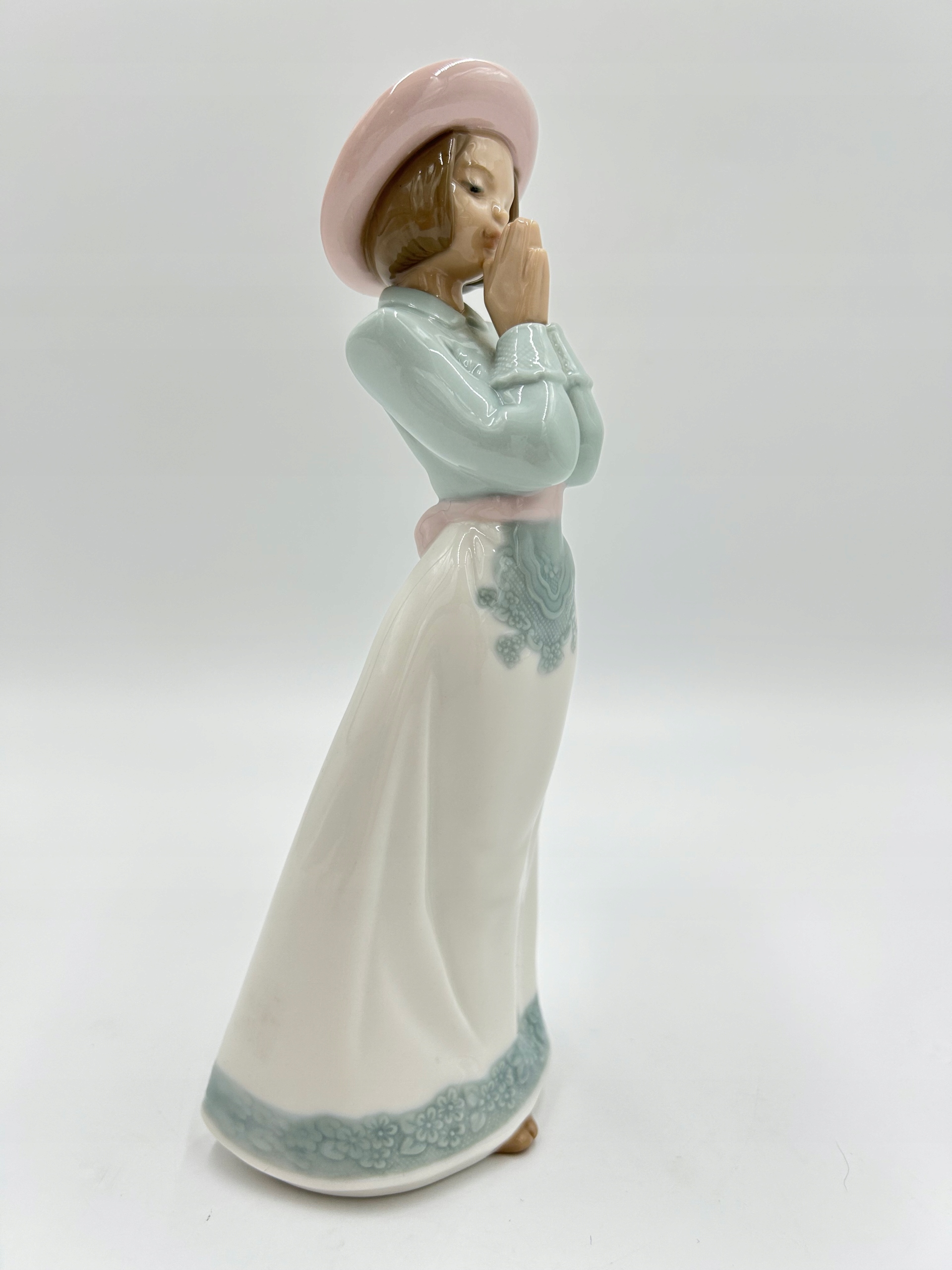 Объект продажи - очаровательная статуэтка испанского производства lladro nao - девушка в праздничной одежде и розовой шляпе со сложенными ручками для молитвы. С большим вниманием к поддержанию деталей благодаря работе лучших мастеров.