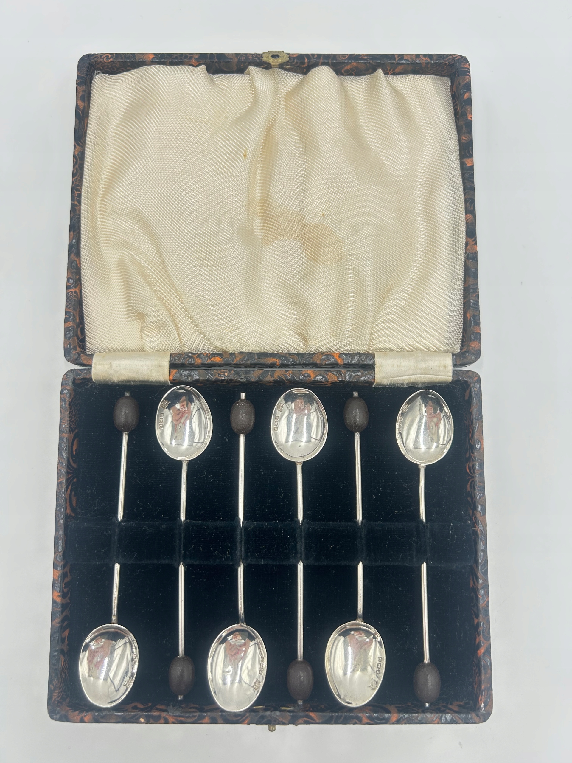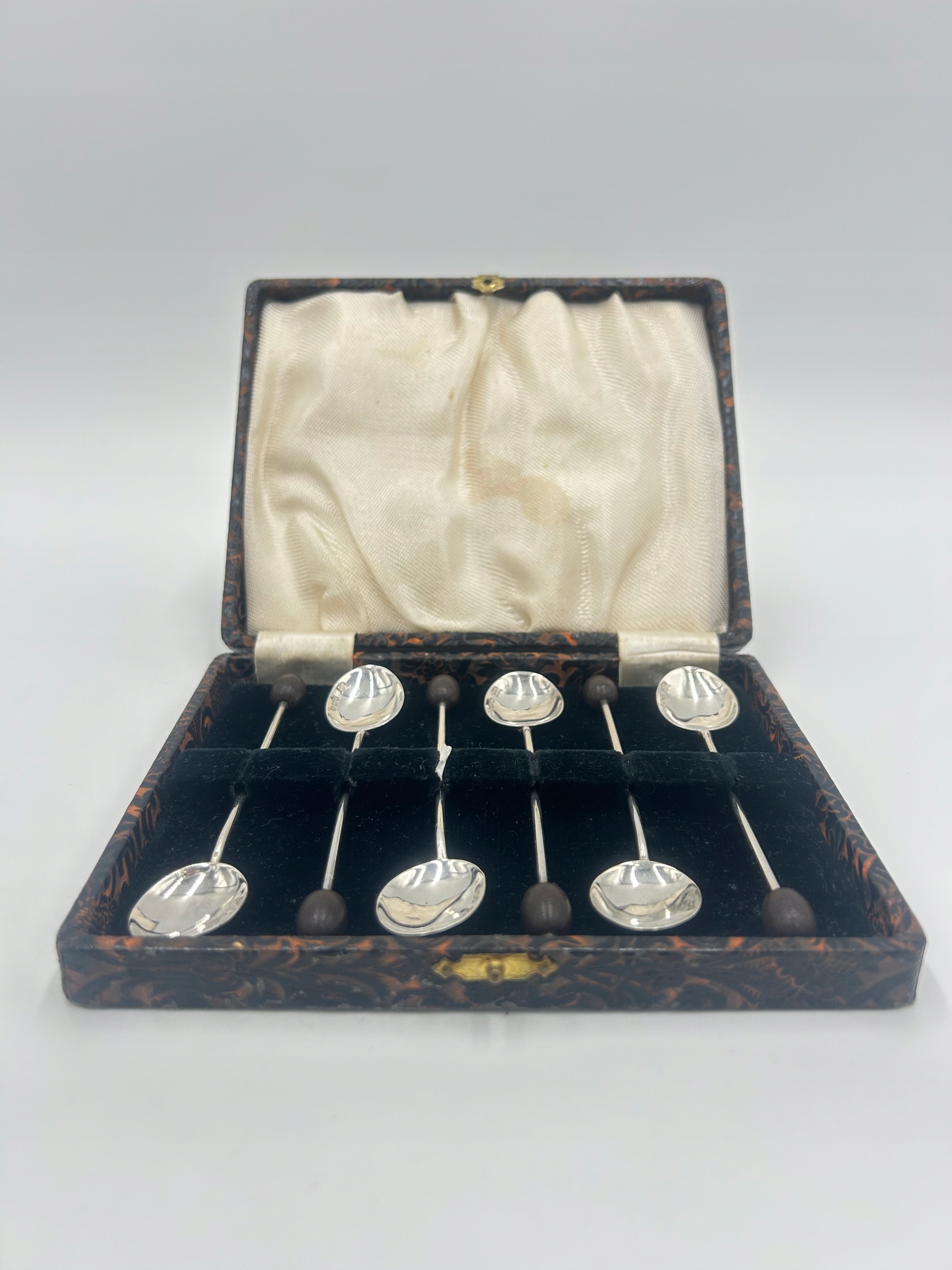 Набор из 6 серебряных кофейных ложек - Англия, серебро 925 пробы, с ручками в форме кофейных зерен из темного бакелита
