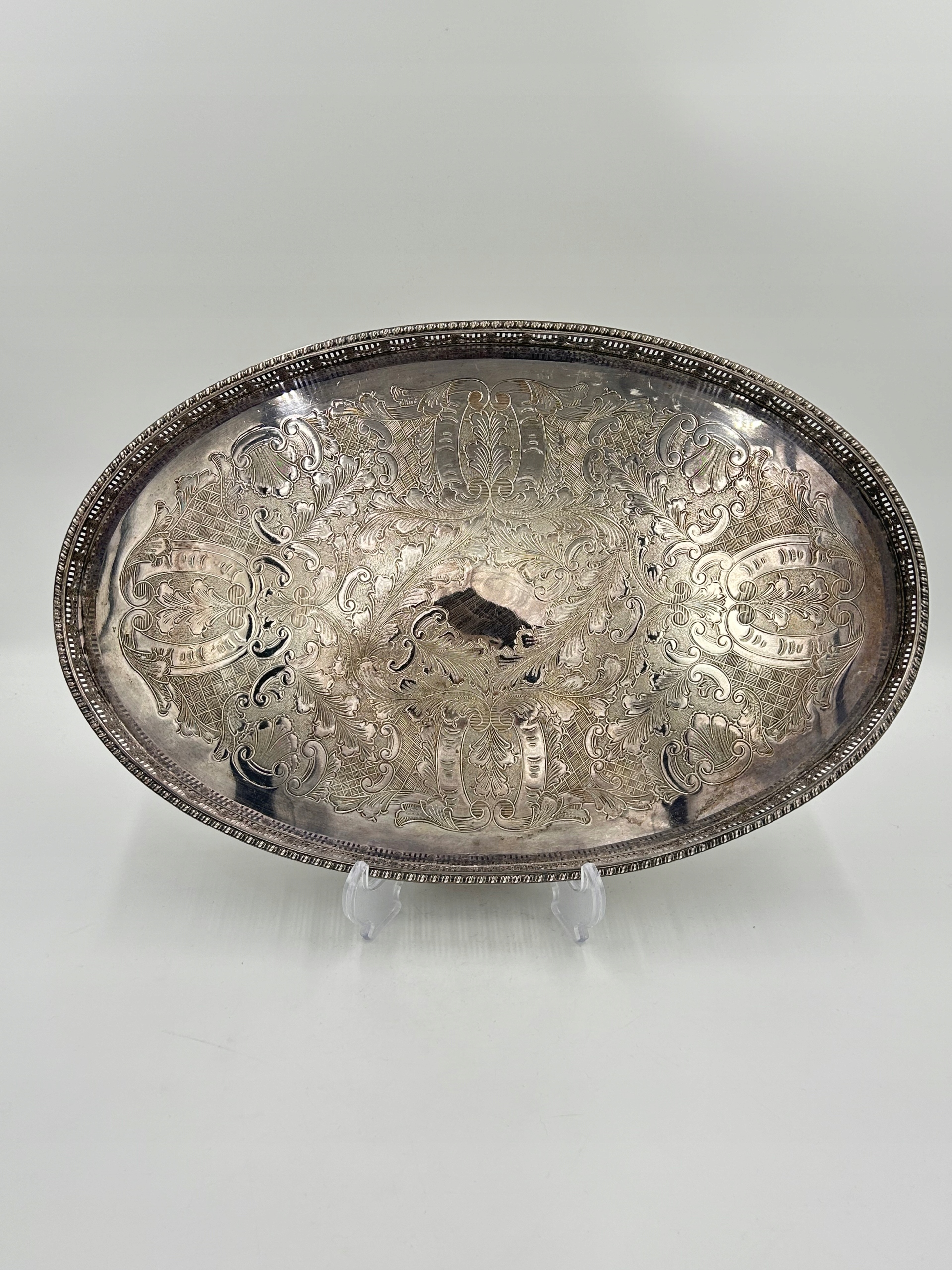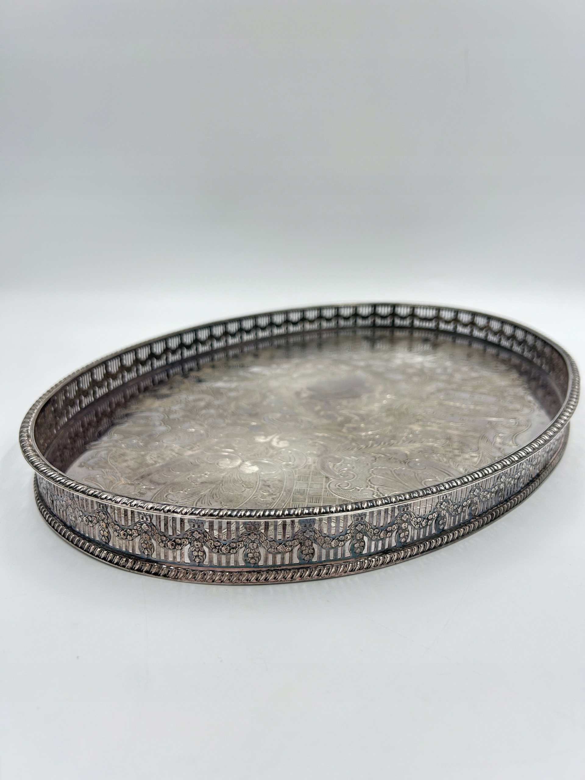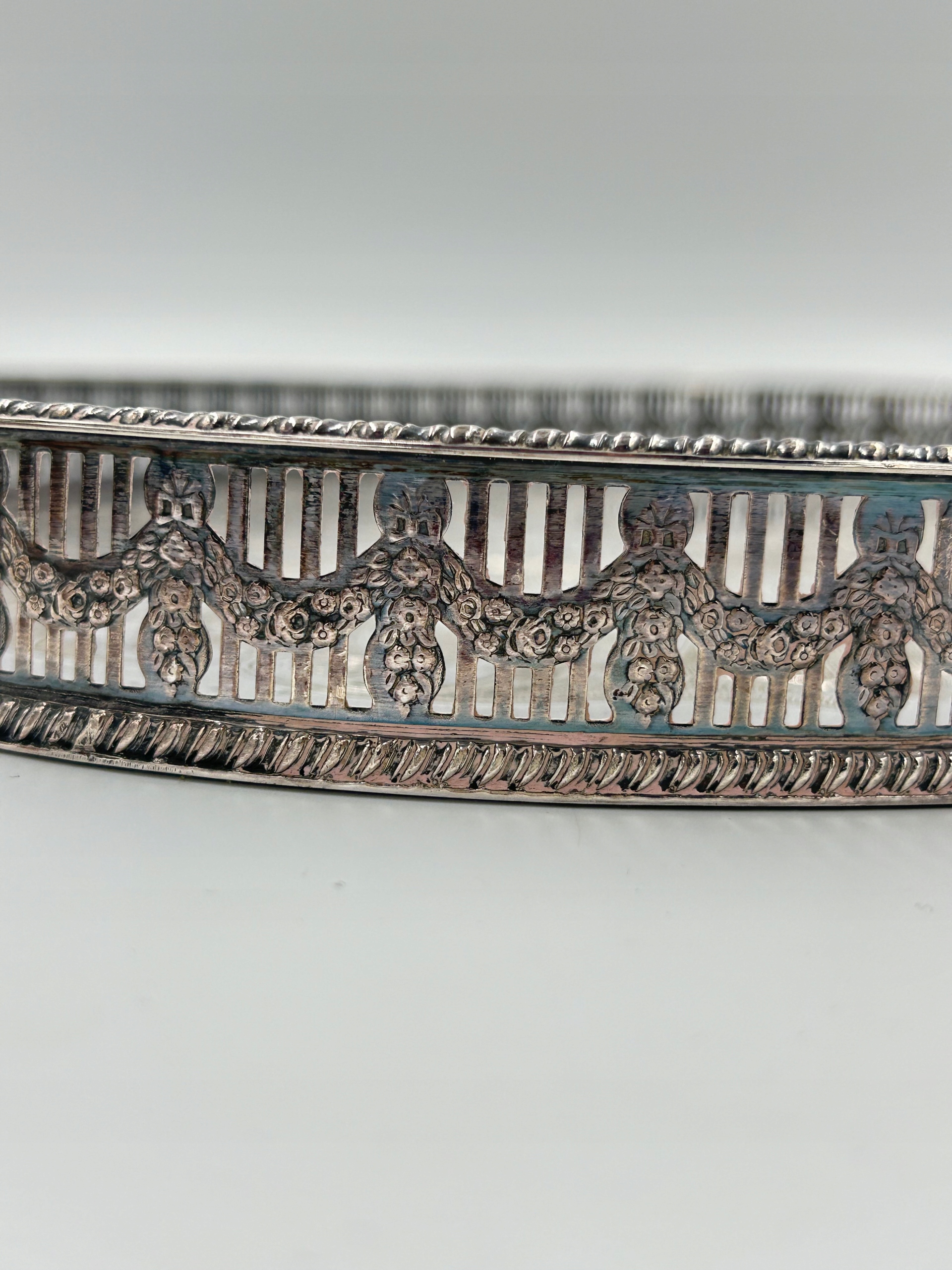 Предмет продажи - изящный поднос большого размера, украшенный рельефным узором, с ажурным краем. Подпись проставлена внизу. Красивое декоративное изделие.