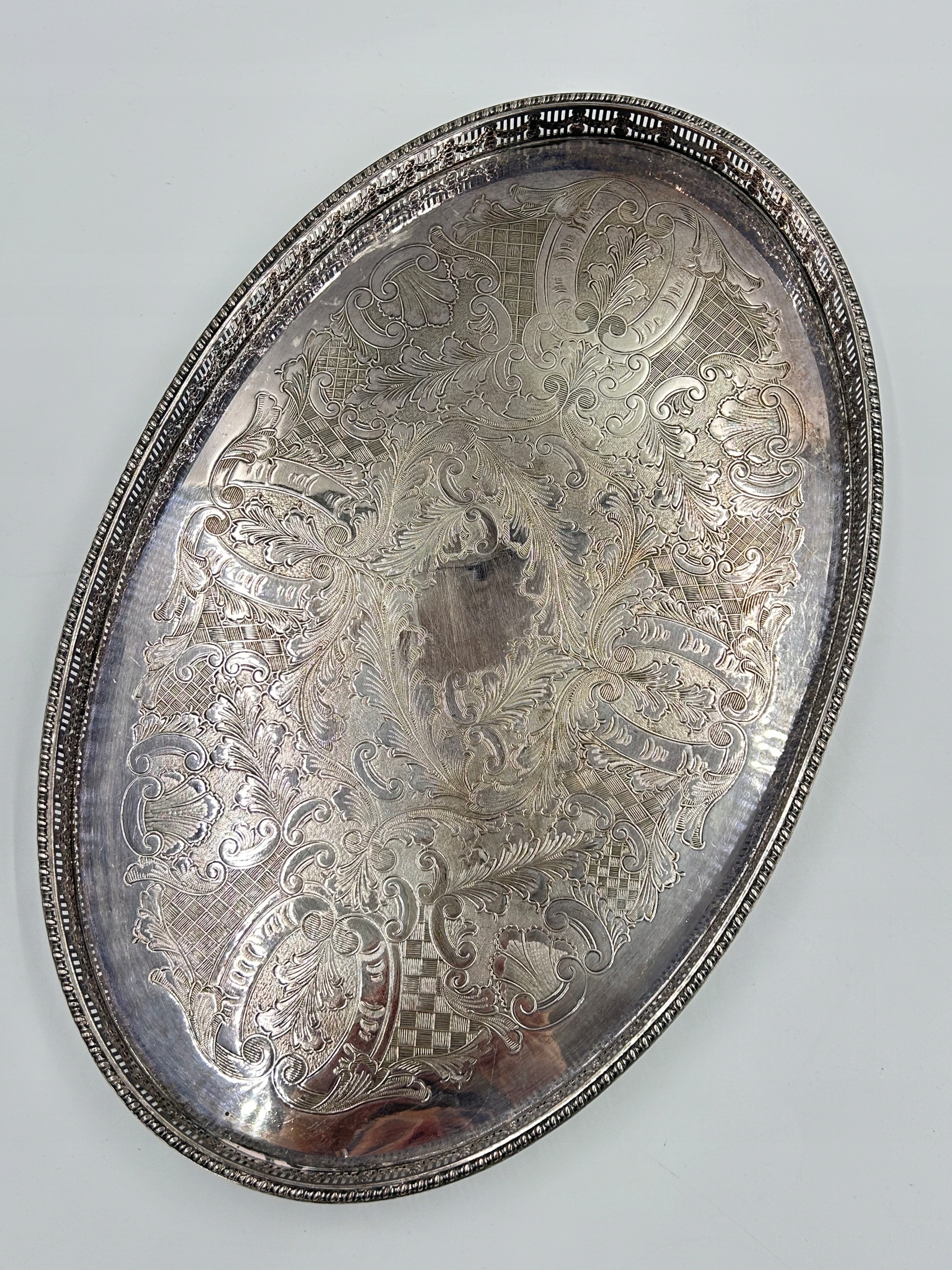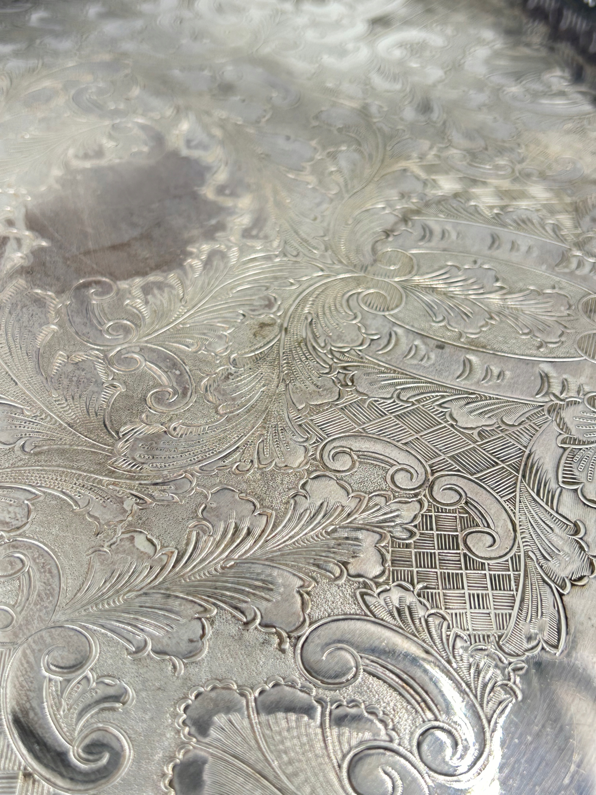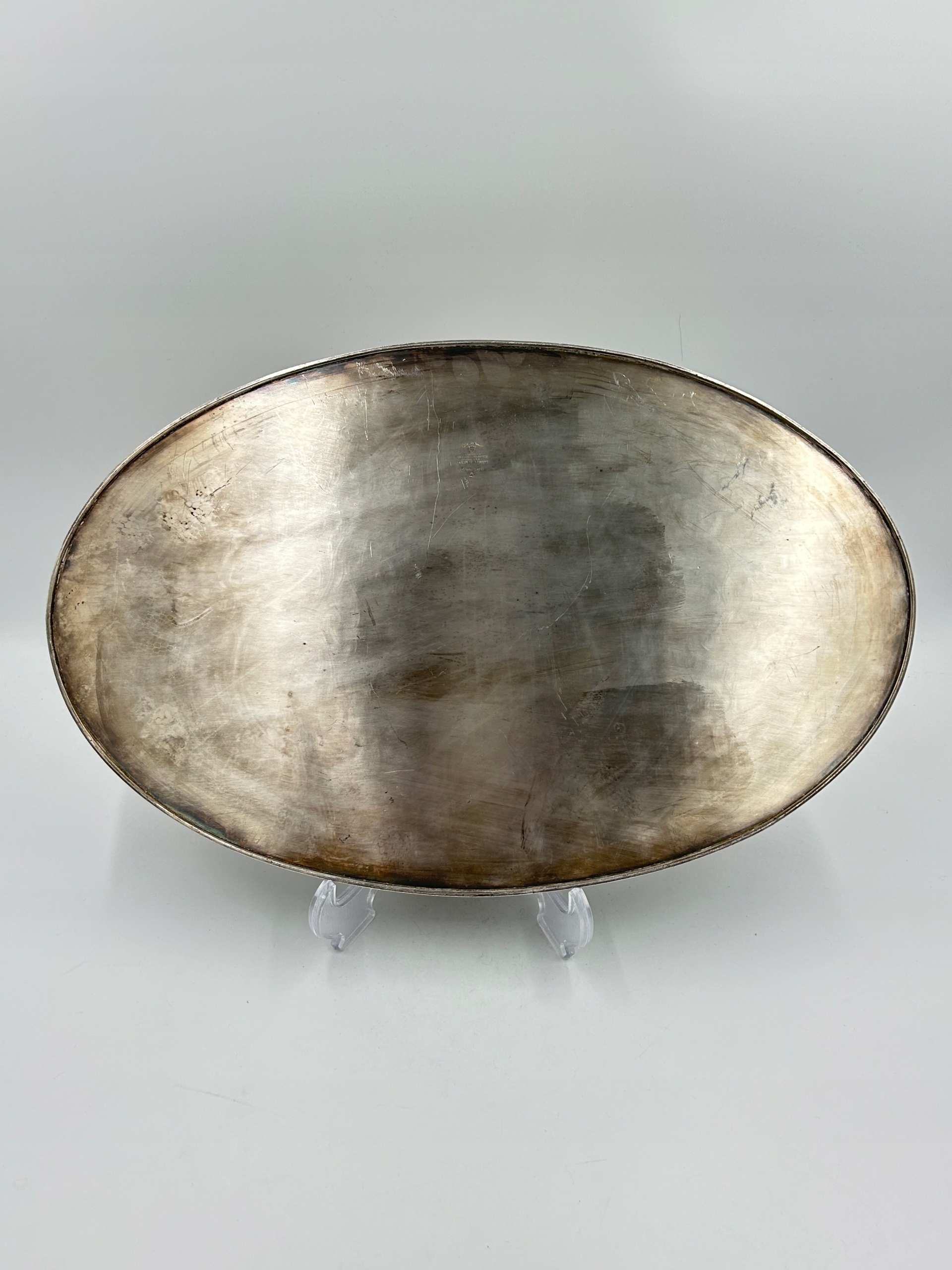 Предмет продажи - изящный поднос большого размера, украшенный рельефным узором, с ажурным краем. Подпись проставлена внизу. Красивое декоративное изделие.
