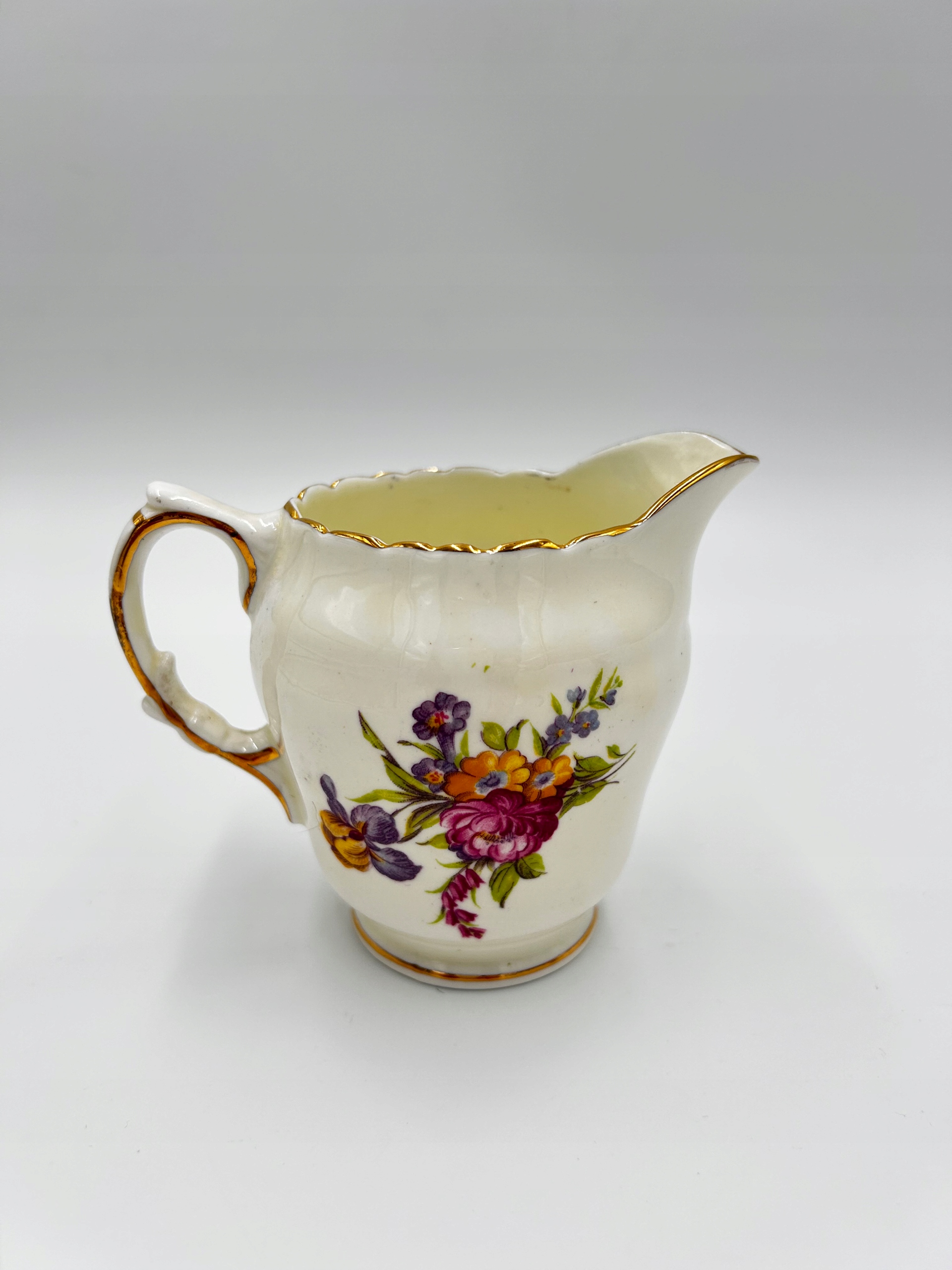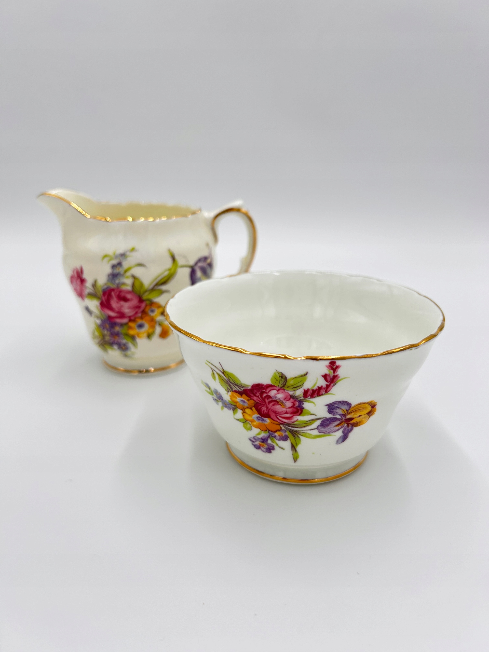 Представляю вам очаровательный набор: молочник и сахарница производства HM SUTHERLAND Bone China. Изготовлен из нежного фарфора, богато украшен цветочными элементами, края отделаны позолотой.