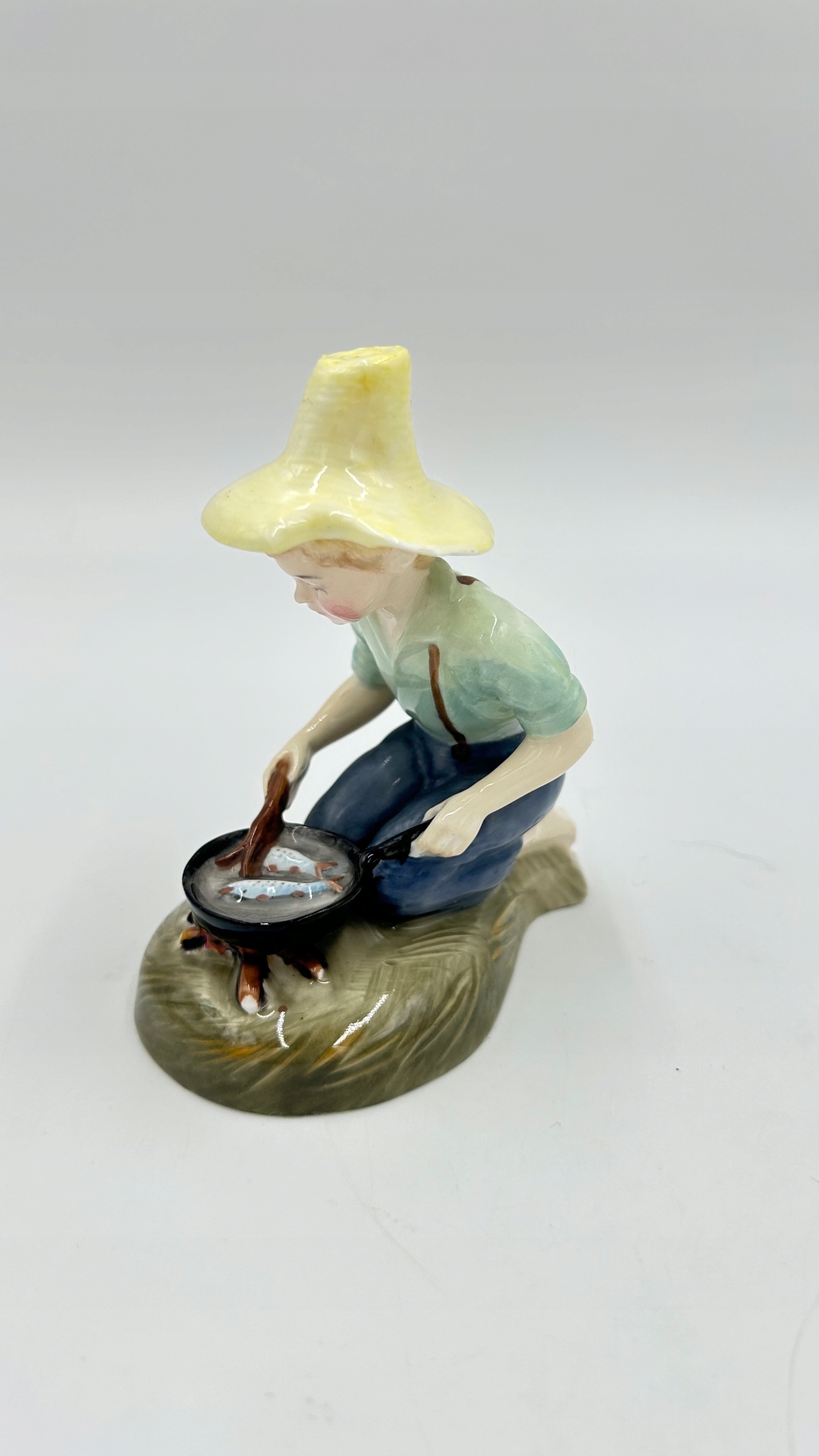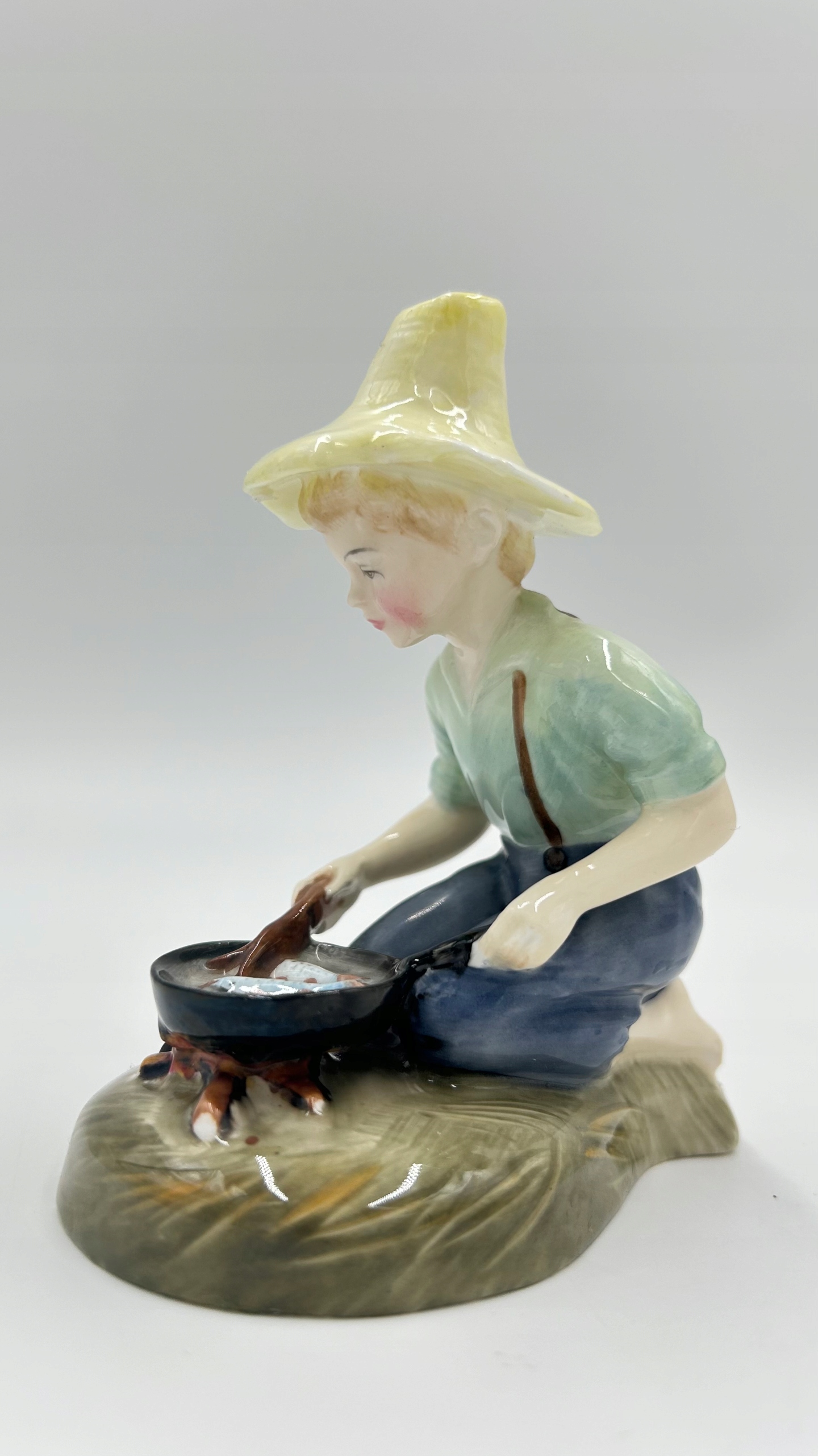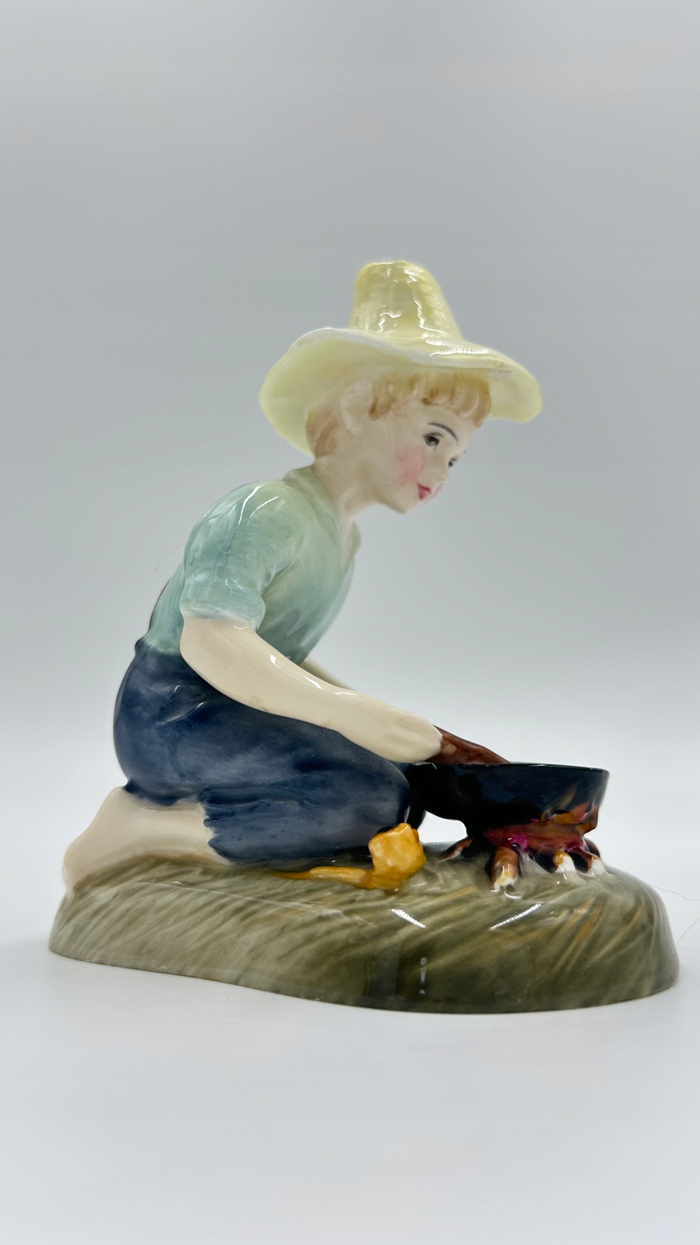 Объект продажи - уникальная статуэтка Royalon Dulton - River Boy, изображающий мальчика, готовящего еду над костра. Мальчик босиком, в залаженной рубашке, у него на голове желтая, поврежденная шляпа.