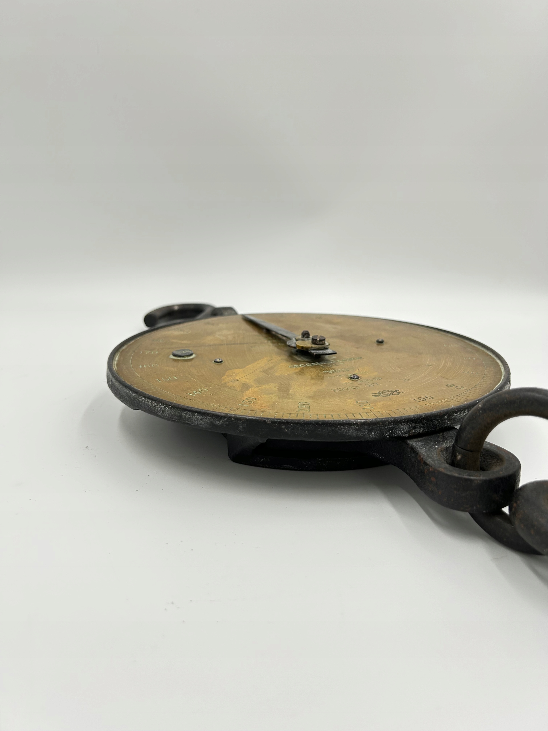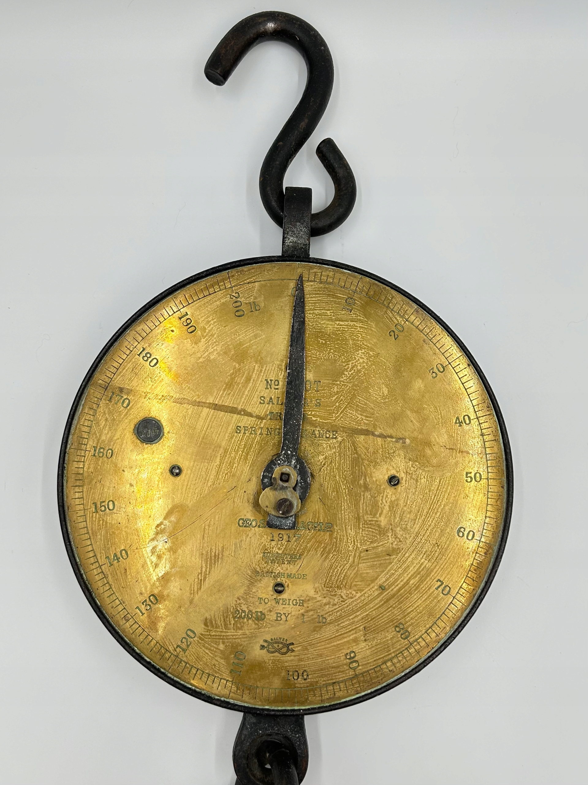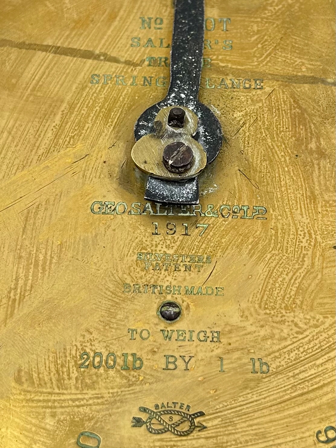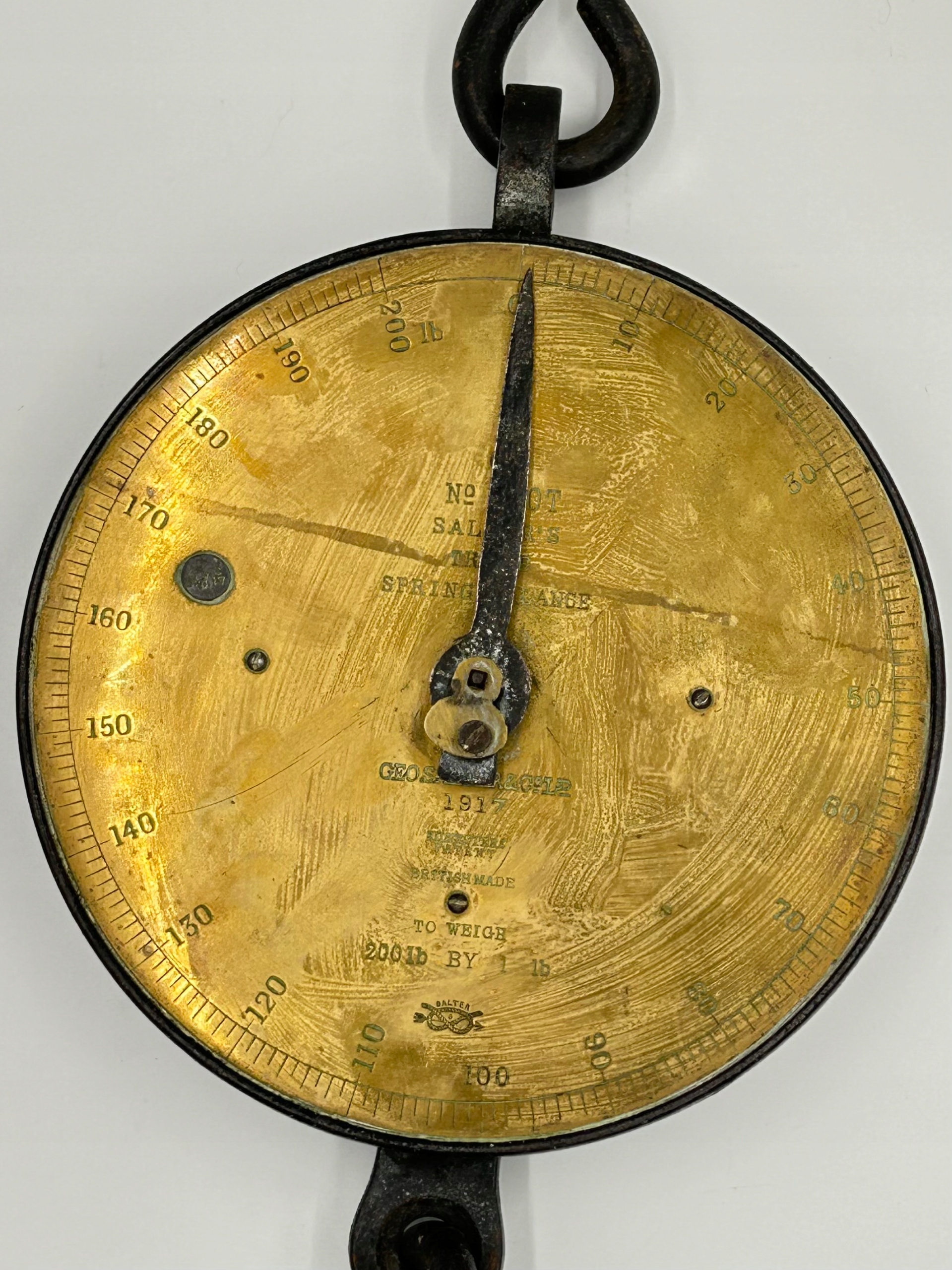 Предмет продажи – весы, используемые для измерения мин. большие и тяжелые сумки. В комплект входит чугунная ручка и крючок для подвешивания, а также латунный циферблат. Производство Geo.Salter &Co, 1917 год. Прекрасный кусочек истории, идеально подходящий для украшения индустриального или винтажного интерьера.