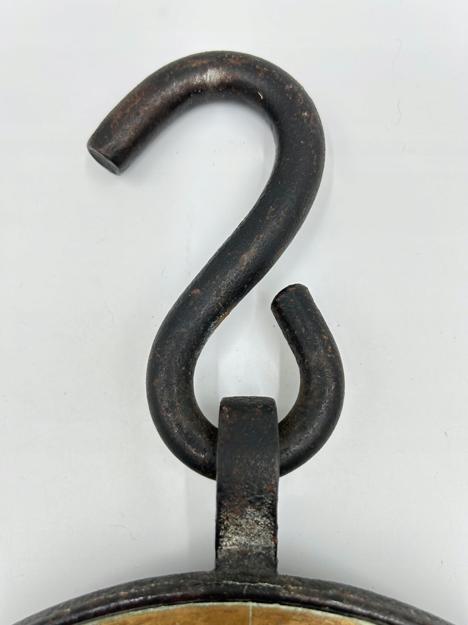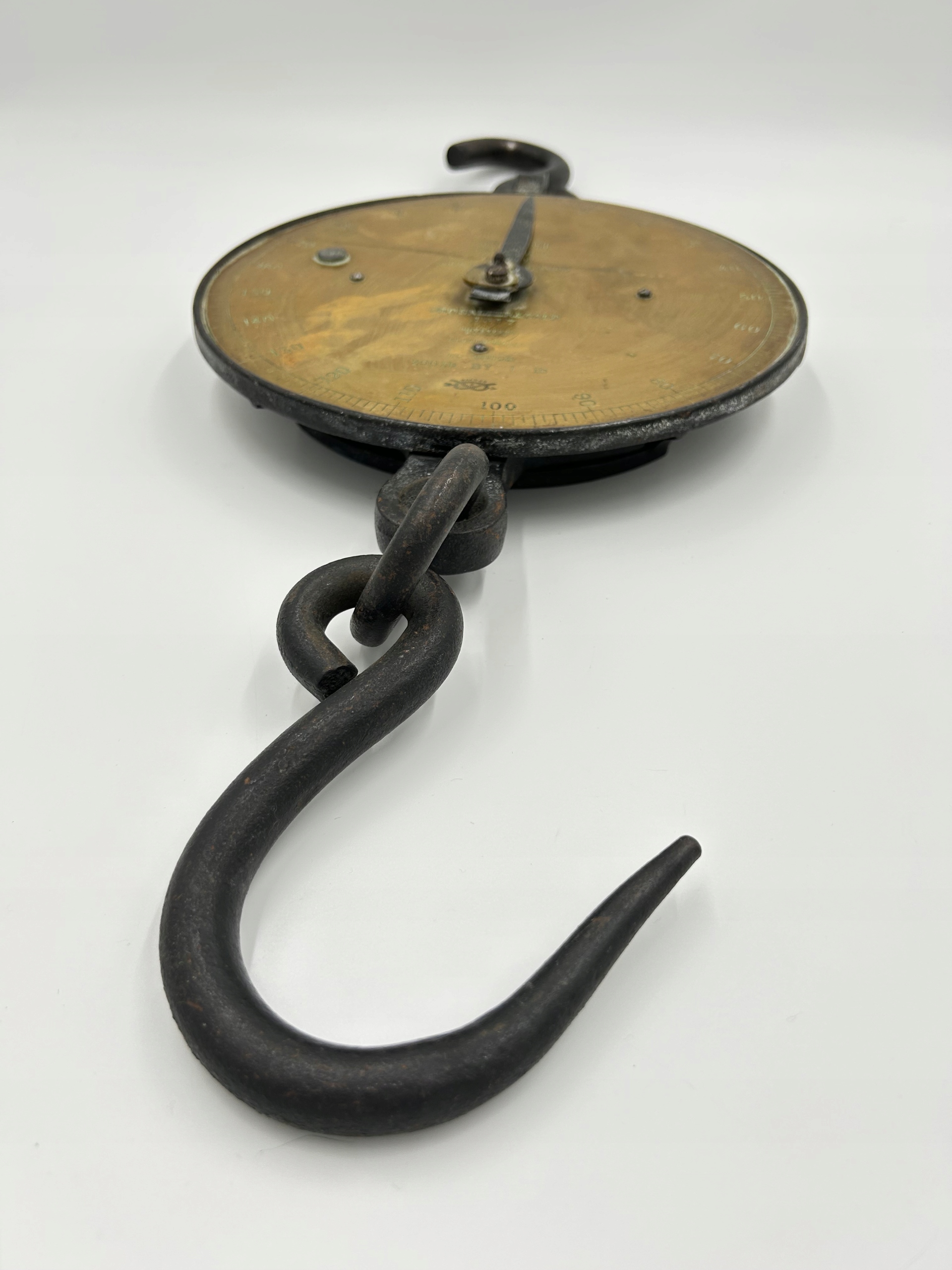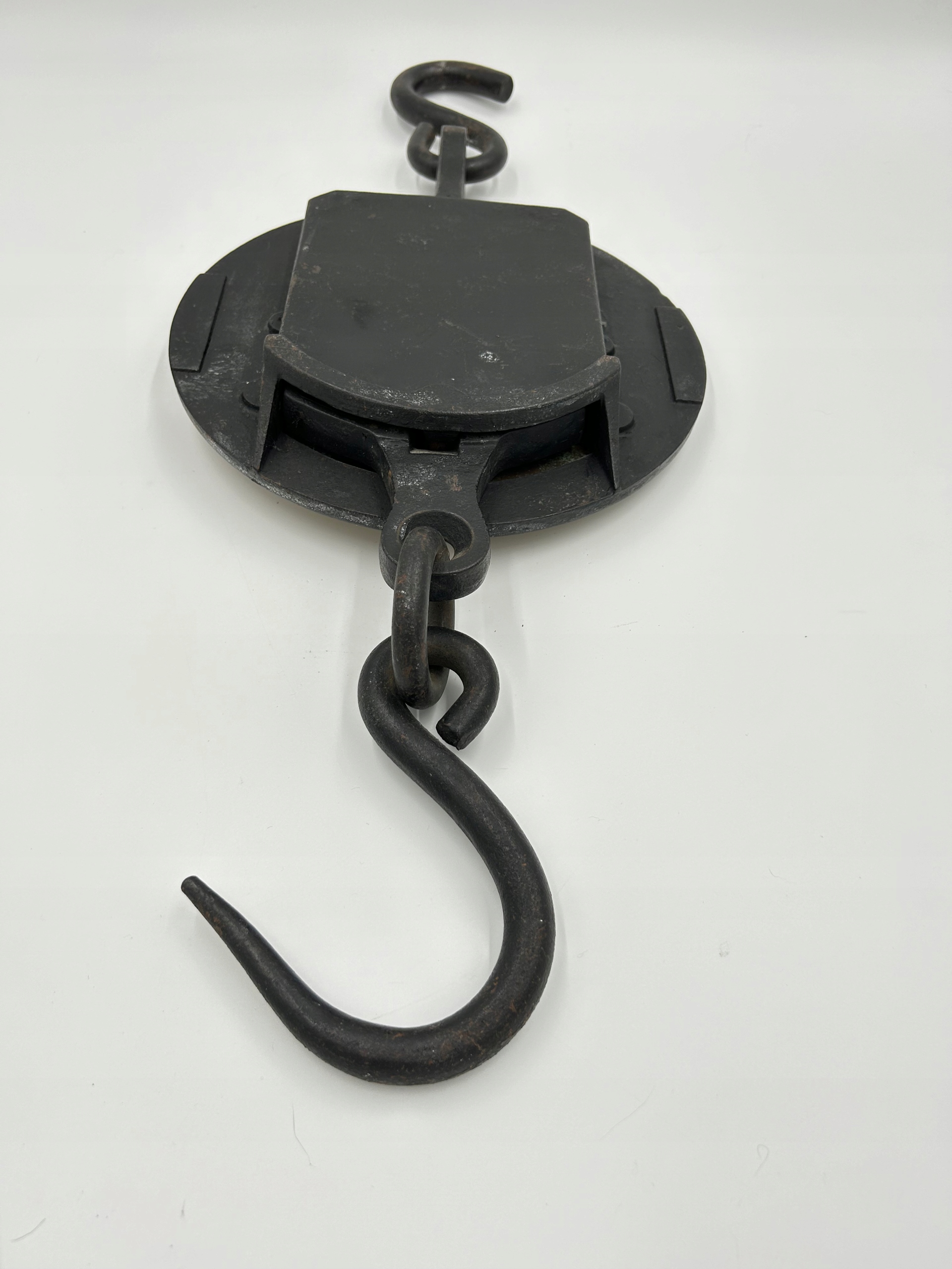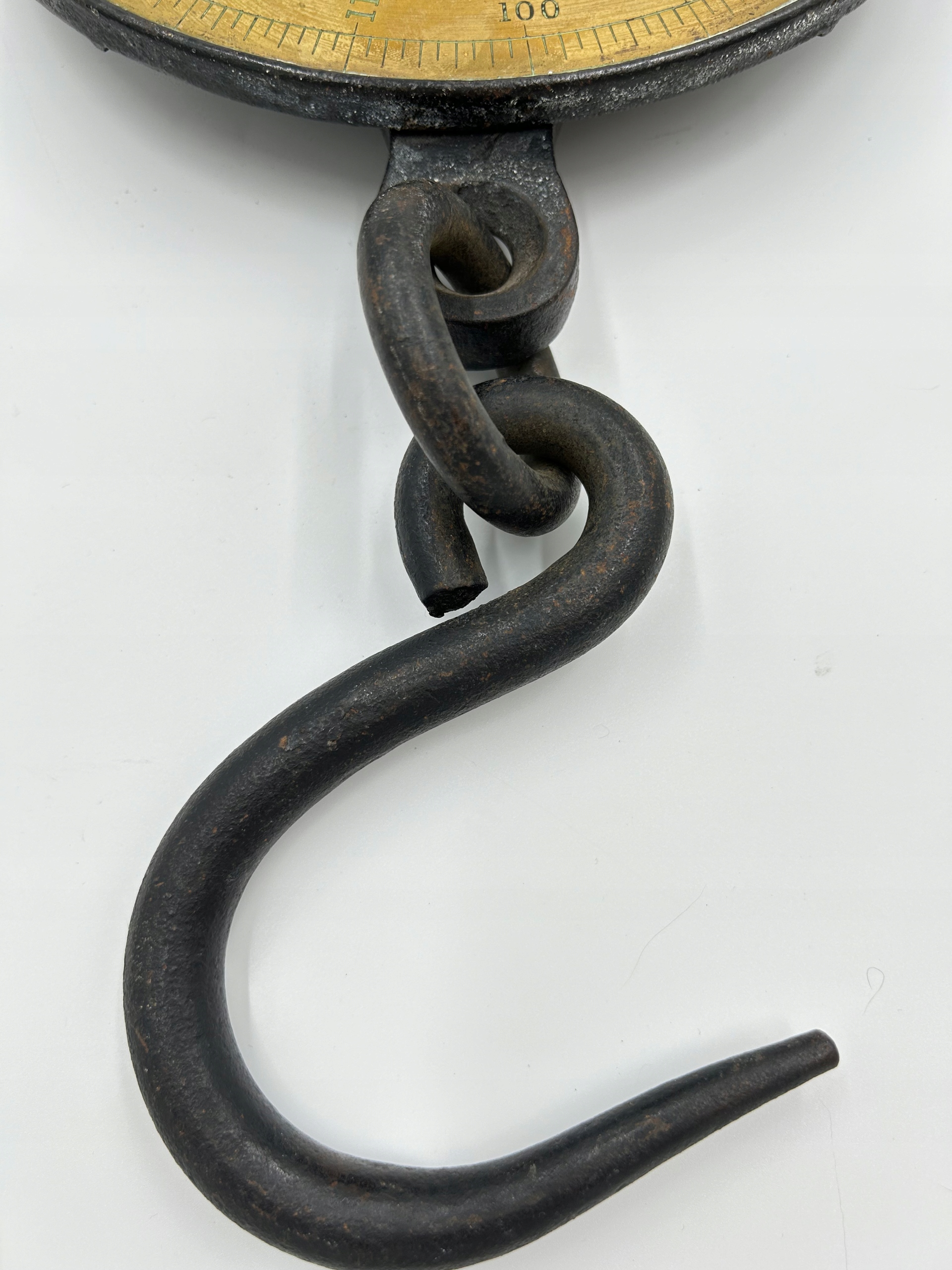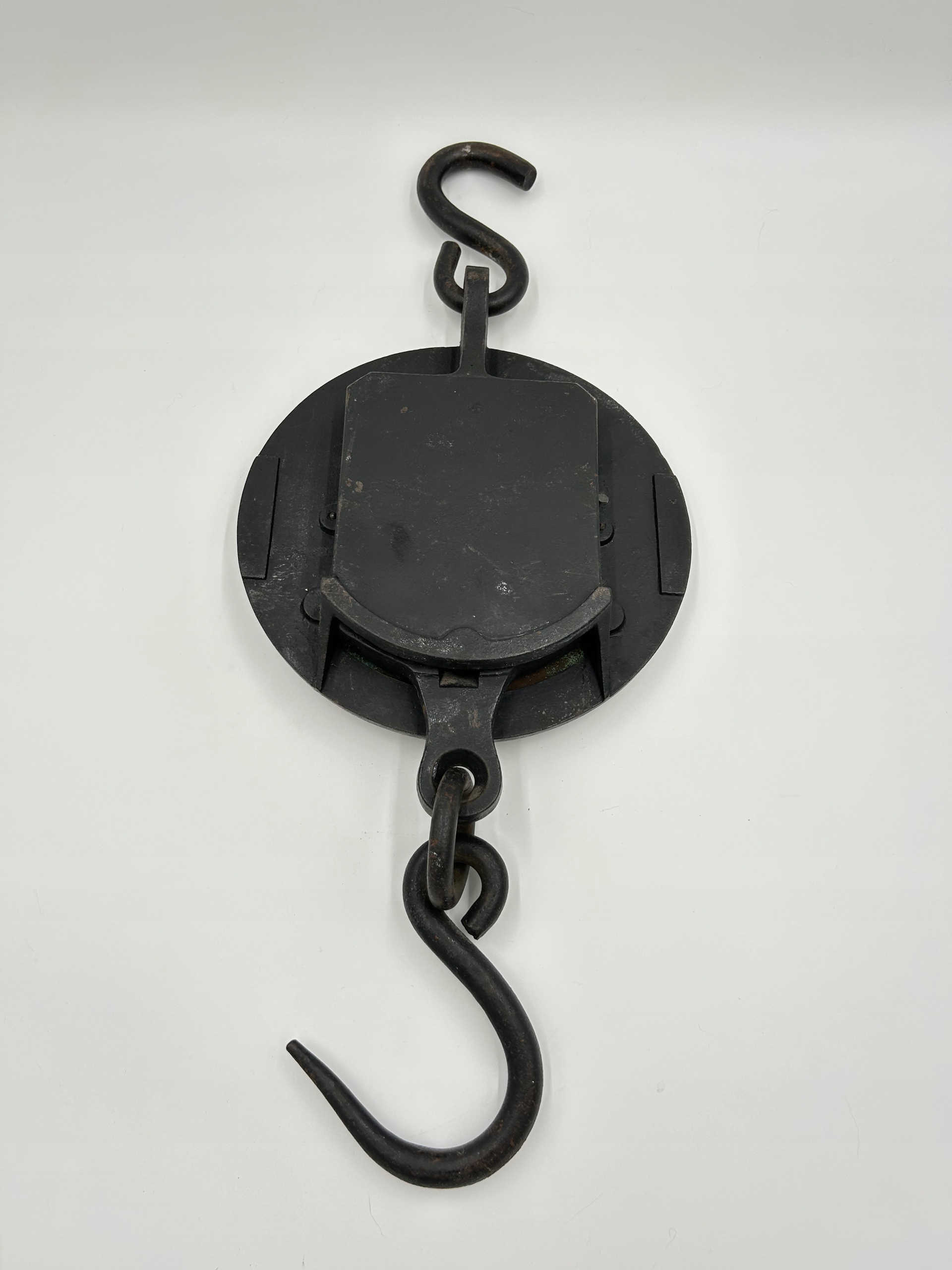 Предмет продажи – весы, используемые для измерения мин. большие и тяжелые сумки. В комплект входит чугунная ручка и крючок для подвешивания, а также латунный циферблат. Производство Geo.Salter &Co, 1917 год. Прекрасный кусочек истории, идеально подходящий для украшения индустриального или винтажного интерьера.