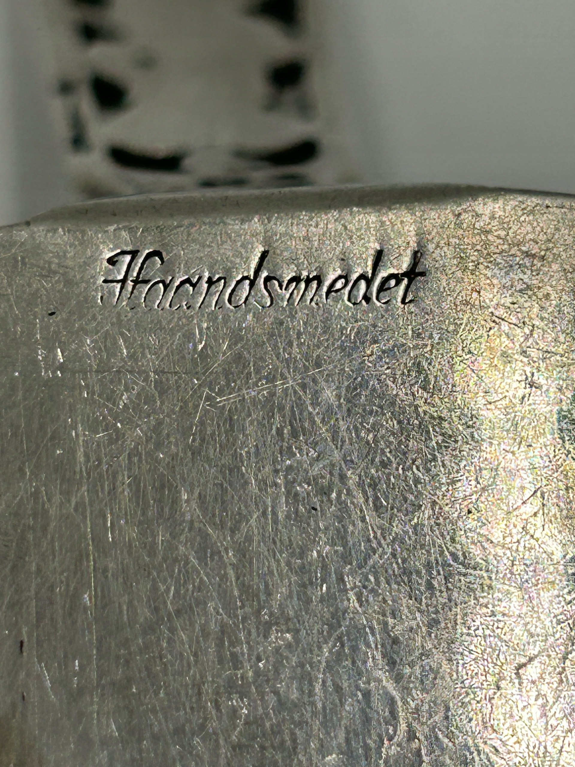 На поверхности видна надпись «Haandsmedet» (ручная работа) и подпись мастера, что подтверждает ручное производство и уникальность изделия.