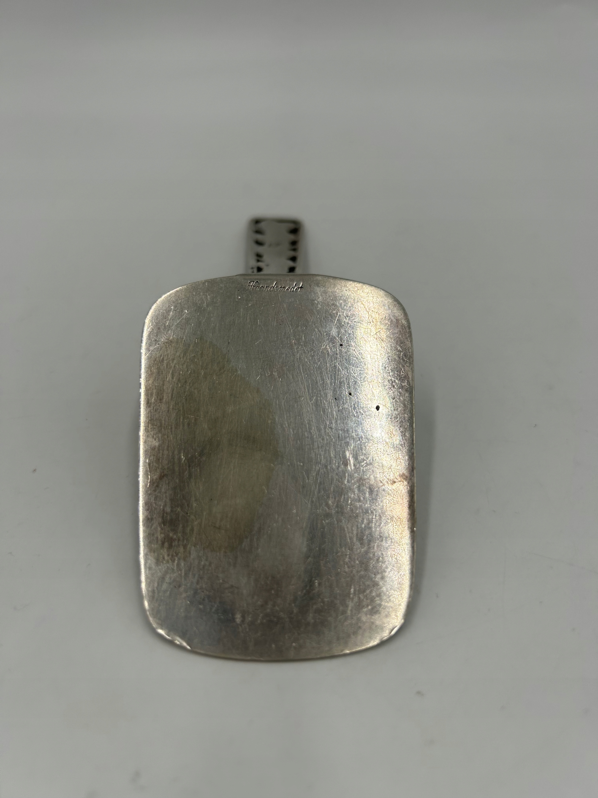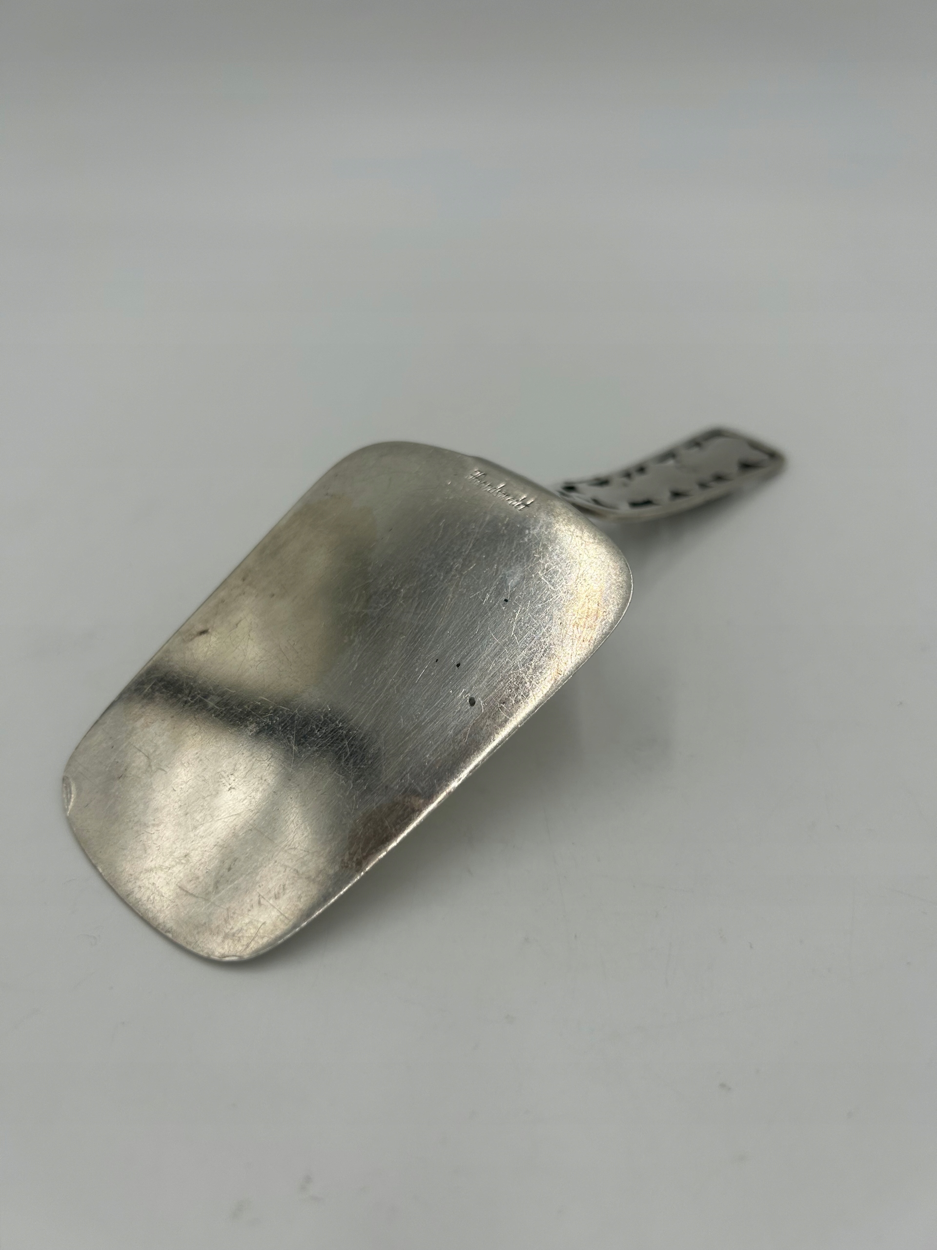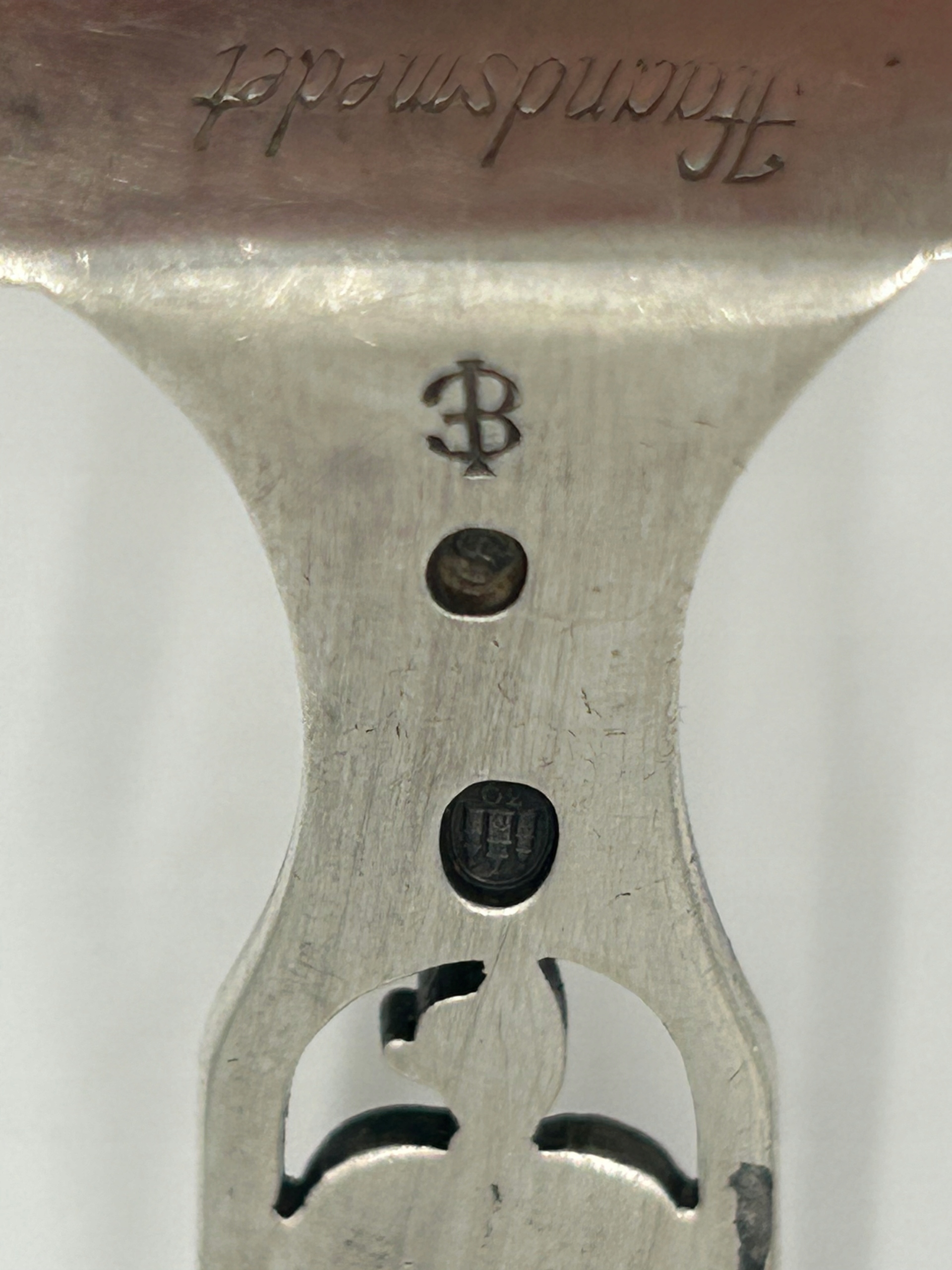 Элегантная серебряная сервировочная лопаточка, ручная работа, с декоративным характером. Рукоять украшена растительным орнаментом, характерным для скандинавского дизайна. Рабочая часть имеет простую, геометрическую форму, свойственную изделиям рубежа XIX-XX веков.