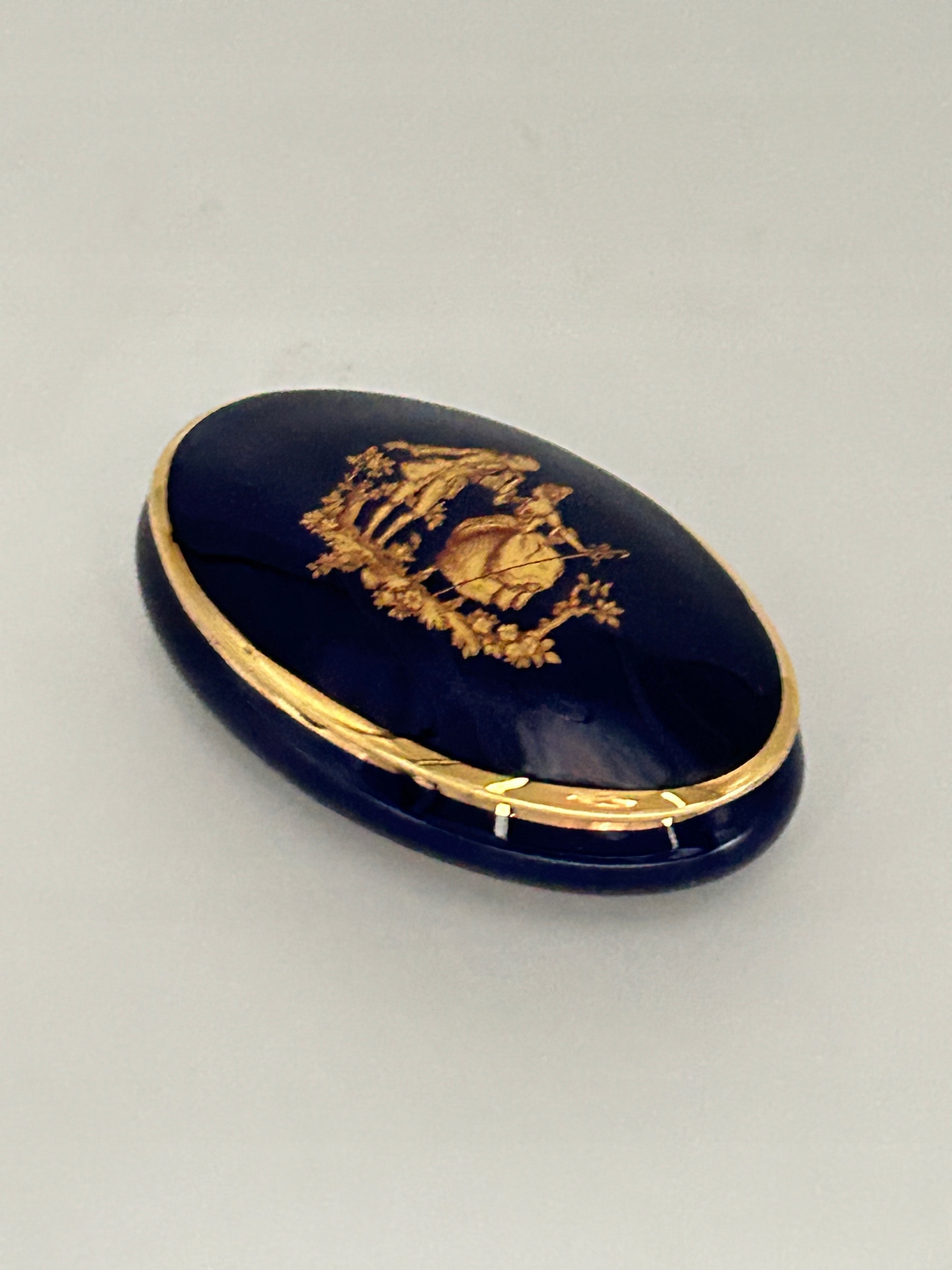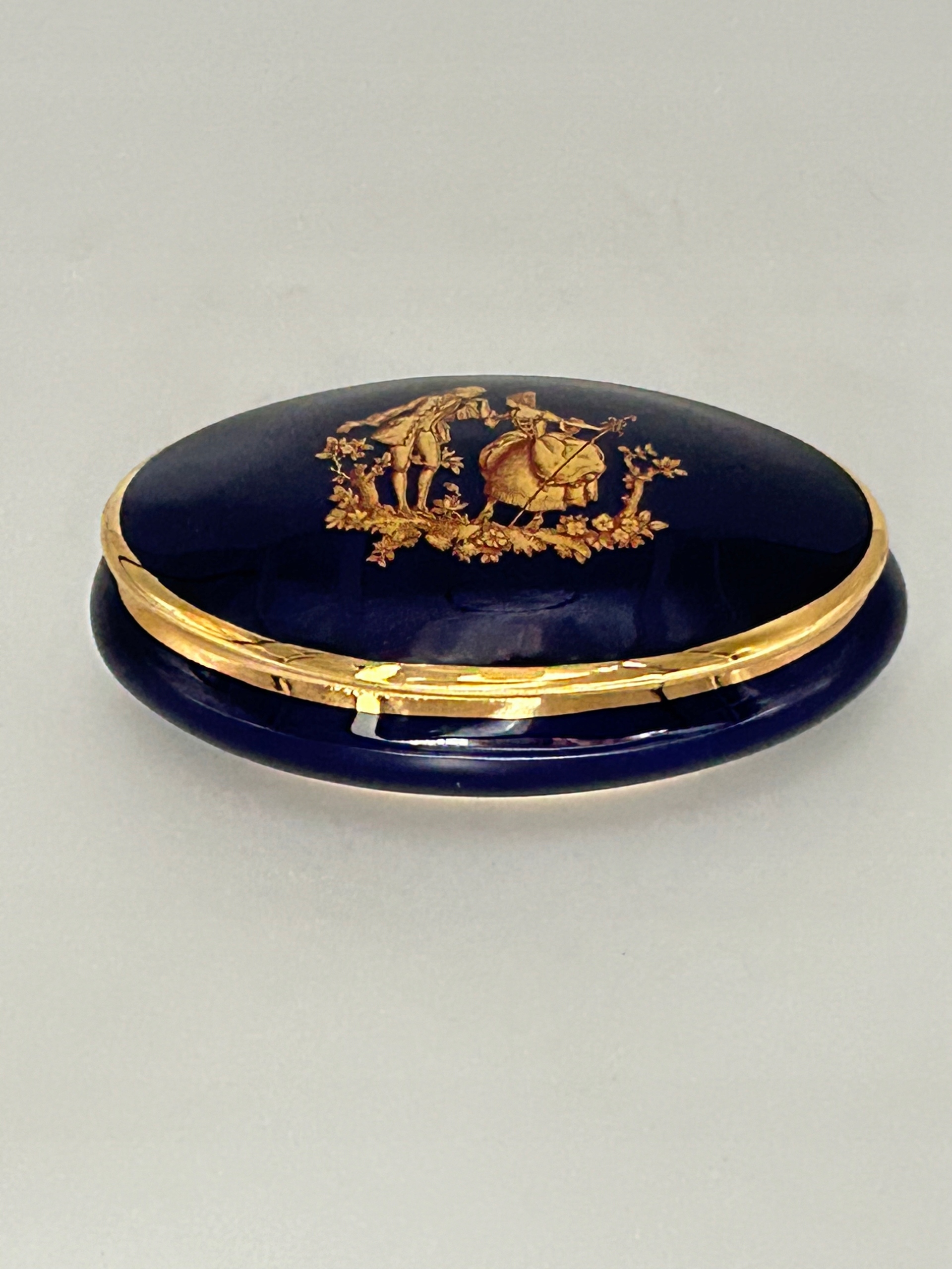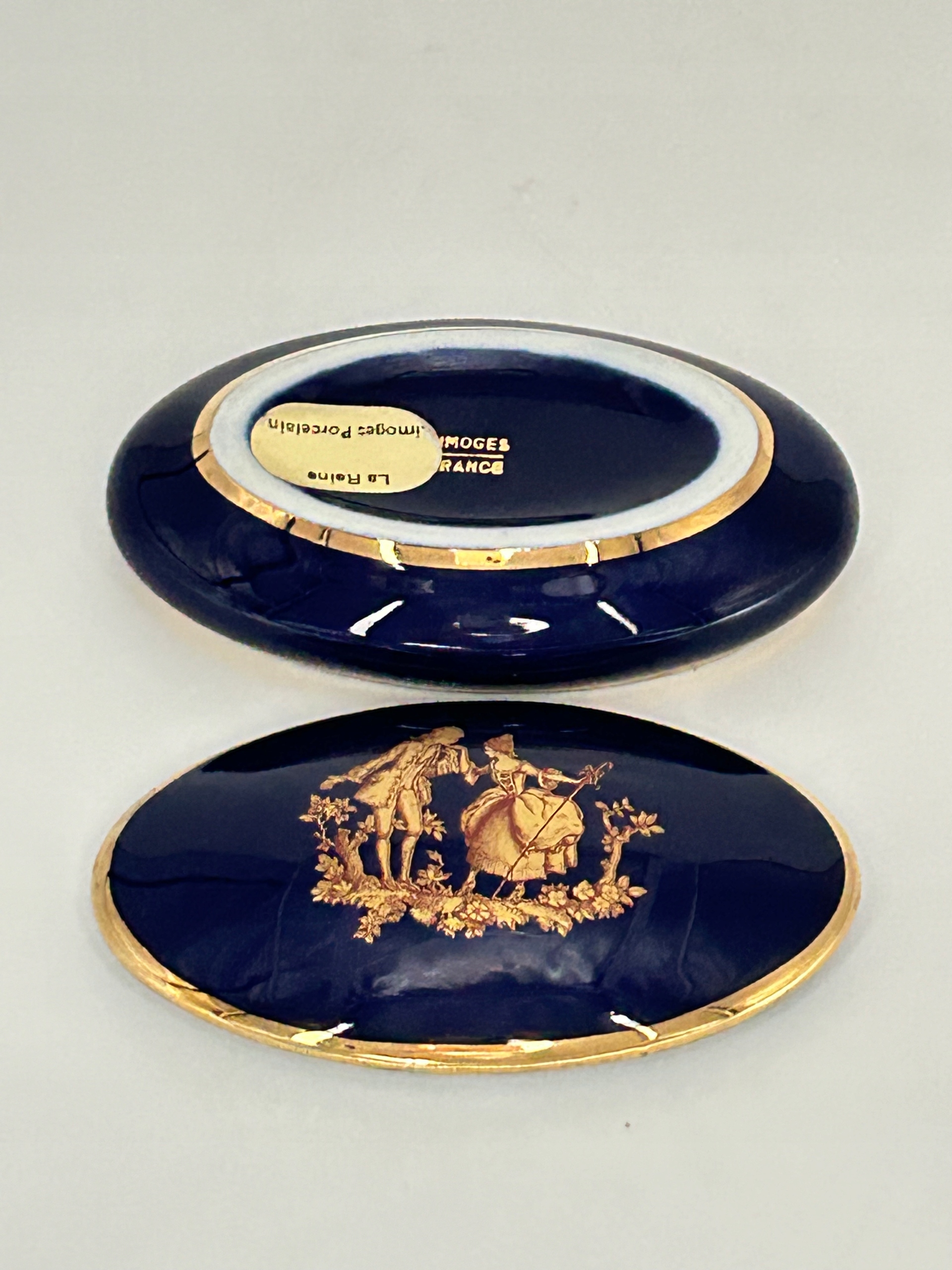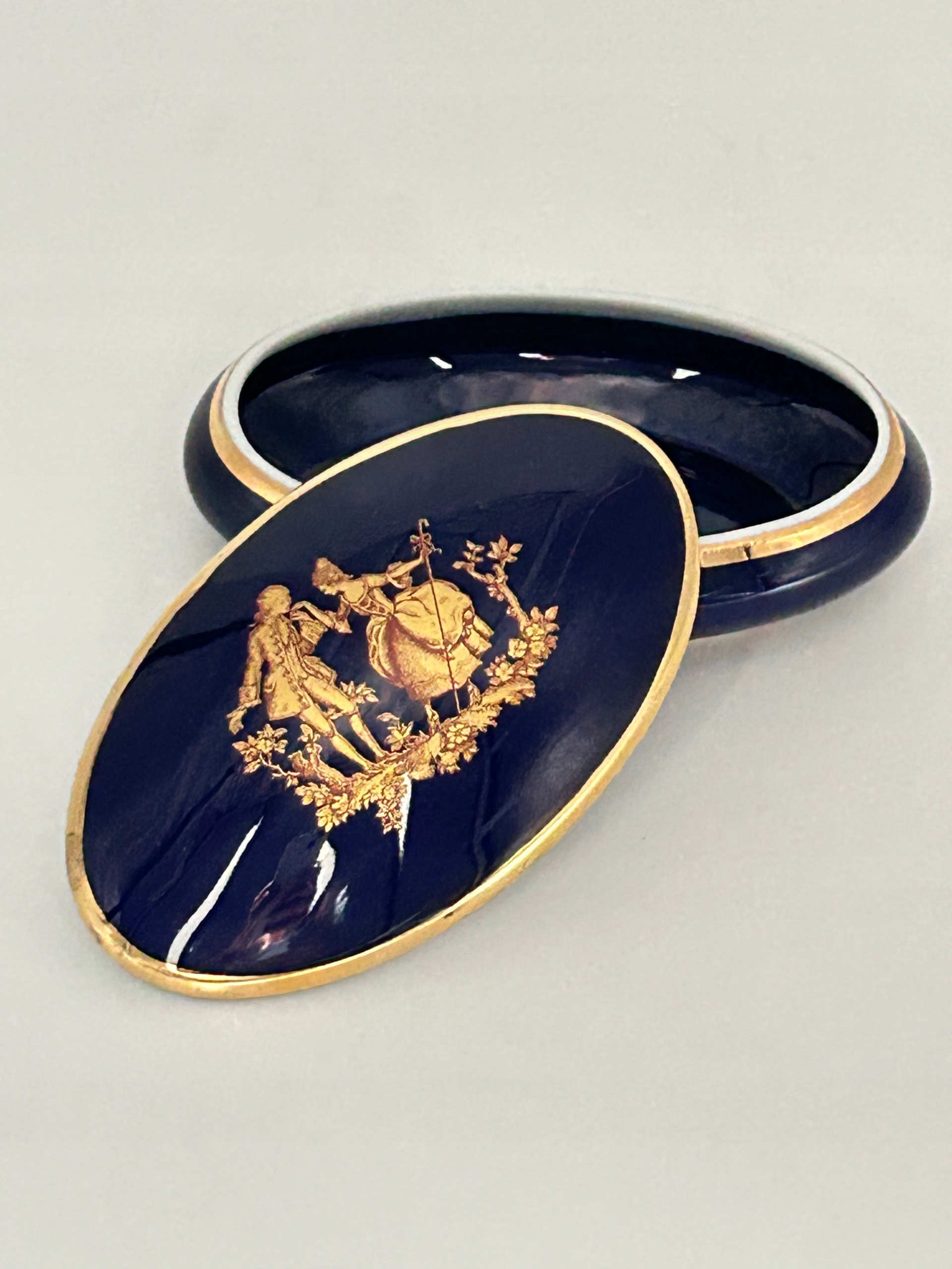 Предмет продажи — красивая шкатулка из лиможского фарфора. Выполнена из фарфора цвета кобальта, украшена кулисой золотого цвета, край позолочен. Оформлен с большой точностью и вниманием к деталям. Уникальный предмет декора для людей, ценящих элегантность. Идеально подходит в качестве подарка близкому человеку или для пополнения коллекционной полки.