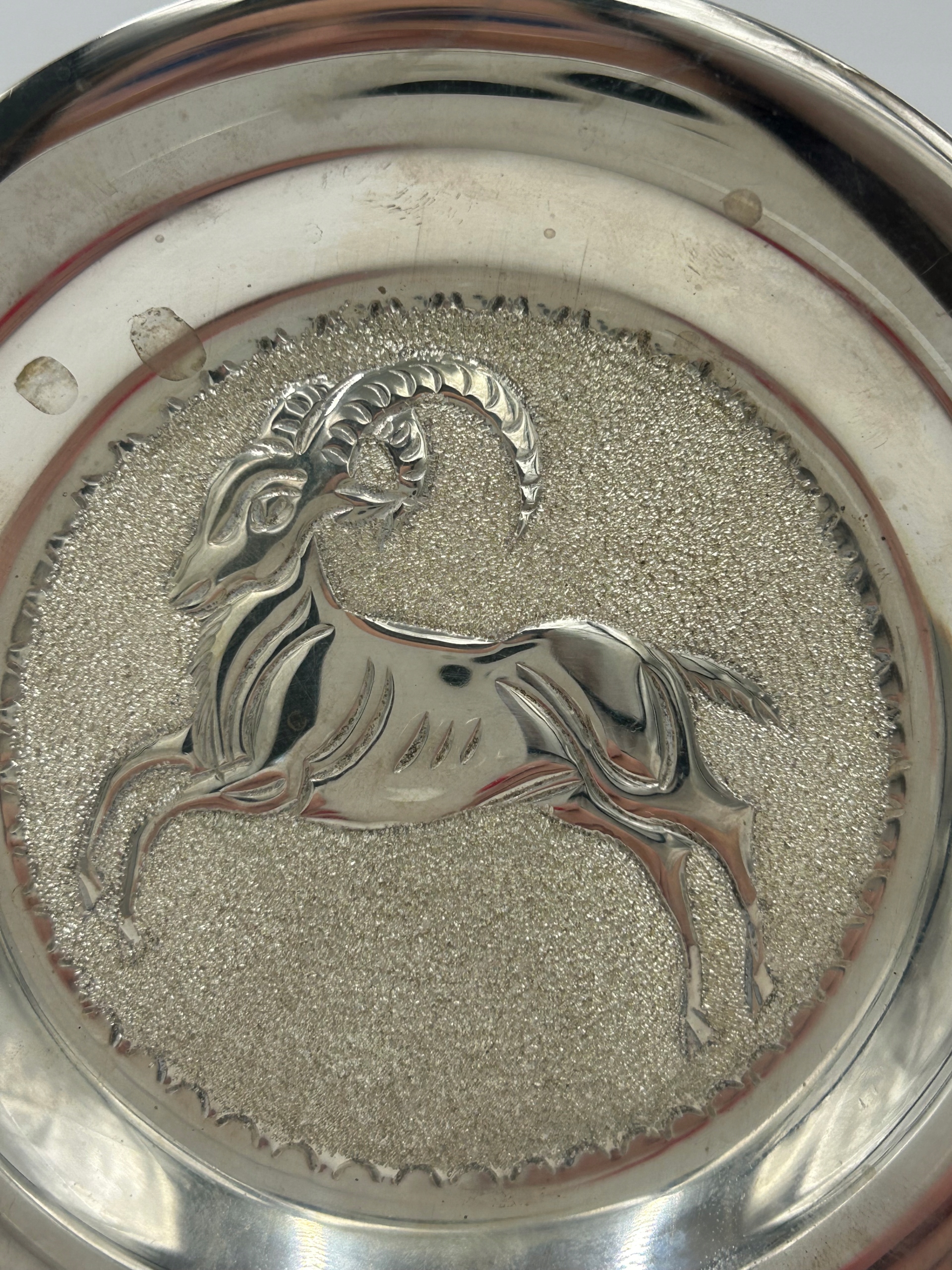 Привлекательная серебряная декоративная тарелка, украшенная центральным рельефом с изображением муфлона, символа Кипра. Композиция выполнена в технике тиснения, на фоне с зернистой текстурой, которая красиво контрастирует с полированным силуэтом животного.