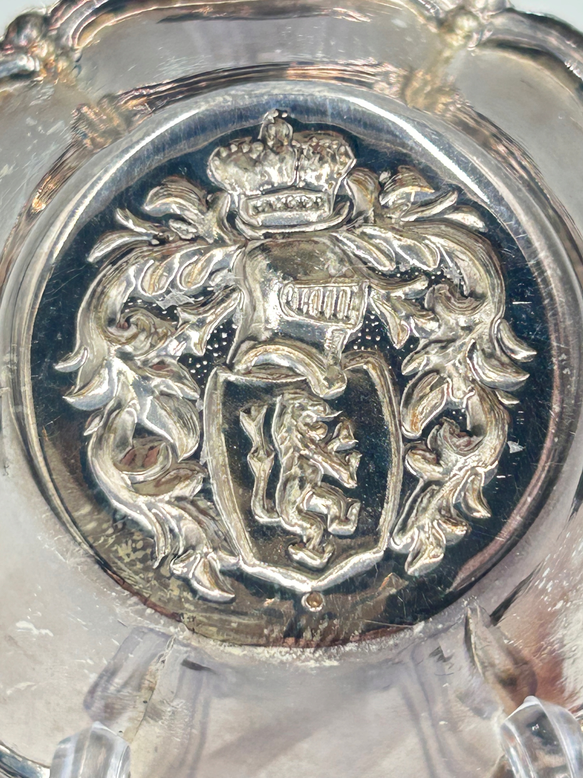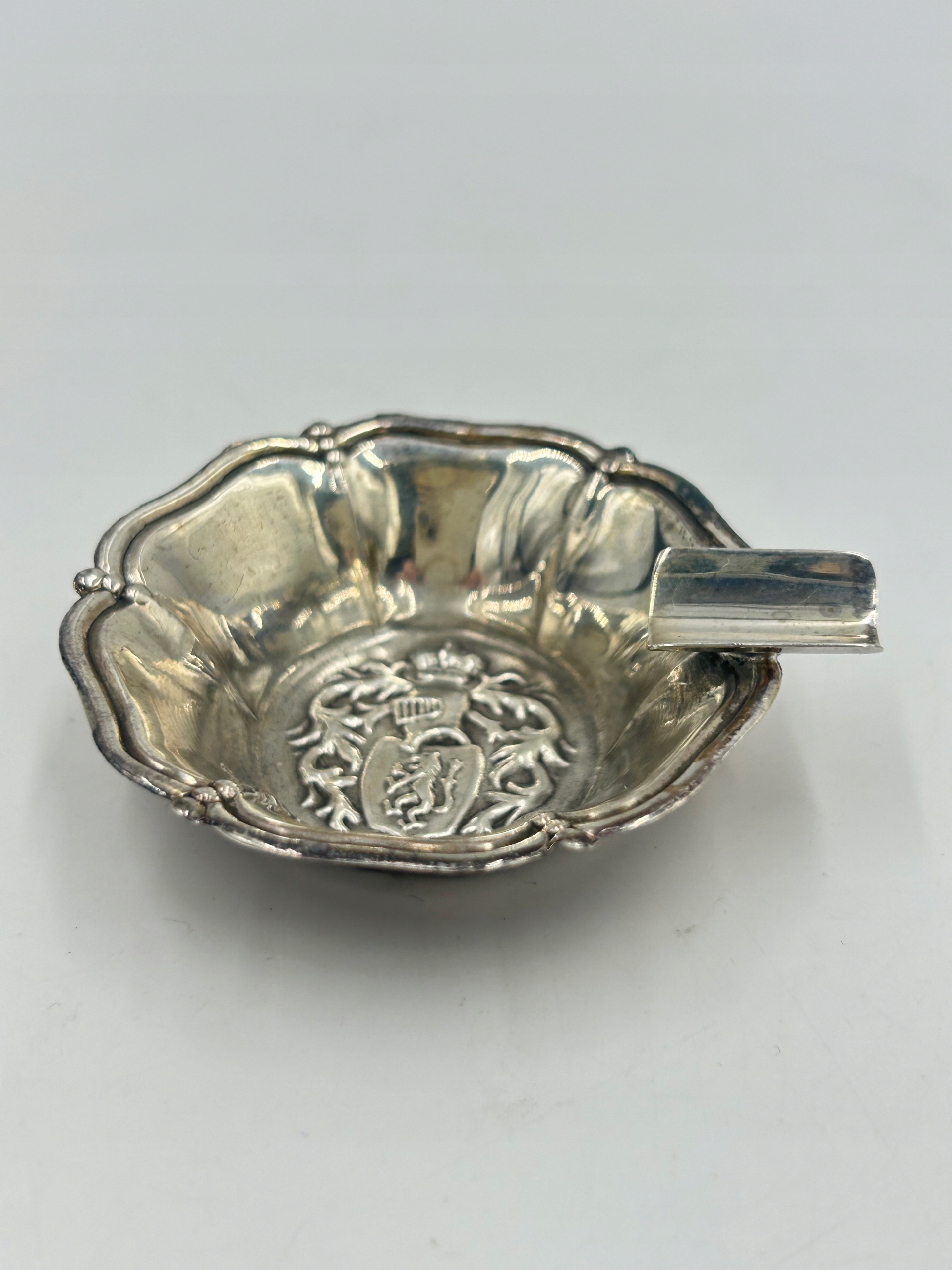 Элегантная пепельница из серебра 835 пробы, украшенная геральдическим рельефом с изображением льва в щите, рыцарского шлема и короны.