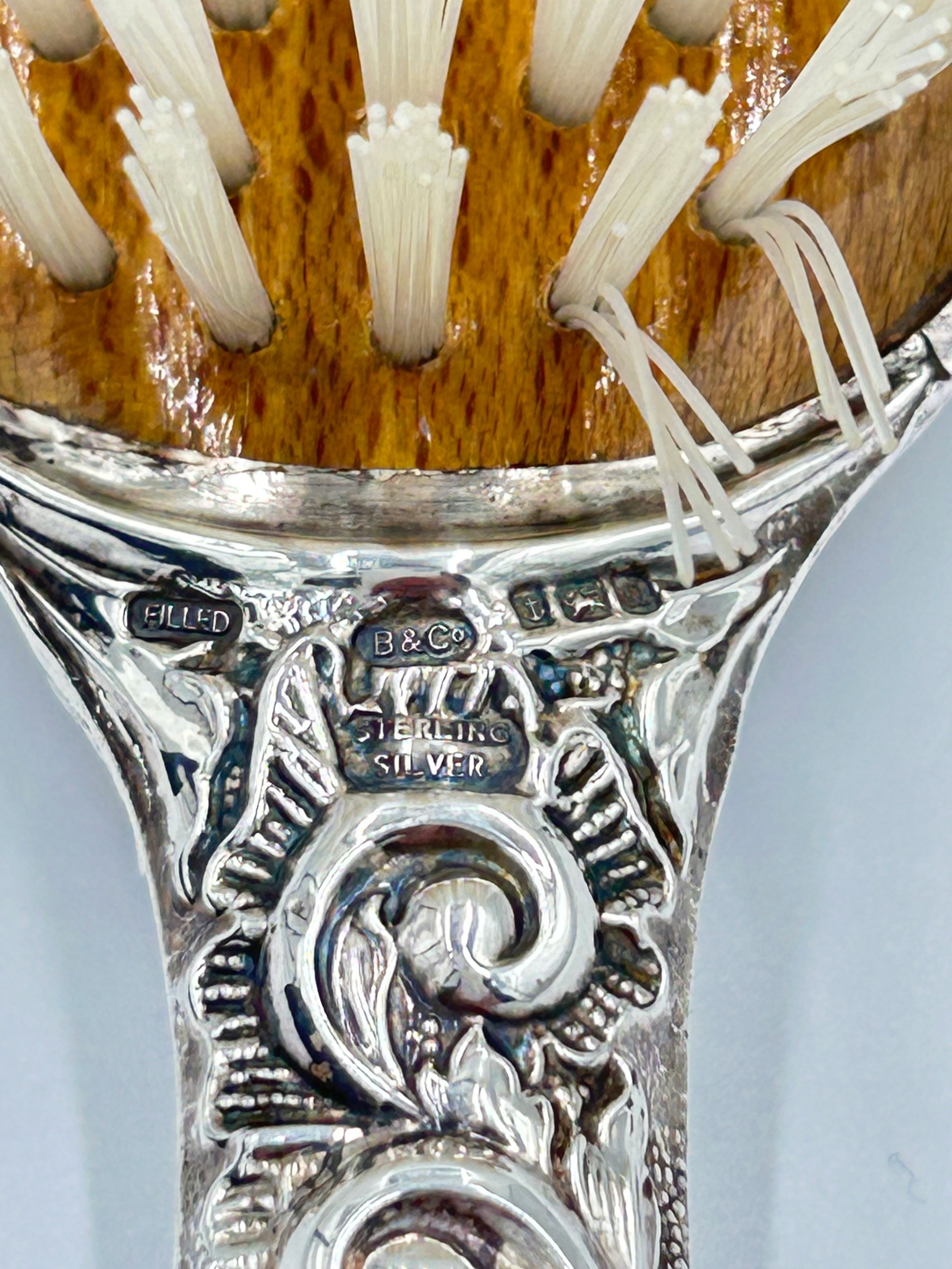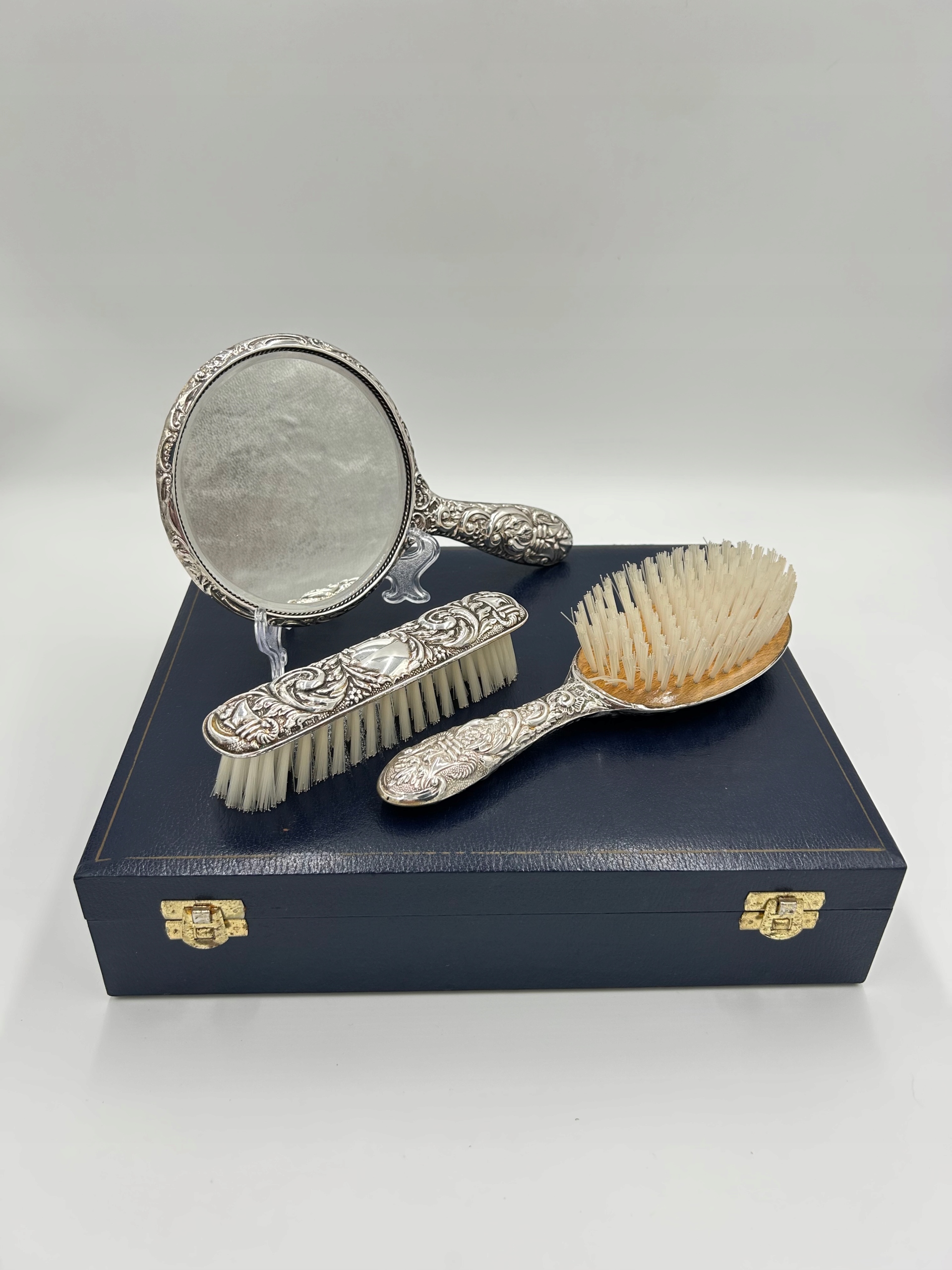 Тема продажи - элегантный набор туалетов, изготовленный в стиле Art Nouveau. Туалетный набор состоит из кисти, зеркало на ручке, щетки гардероба - 925 Серебряный светильник. Набор, изготовленный с высокой точностью и обслуживанием деталей. Красивый и редкий набор, я рекомендую обогатить вашу собственную коллекцию. Копия ценного коллекционера.