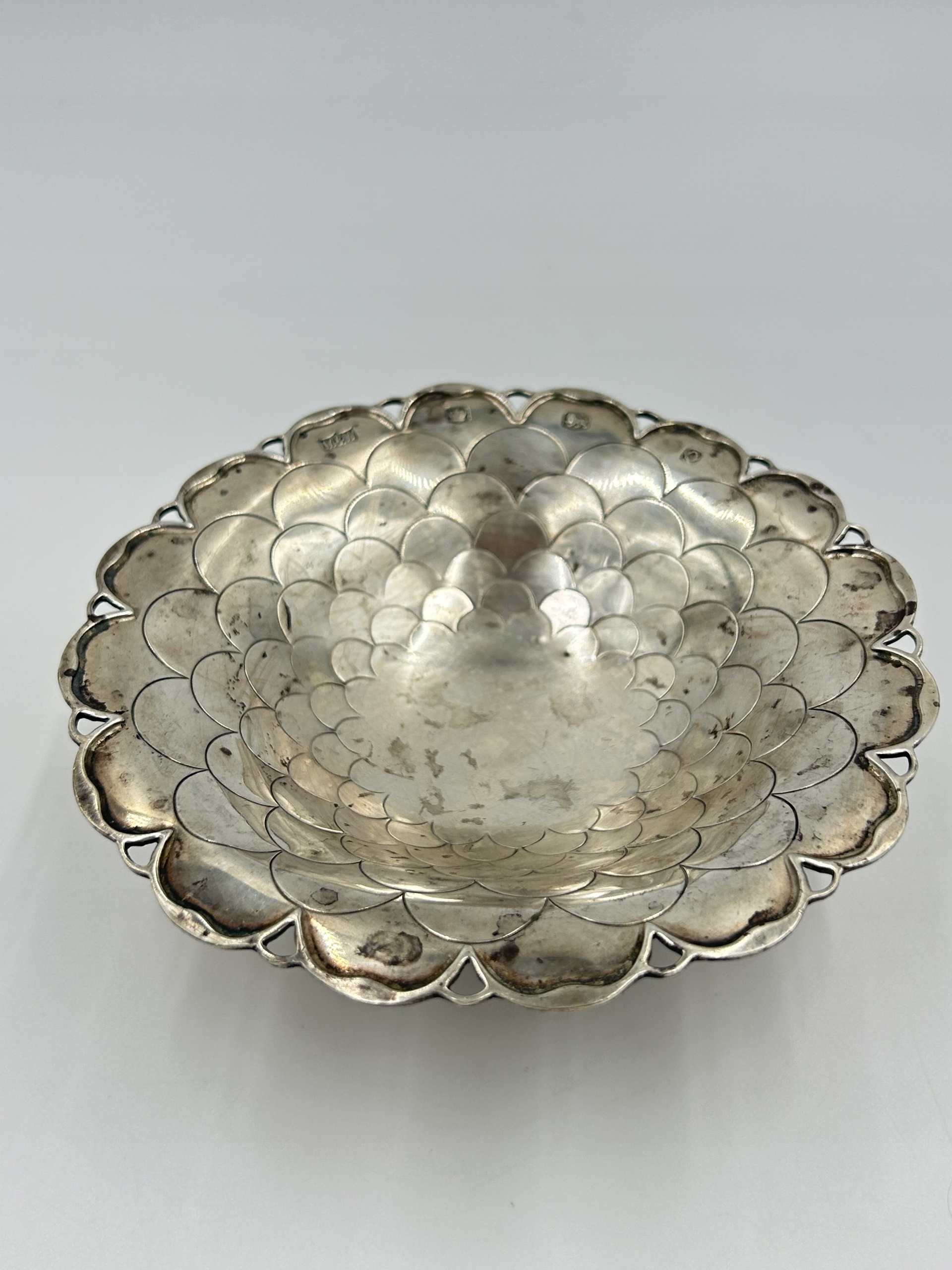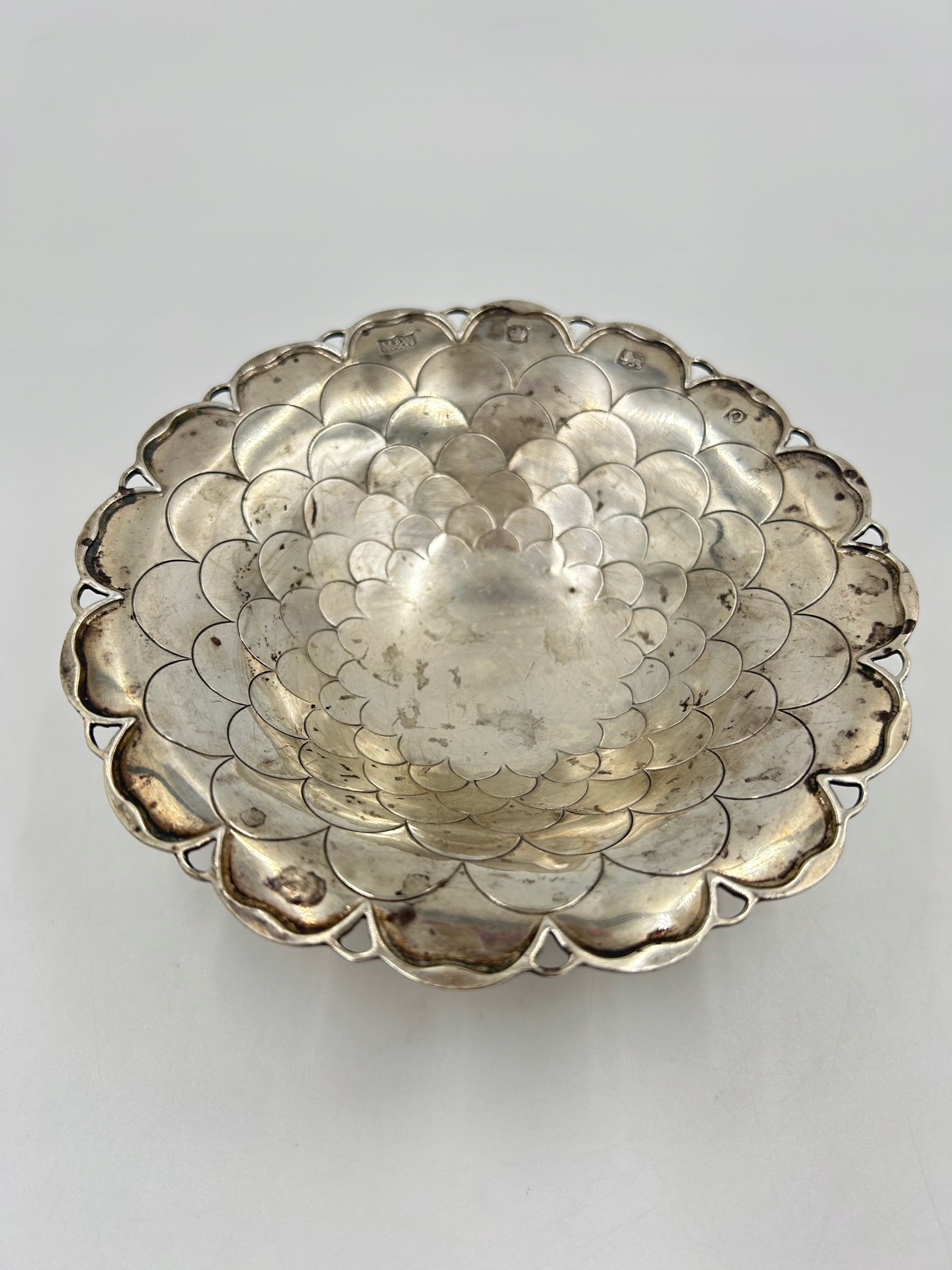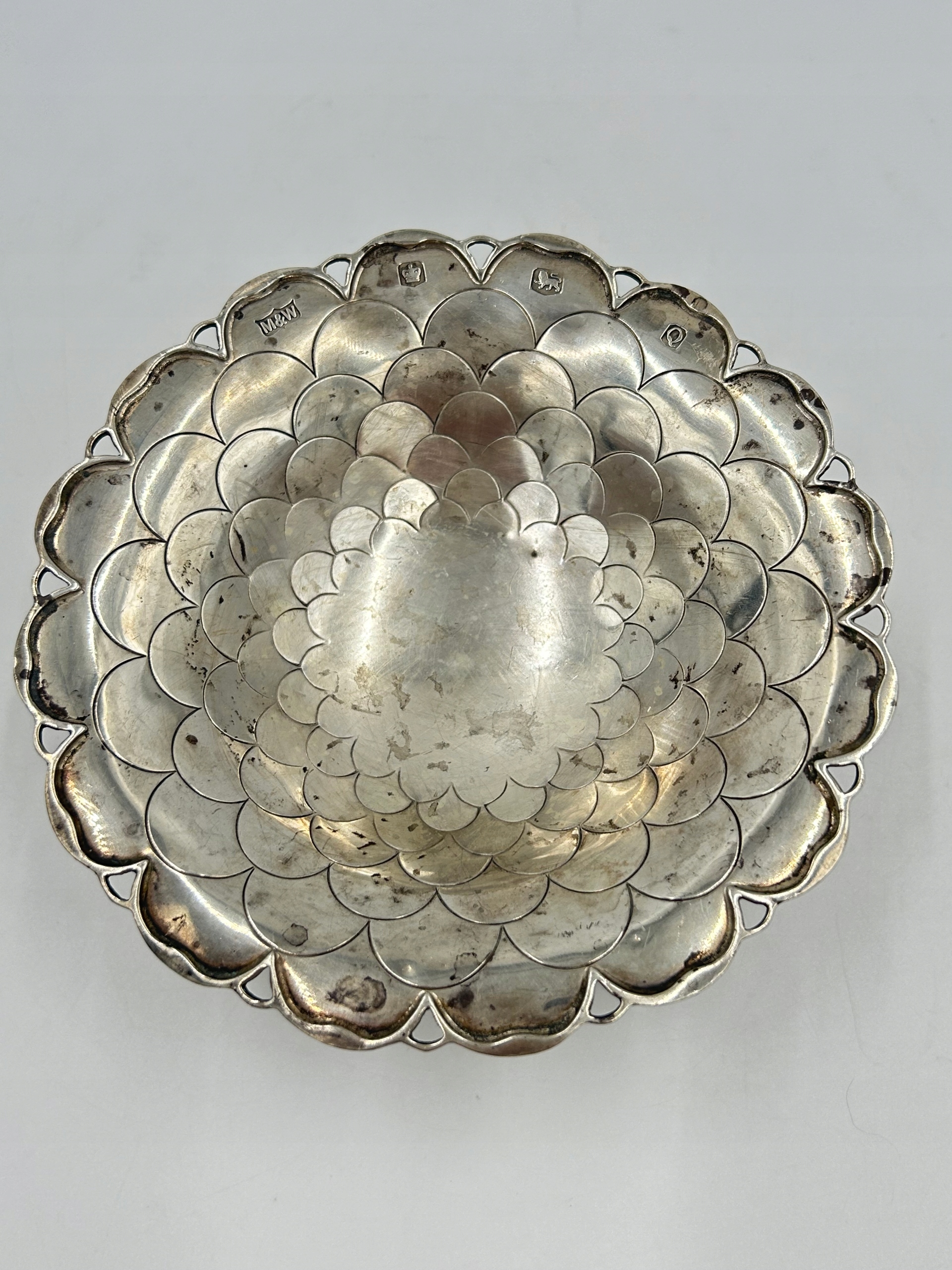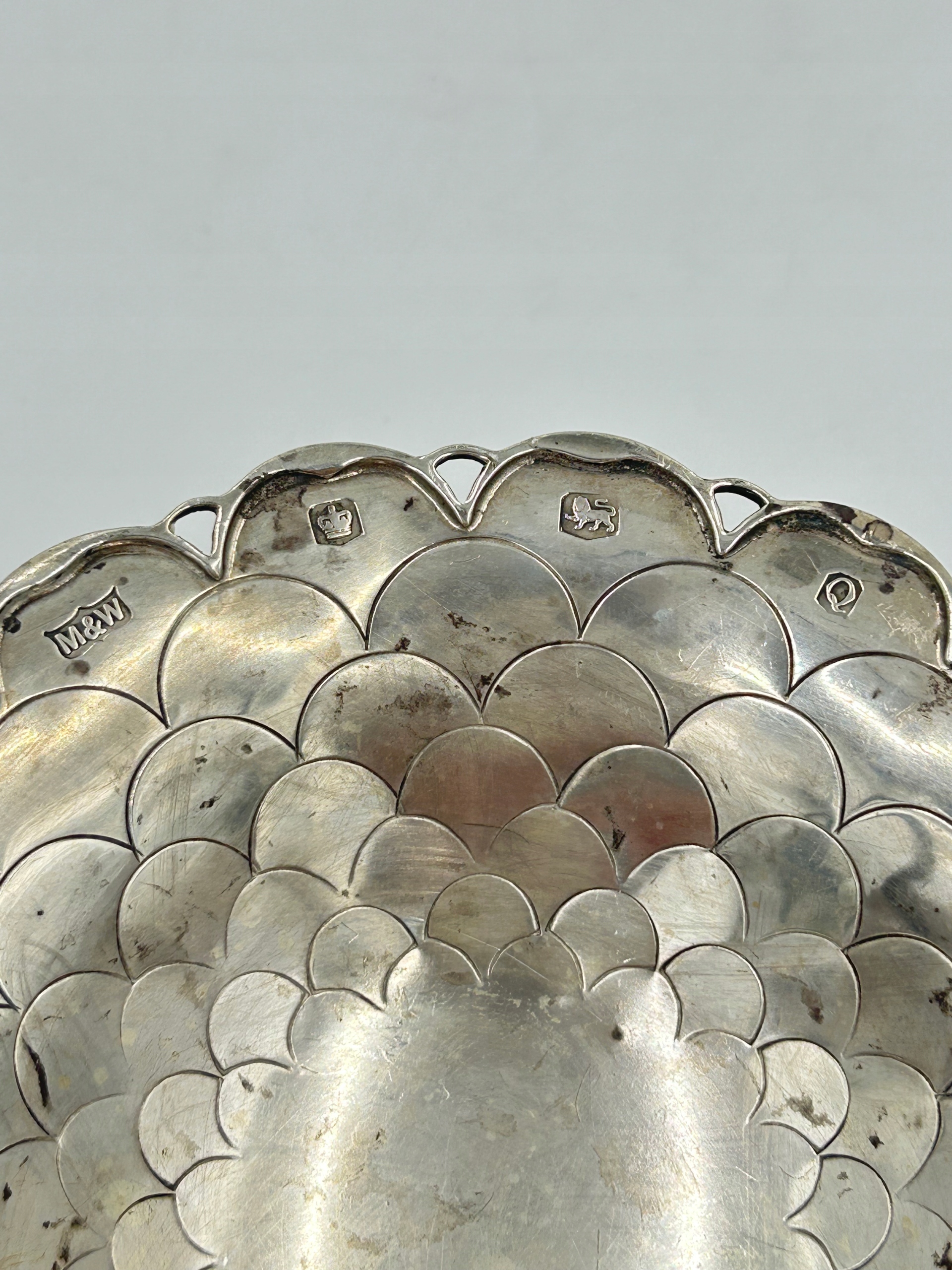 Предмет продажи - феноменальная подставка для торта - корзинка округлой формы, на ножке, украшенная рыбьей чешуей. Серебро 925 пробы. Mappin & Webb, ШЕФФИЛД, 1958 год. Редкая вещь. Рекомендую.