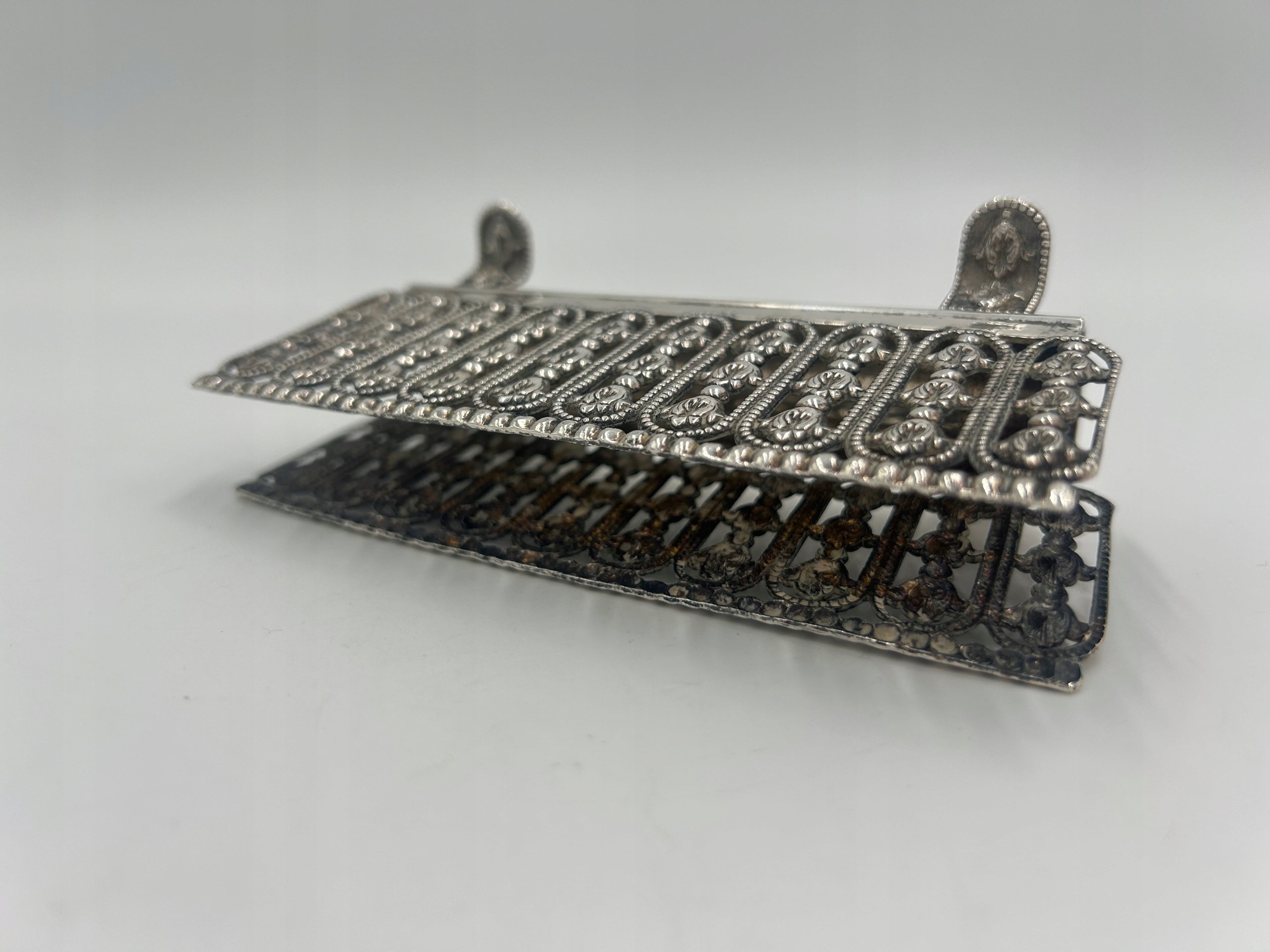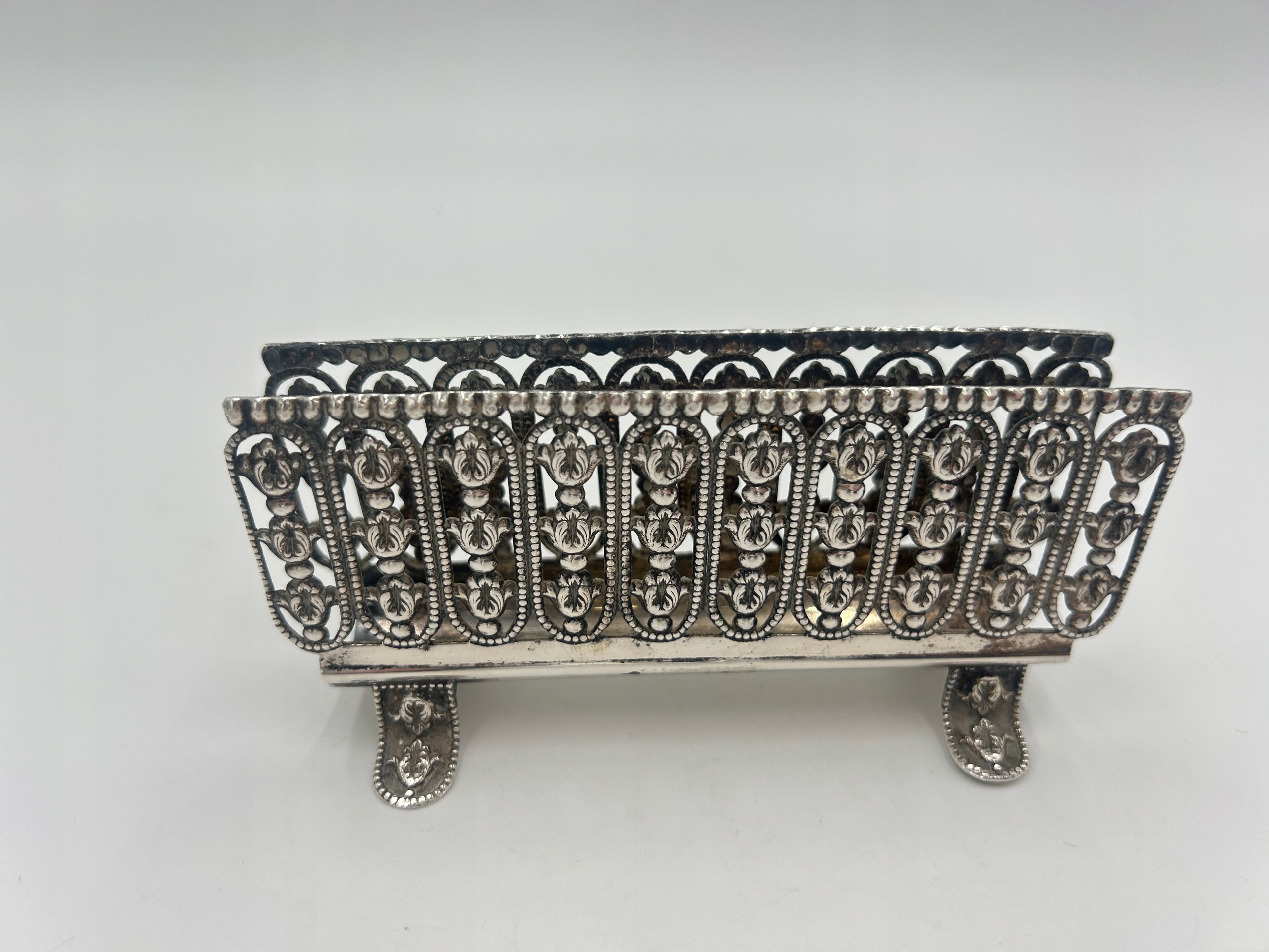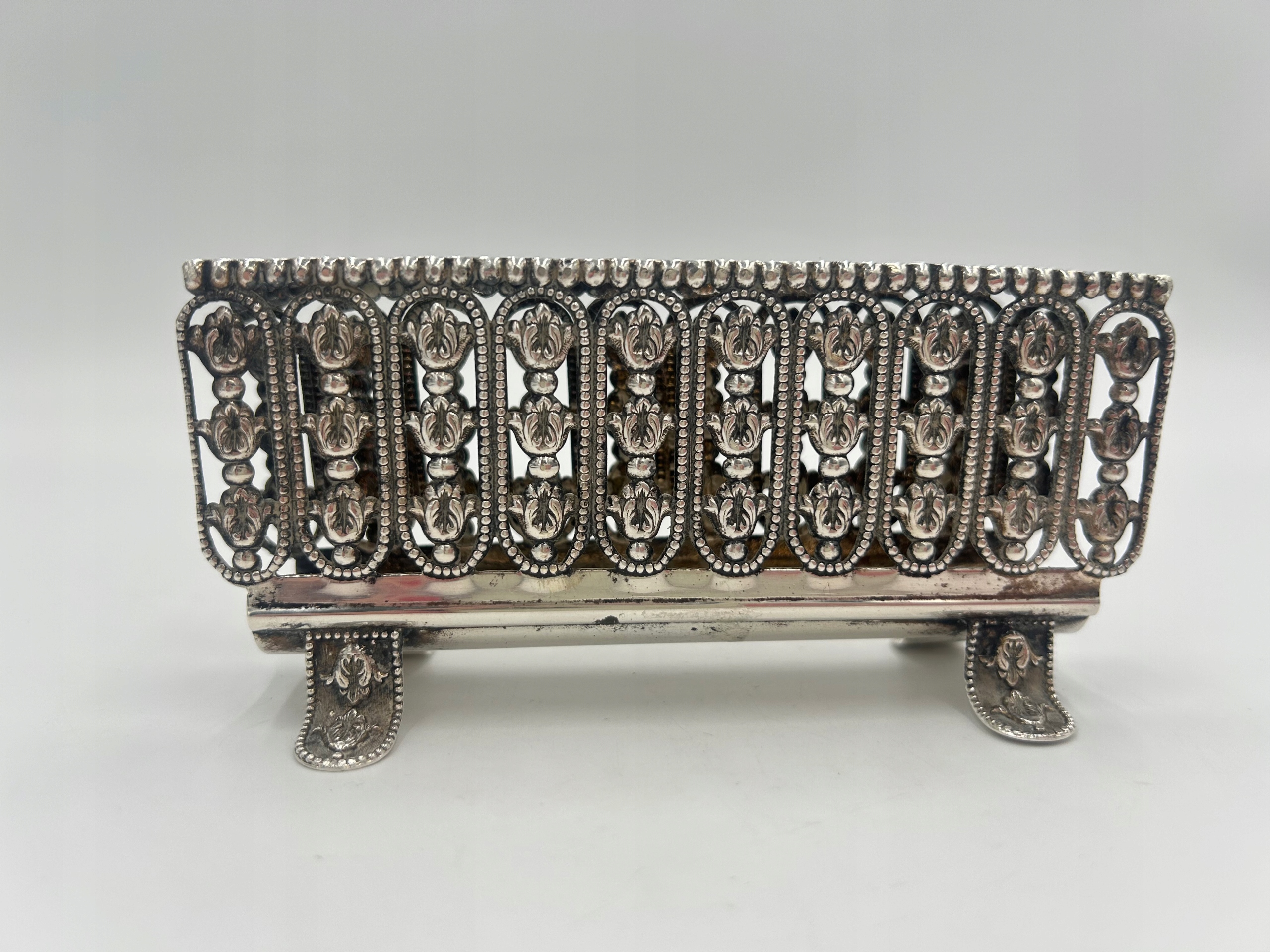 Продается элегантная, оригинальная подставка для писем или салфеток португальского бренда Topazio. Изготовлен из посеребренного металла (маркировка CASQUINHA), богато украшен цветочным мотивом и жемчугом в классическом стиле.