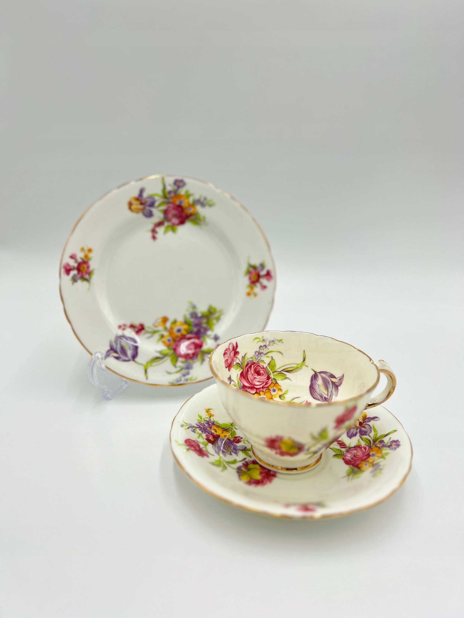 Представляю вам очаровательное трио от производства HM SUTHERLAND Bone China. Набор состоит из чашки, блюдца и десертной тарелки. Изготовлен из нежного фарфора, богато украшен цветочными элементами, края отделаны позолотой.