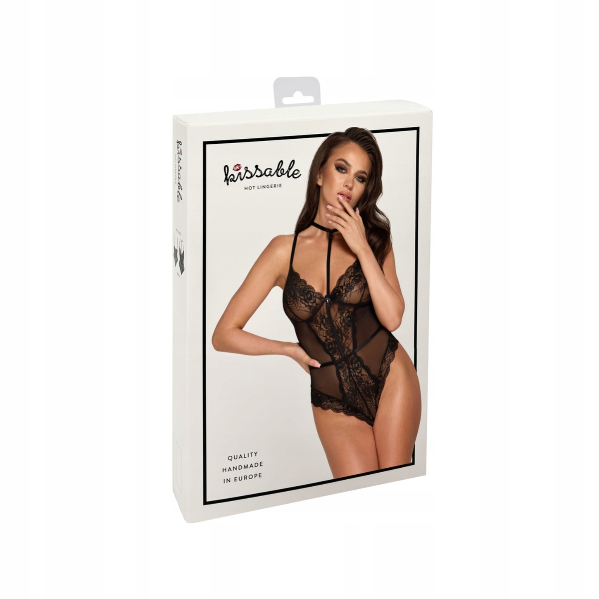 Боди восхищает глубоким вырезом, украшенным кружевом, и уникальным ремешком в виде колье, идущим от груди к шее. Это придает всему произведению изысканный и соблазнительный характер. Спина также привлекает внимание – глубокий вырез на талии и бедрах красиво подчеркивает эти женственные части тела, а тонкие кружевные детали добавляют загадочности и чувственного очарования.