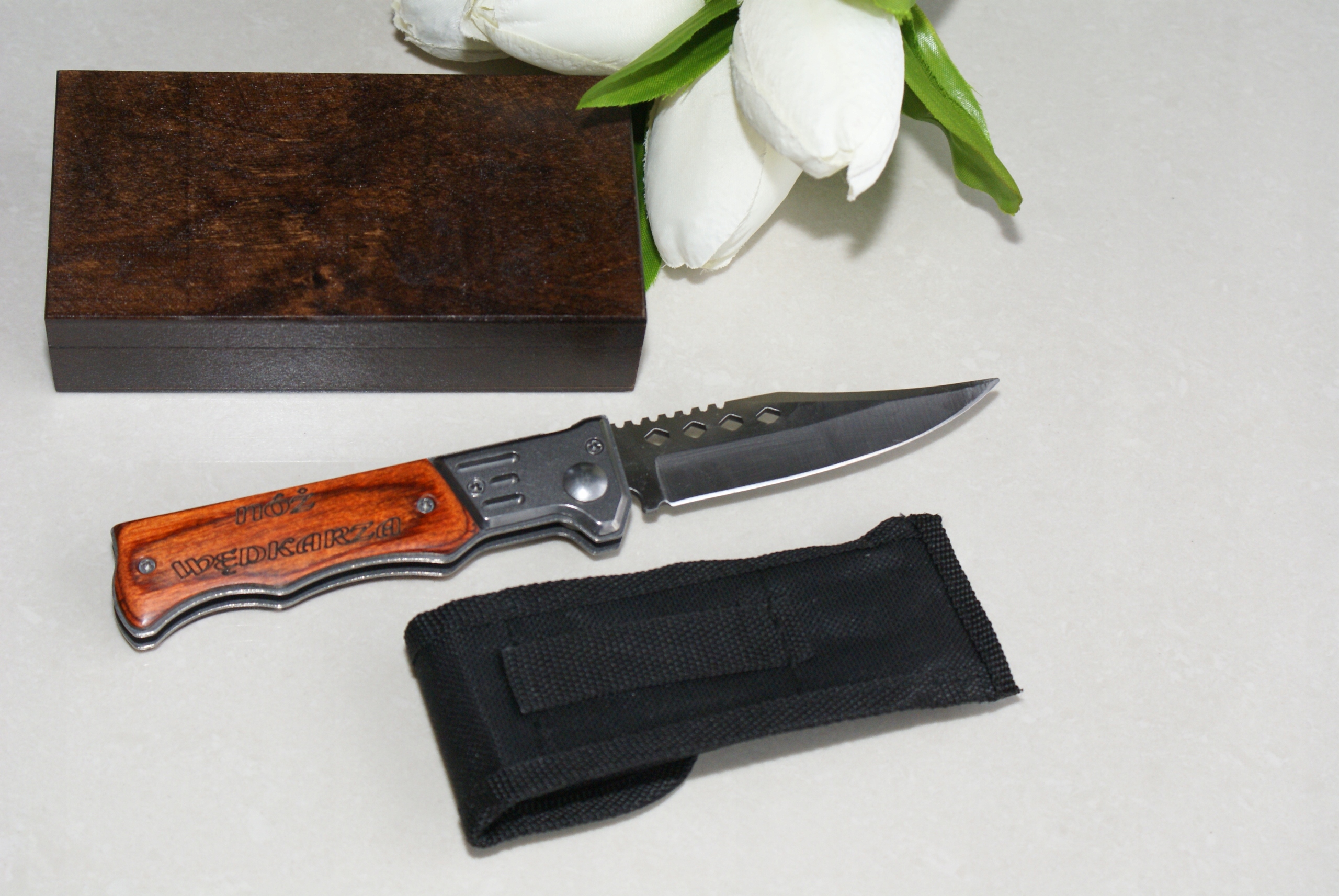 Предлагаю элегантный пружинный нож с вашей гравировкой в коричневой деревянной коробочке с гравировкой.