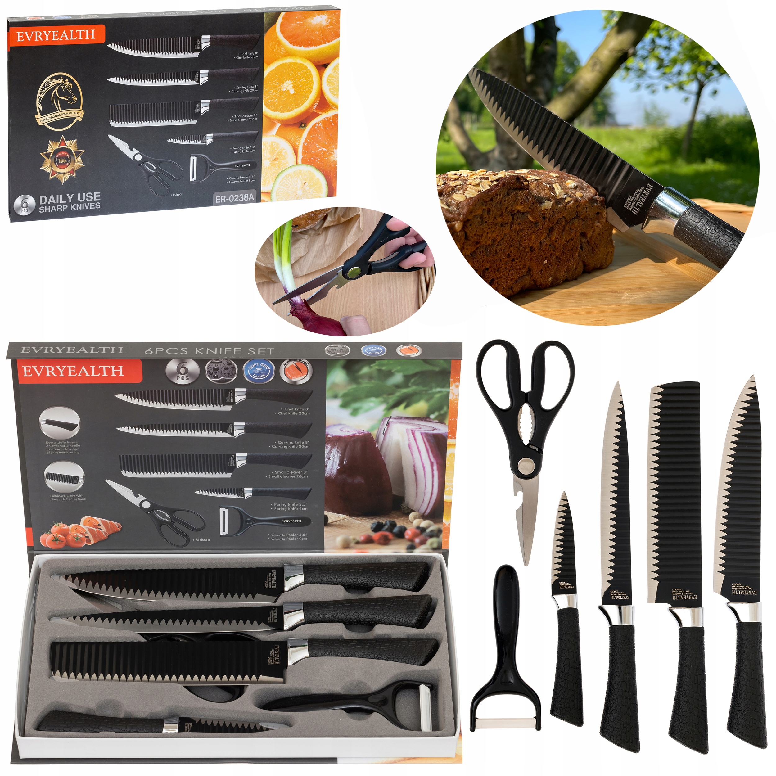 ✅Набор острых зубчатых кухонных ножей 6в1, ножницы, скребок